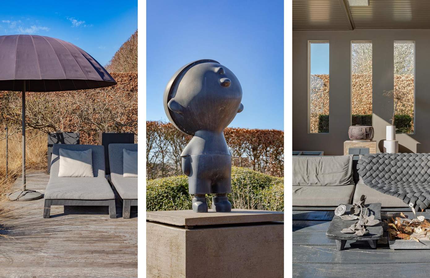 Het landschap rondom het huis is geen traditionele tuin, maar een zorgvuldig gecomponeerd geheel waarin architectuur en natuur volledig met elkaar verweven zijn.