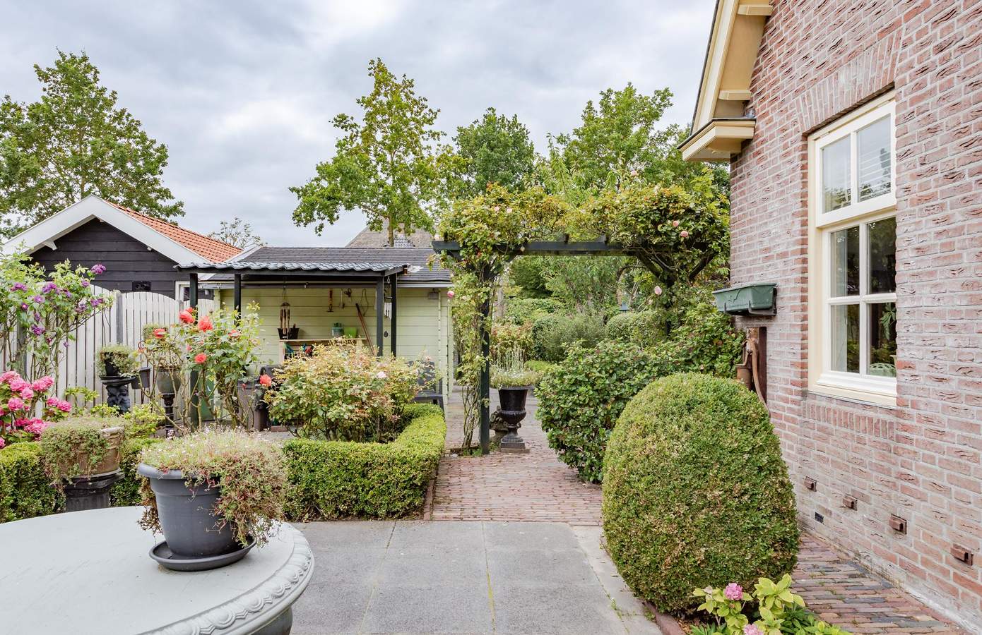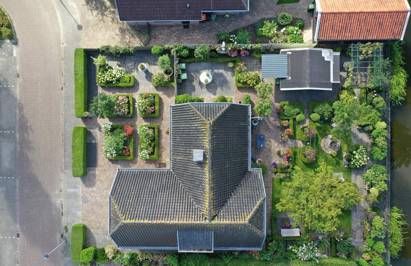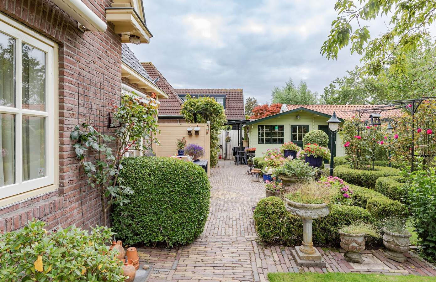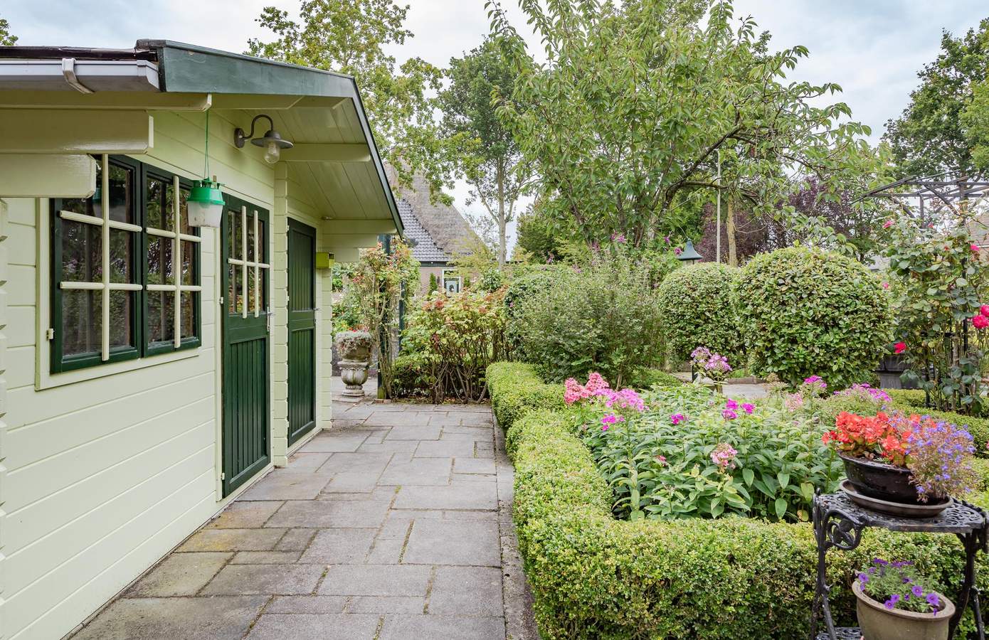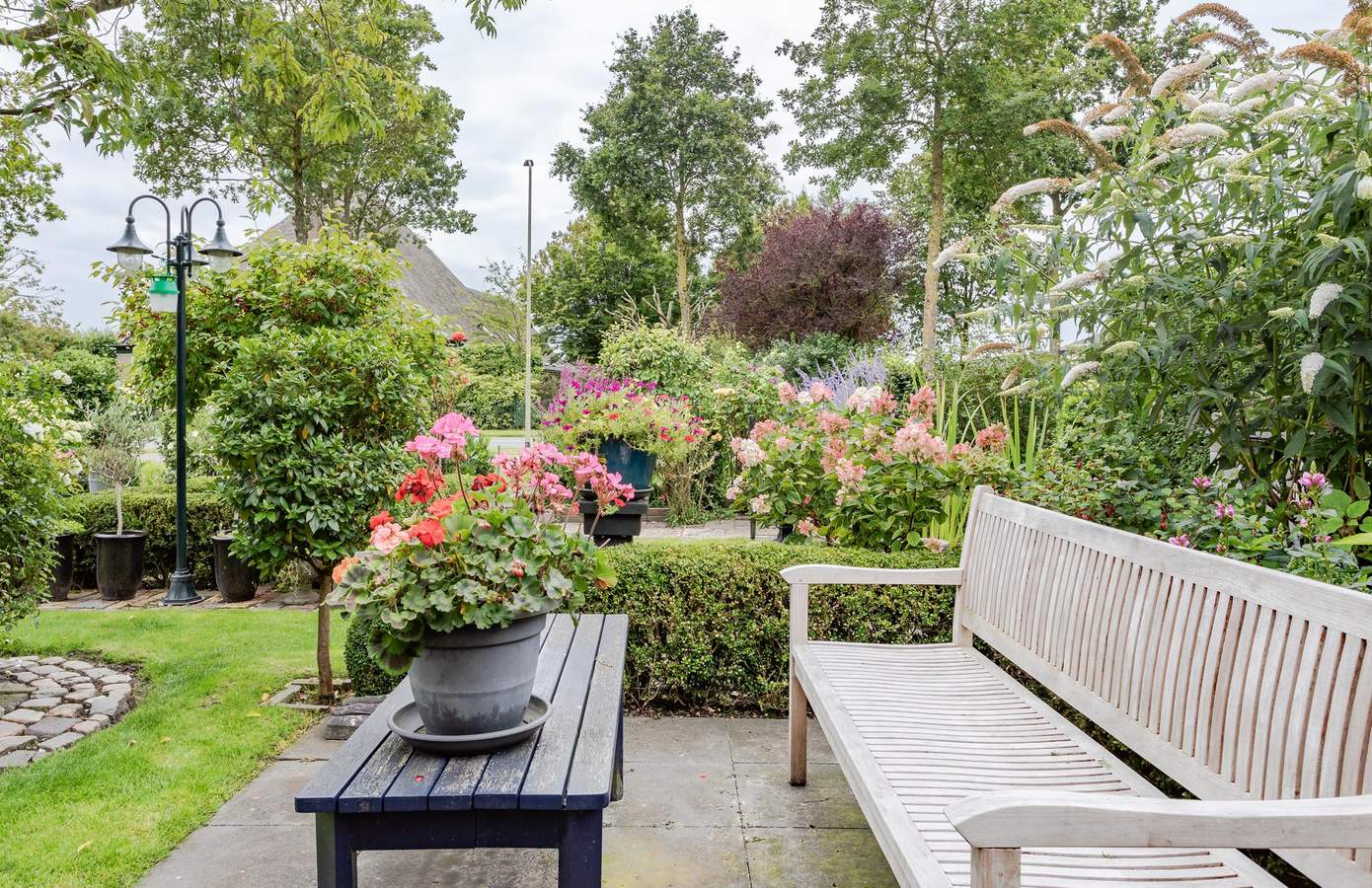 De woning wordt omgeven door een prachtig aangelegde tuin die zich uitstrekt rondom het hele huis. Deze tuin is gevuld met mooie bloemen, planten en bomen. De voortuin is bijzonder ruim en biedt voldoende mogelijkheid voor tuinliefhebbers om te ontspannen en te genieten van de rust. Via een poort in de voortuin betreedt u de achtertuin, gelegen aan het water. Hier heeft u een schitterend uitzicht over de omliggende landerijen en grazende koeien. De achtertuin is voorzien van een ruim tuinhuis met een klein aangebouwde overkapping, ideaal voor het opbergen van al uw tuingereedschap.