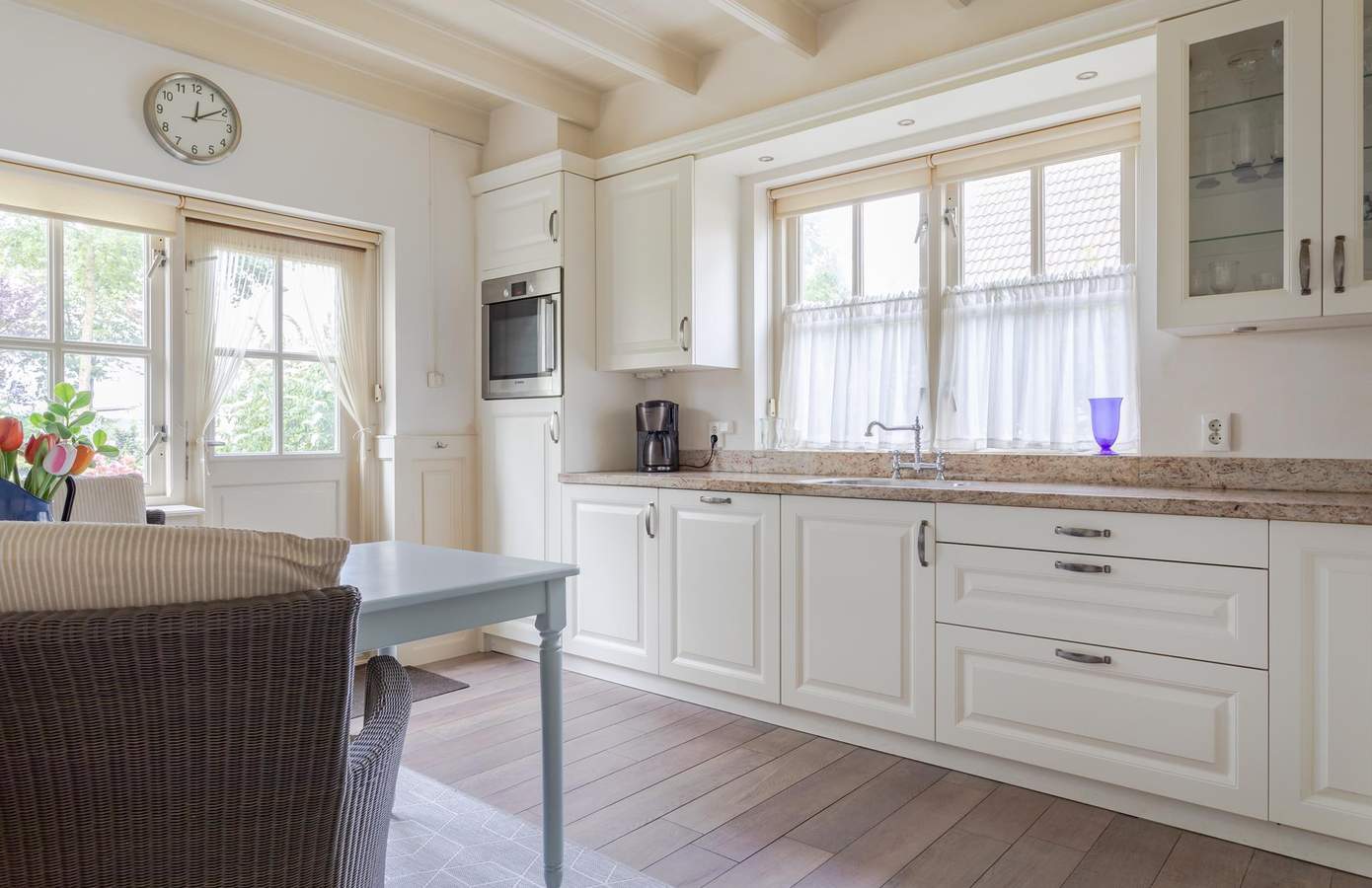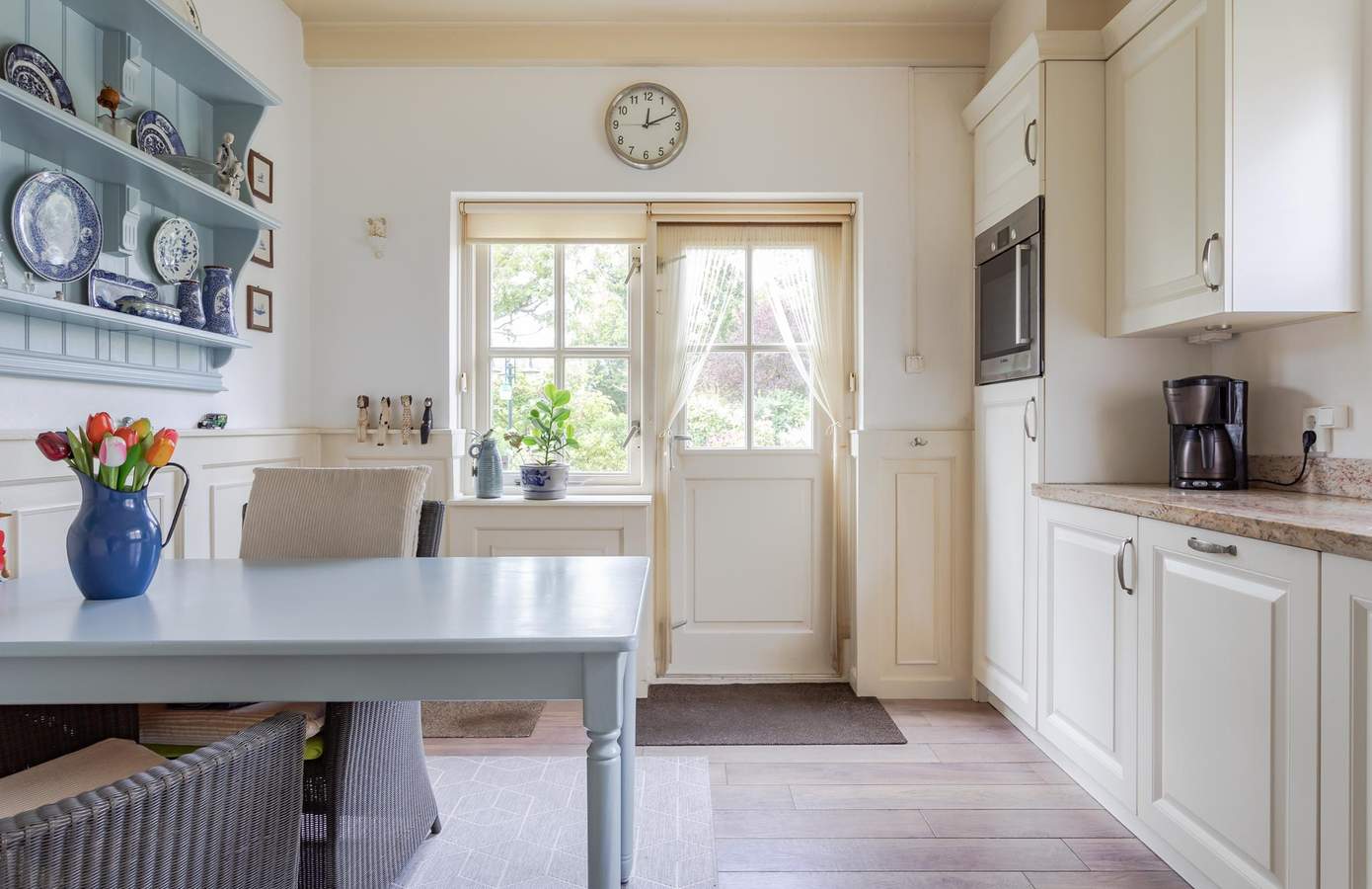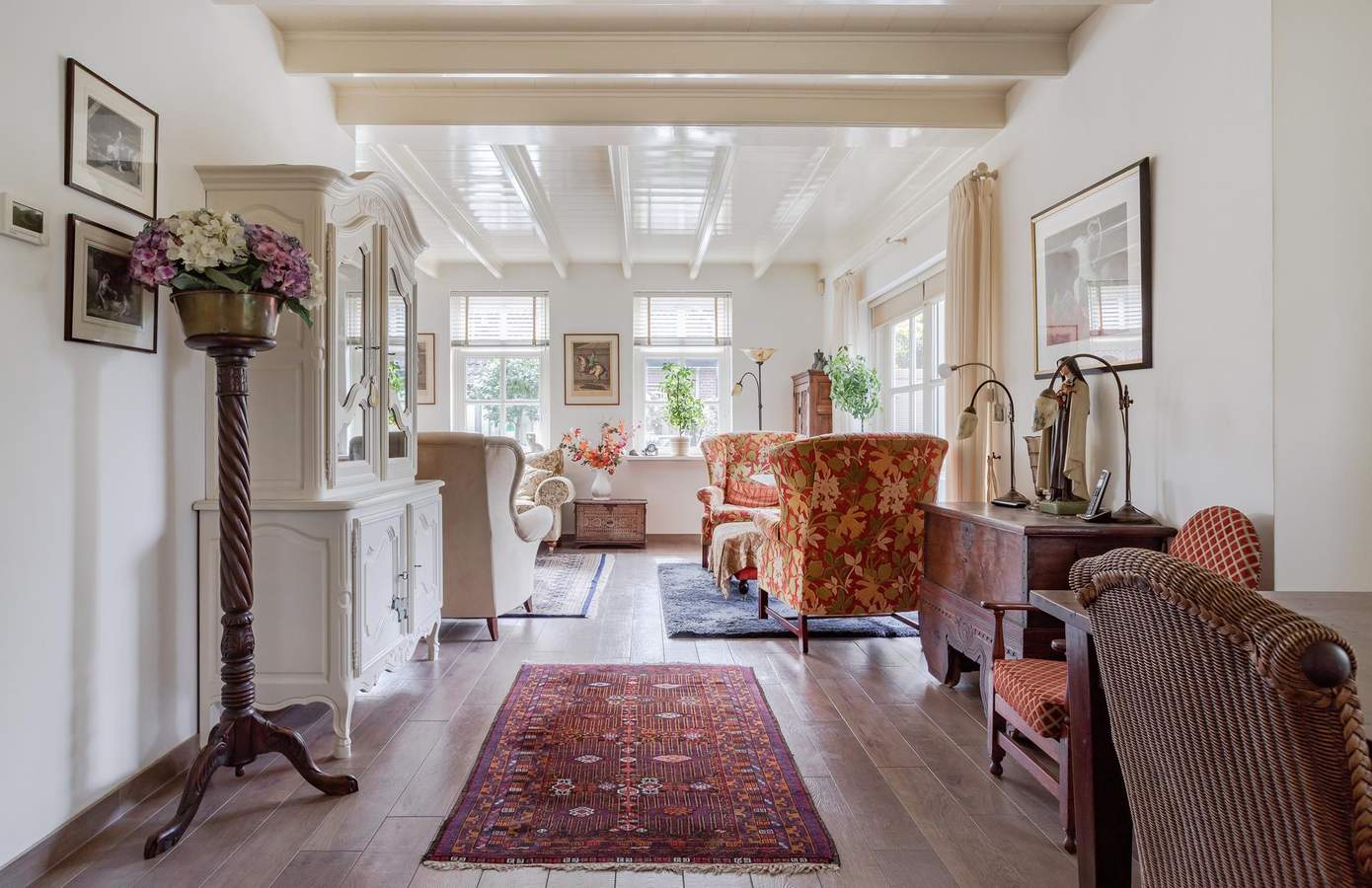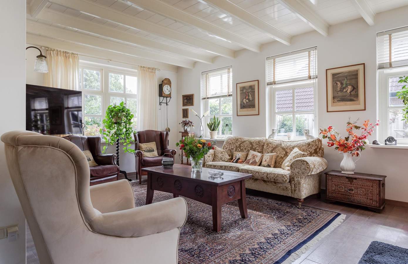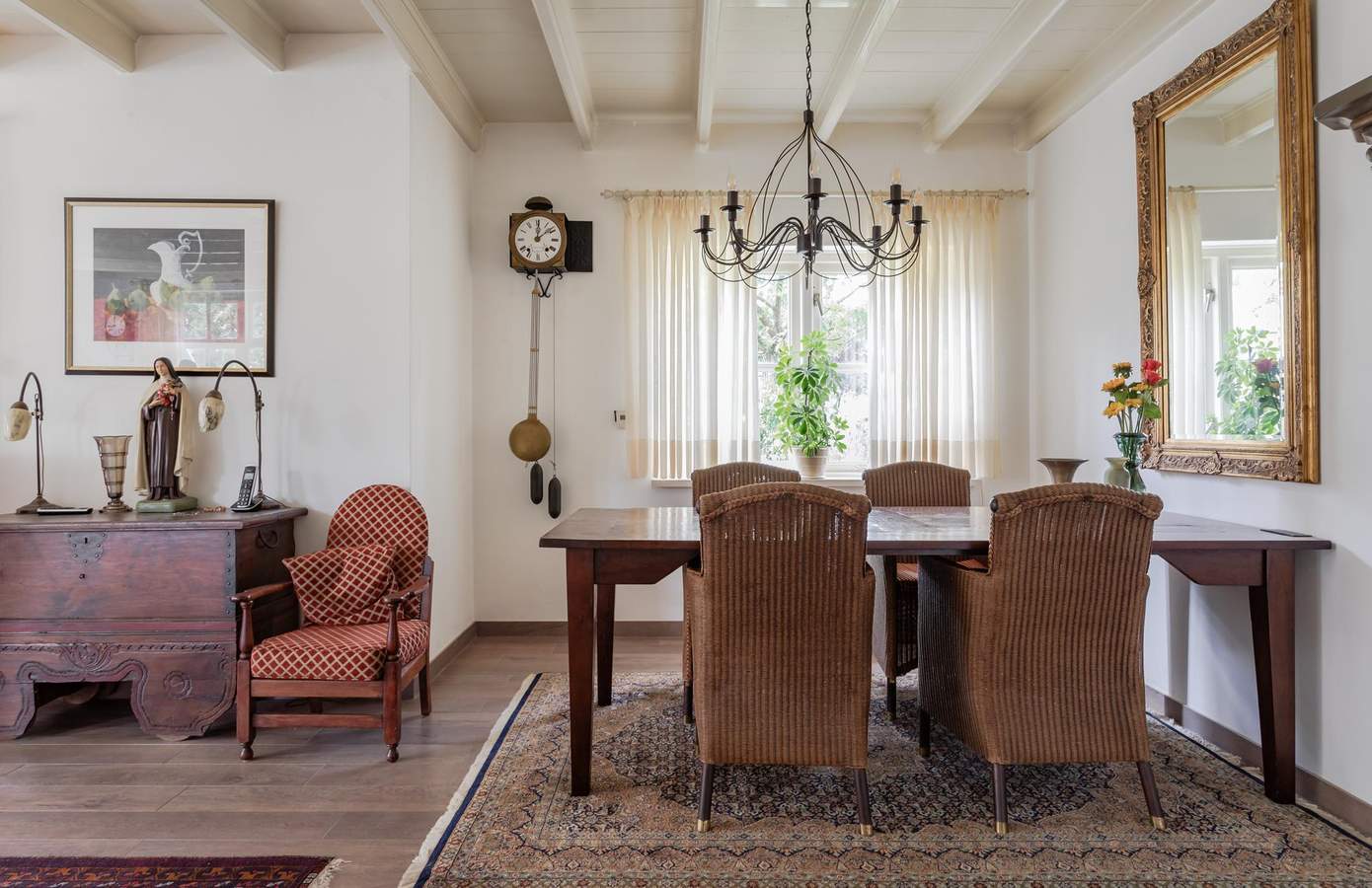 Bij deze woning kunt u op twee manieren binnenkomen: via de zij-ingang van de garage of rechtstreeks via de voordeur. Vanuit de laatste heeft u vanaf de hal direct toegang tot de woonkamer. Hier geven de klassieke ramen en het balkenplafond de ruimte een karaktervolle uitstraling. Via de woonkamer opent zich de grote schuifpui naar het terras, waar binnen en buiten naadloos in elkaar overgaan. Een open doorgang brengt u naar de keuken. Naast de keuken vindt u een handige bijkeuken met voldoende opbergruimte. Via de bijkeuken betreedt u de royale inpandige garage, goed geïsoleerd en voorzien van dubbele deuren aan beide zijden. Deze ruimte biedt diverse mogelijkheden, van kantoor aan huis tot een ruimte volledig ingericht op uw hobby. Op de eerste verdieping bevinden zich drie ruime slaapkamers, een kleinere slaapkamer, een moderne badkamer en via de overloop heeft u toegang tot de royale vliering.