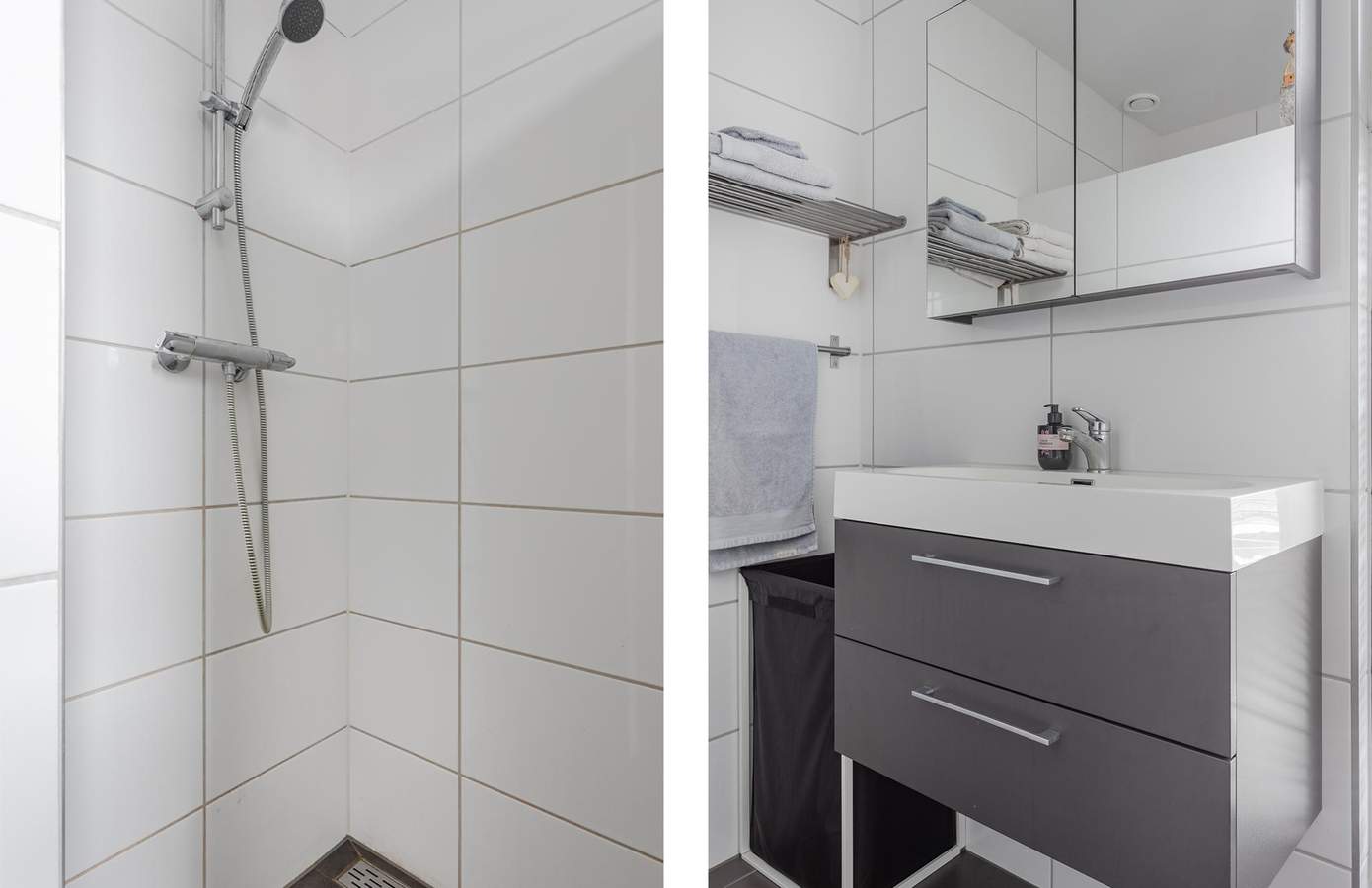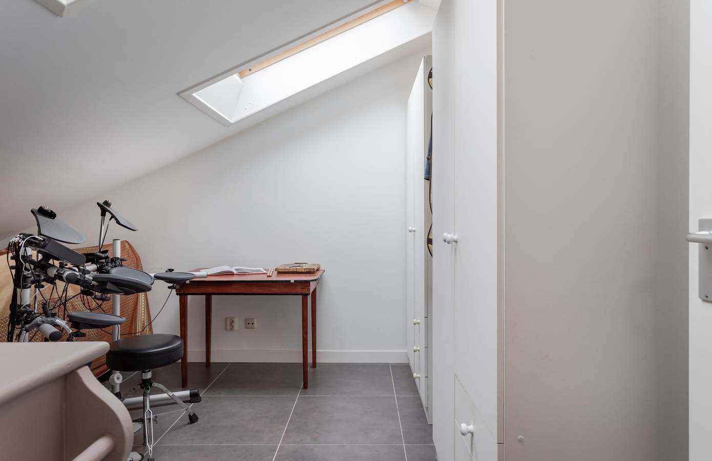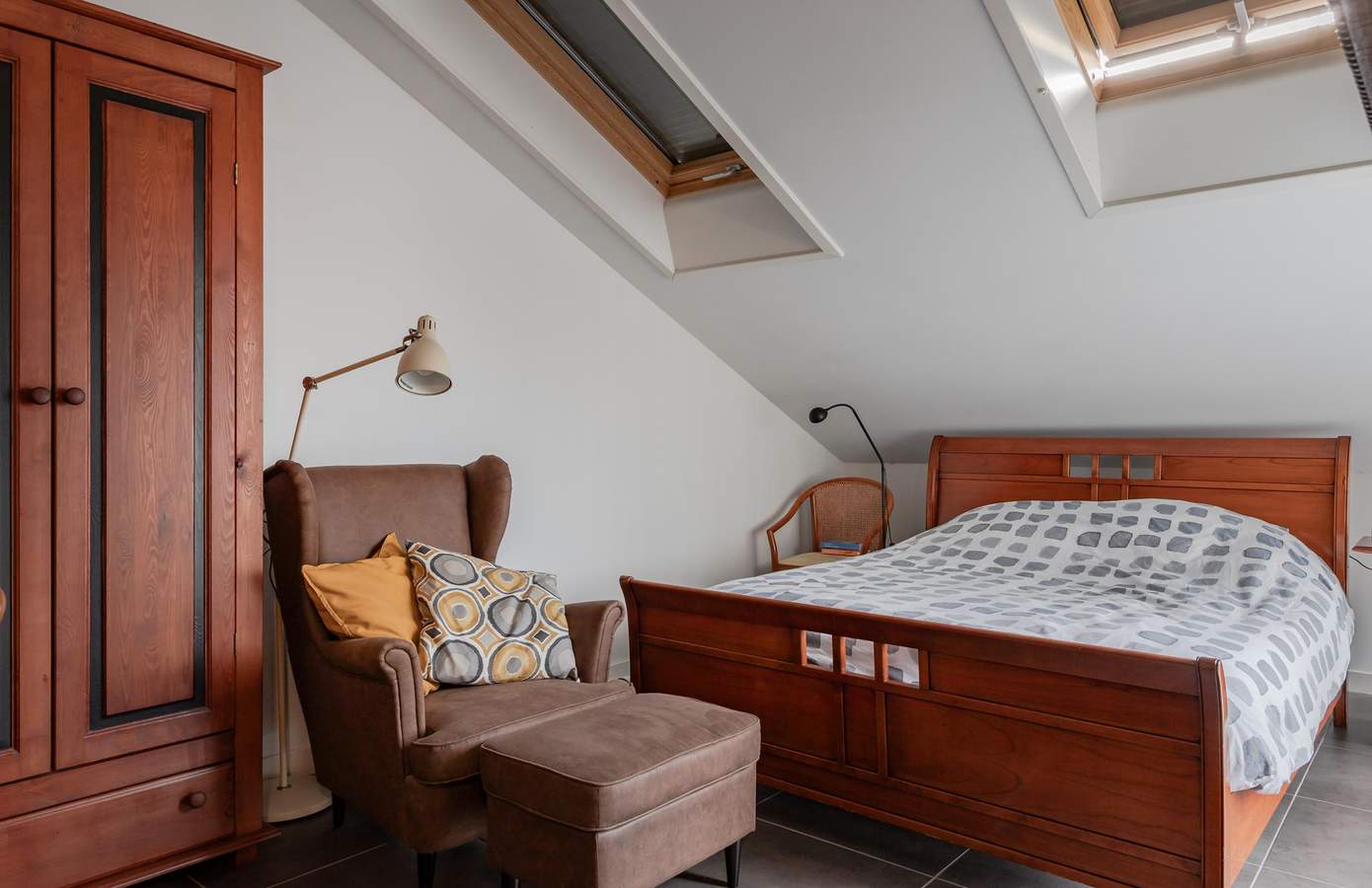 Vanuit de hal bereikt u twee slaapkamers. De hoofdslaapkamer, voorzien van twee grote dakramen, heeft toegang tot het balkon via een doorgang bij het rechter raamgedeelte. De badkamer beschikt over een ruime inloopdouche en een wastafel. Daarnaast bevindt zich in de gang een apart toilet en een handige ruimte speciaal ingericht voor uw wasmachine en droger. Bovendien is er vanuit de hal een toegang tot de vliering, wat extra opbergruimte biedt.