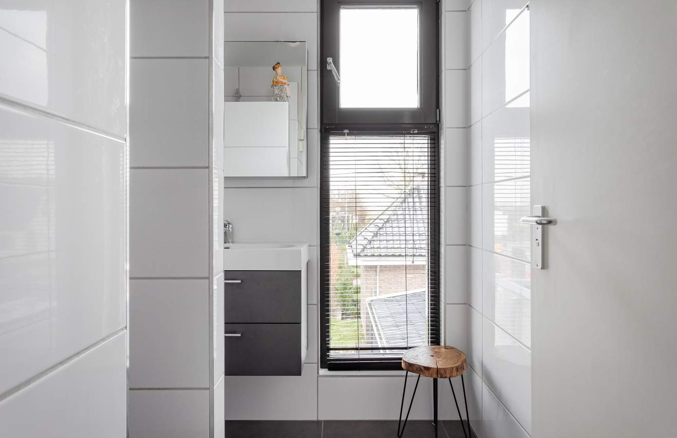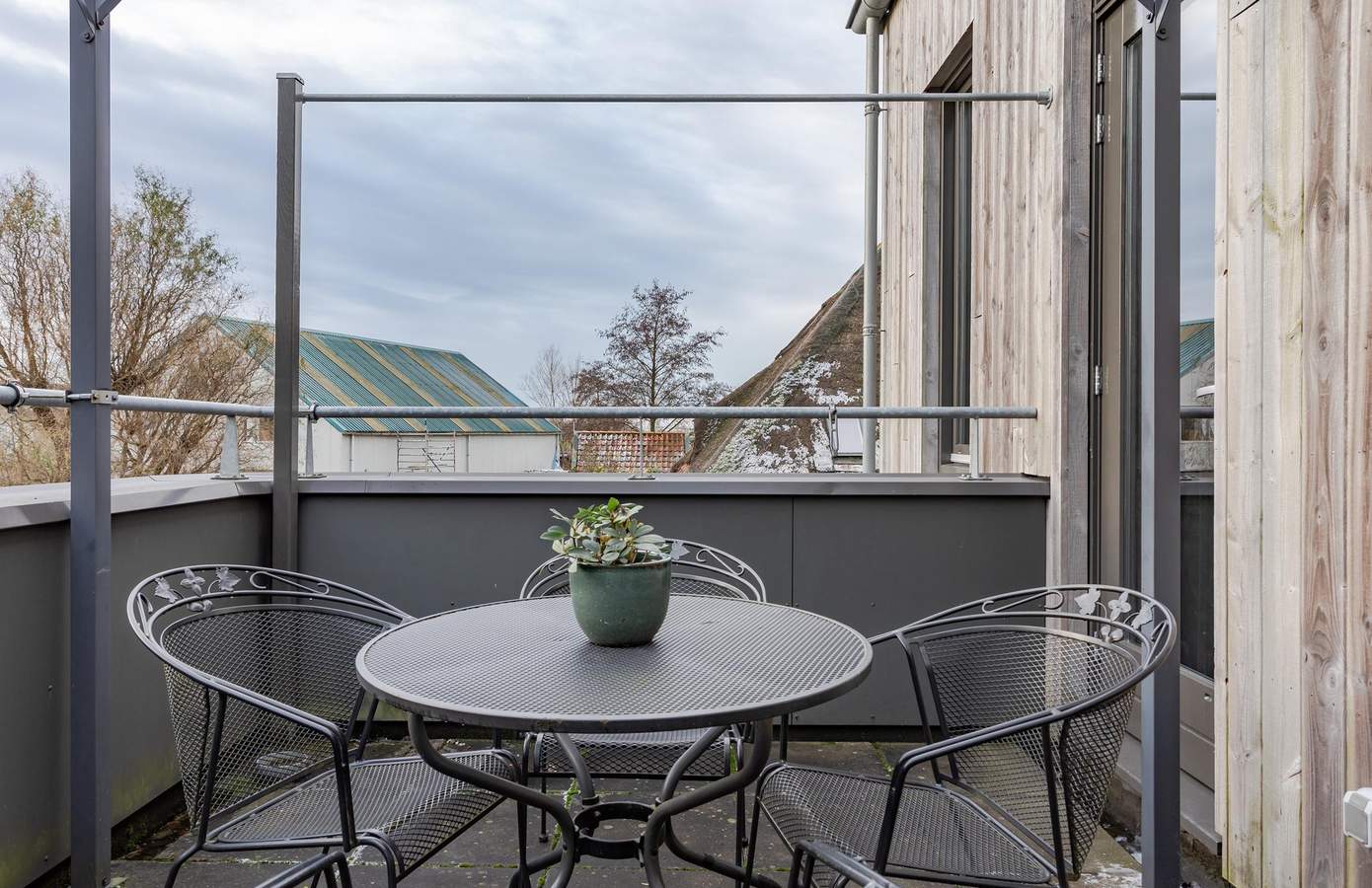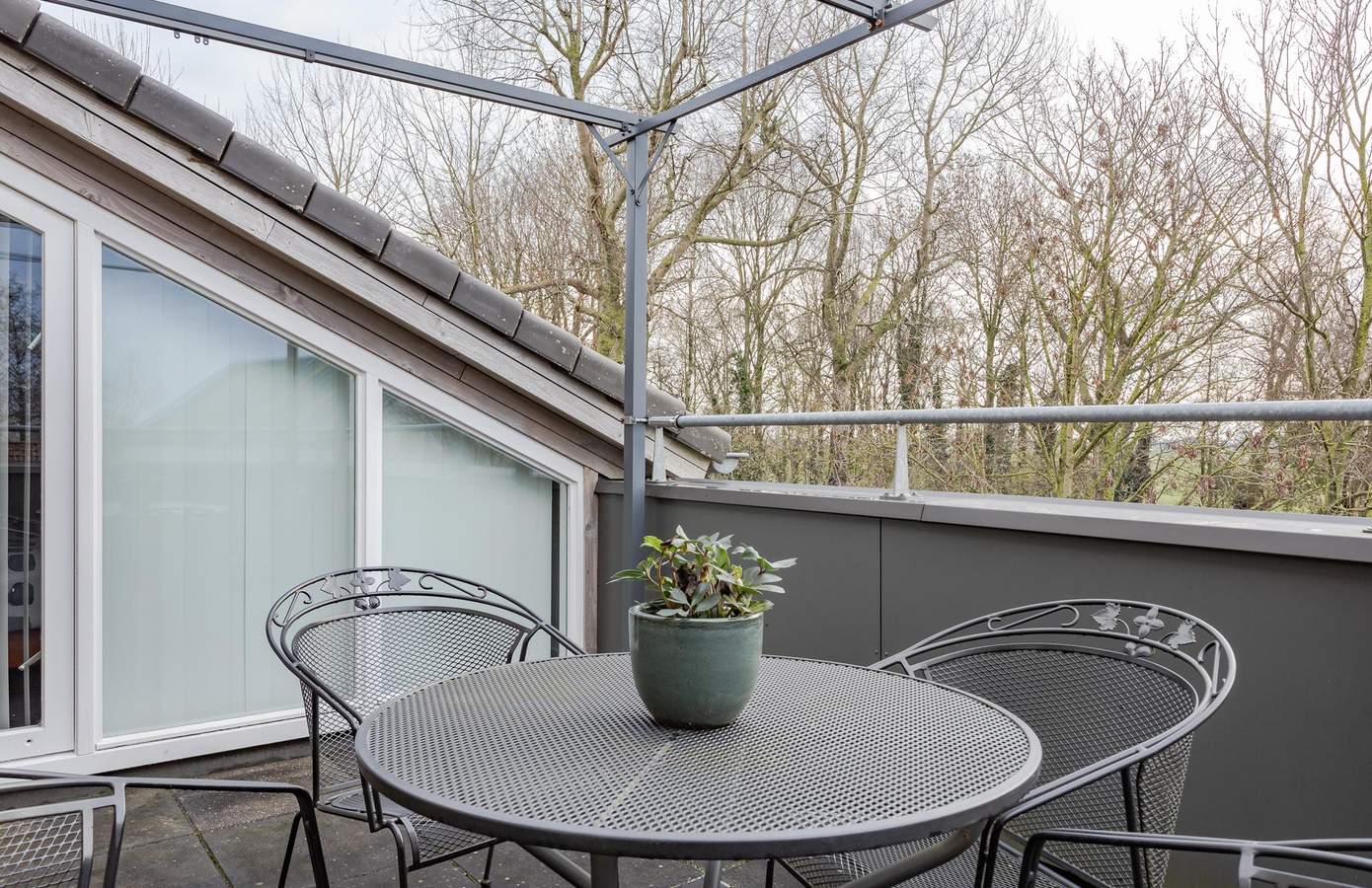 Vanuit de hal bereikt u twee slaapkamers. De hoofdslaapkamer, voorzien van twee grote dakramen, heeft toegang tot het balkon via een doorgang bij het rechter raamgedeelte. De badkamer beschikt over een ruime inloopdouche en een wastafel. Daarnaast bevindt zich in de gang een apart toilet en een handige ruimte speciaal ingericht voor uw wasmachine en droger. Bovendien is er vanuit de hal een toegang tot de vliering, wat extra opbergruimte biedt.