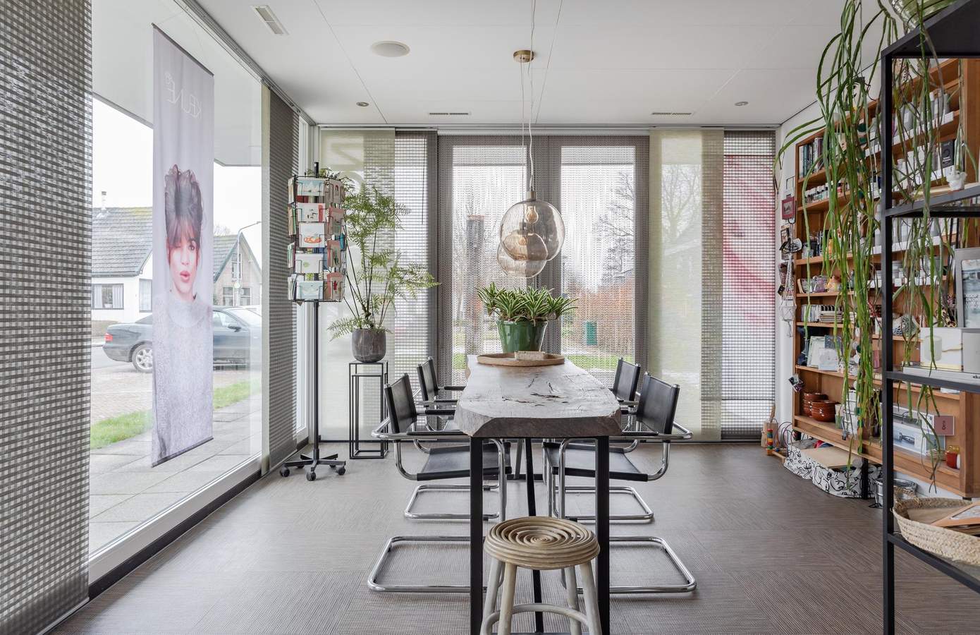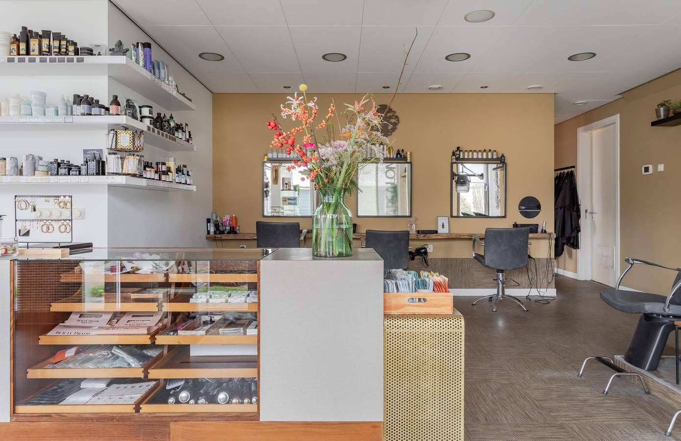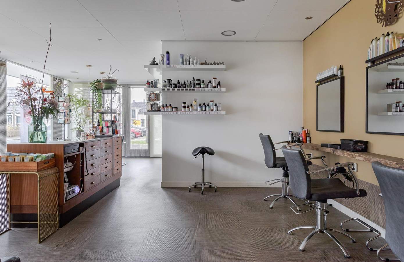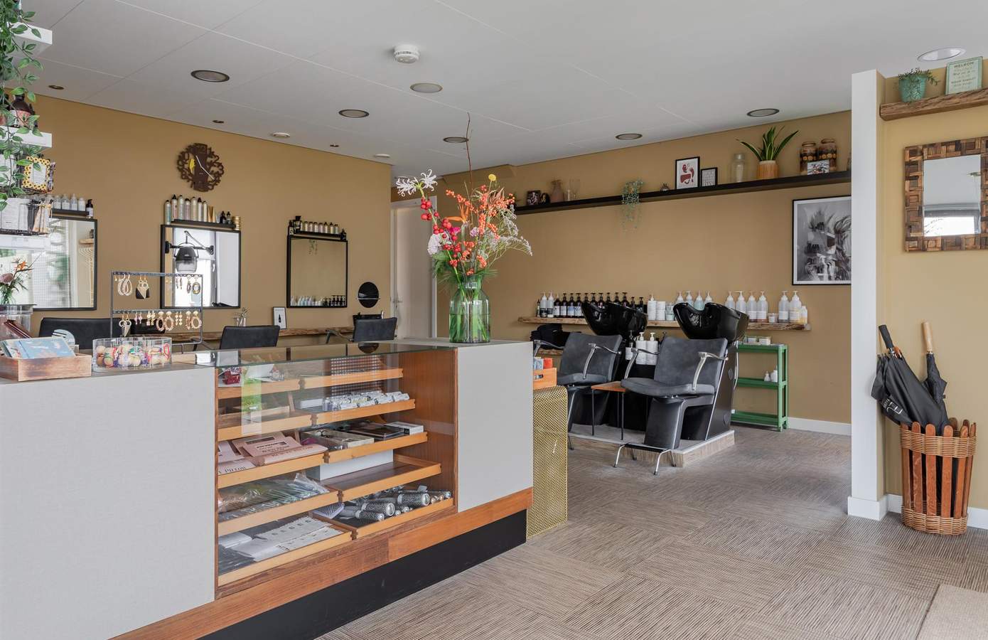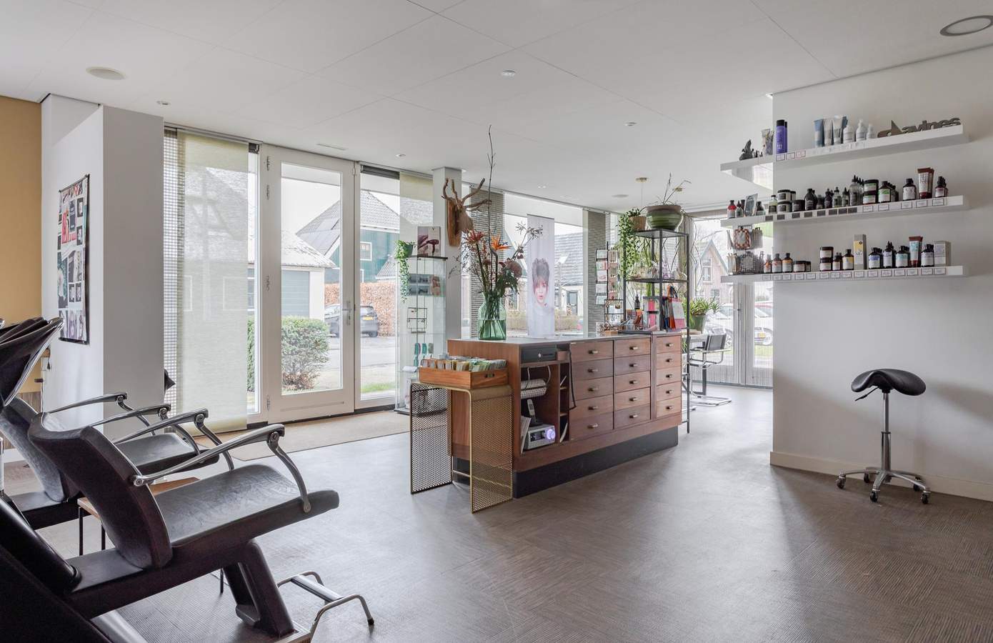 Met een oppervlakte van 77 m² en een aangrenzende garage van 22 m² biedt deze ruimte diverse mogelijkheden. Momenteel huisvest het een kapsalon, maar het staat open voor de vestiging van verschillende andere bedrijven. Bij binnenkomst via de hoofdingang komt u in een ruime, lichte ruimte terecht. De grote glazen pui aan de voor- en zijkant van het pand, voorzien van openslaande deuren aan de zijkant, zorgt voor een overvloed aan natuurlijk licht en een directe verbinding met buiten. De gehele ruimte is uitgerust met inbouwspots en wordt verwarmd door middel van luchtverwarming. Daarnaast beschikt het over een volledig geïntegreerd muzieksysteem. Vanuit de centrale ruimte heeft u inpandig toegang tot de garage met dubbele deuren, welke ideaal is voor extra opslagruimte of handig als aanvullende werkruimte. Verder leidt de centrale ruimte naar een apart toilet en twee afzonderlijke vertrekken, welke op dit moment beide zijn uitgerust met een keukenopstelling. De keuken aan de achterzijde is volledig uitgerust met een oven, kookplaat en koelkast, en biedt toegang tot een aangename buitenruimte.