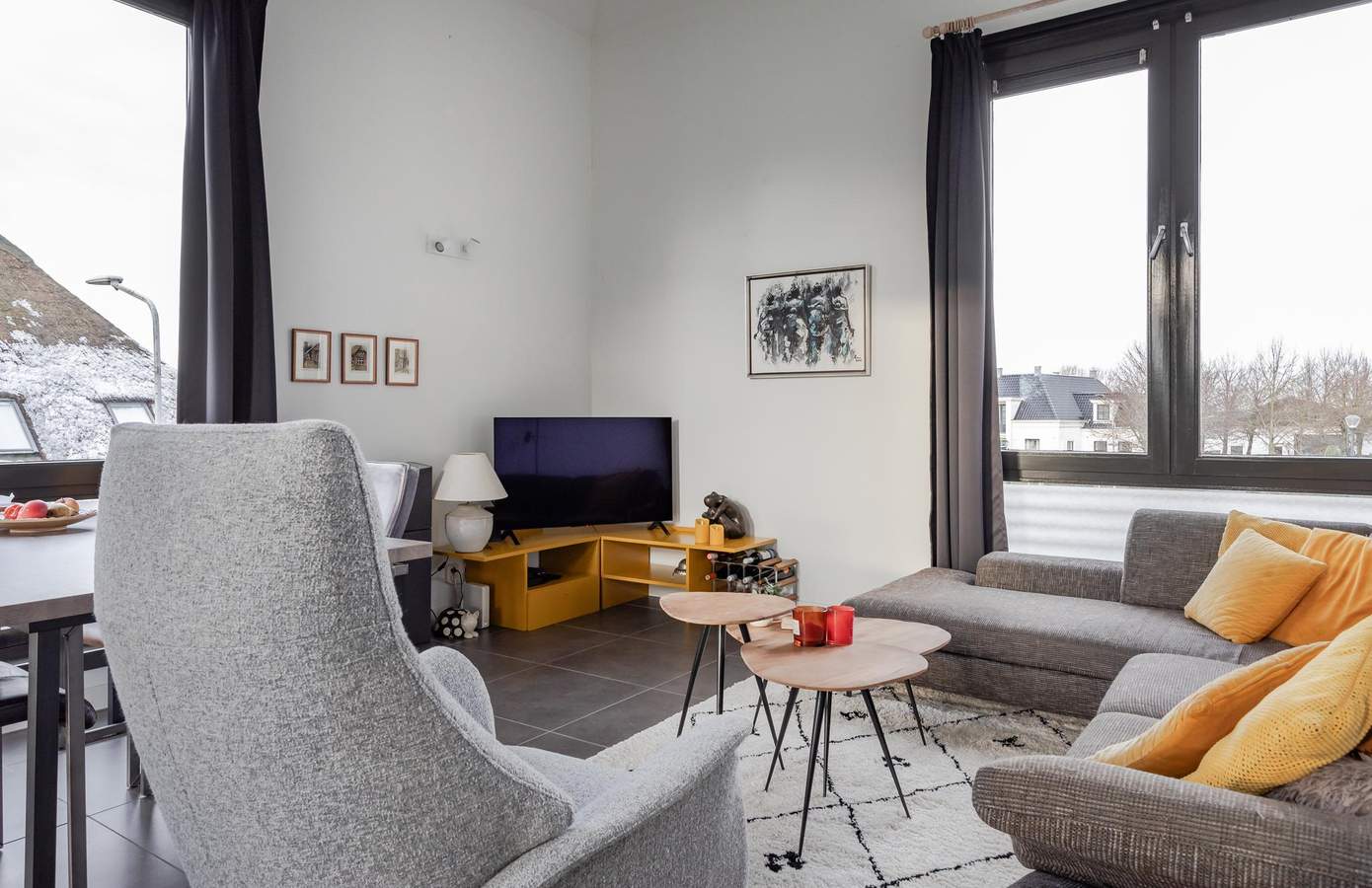 Het appartement bevindt zich op de eerste verdieping en heeft een eigen ingang aan de rechterzijde van het pand. Via de trap bereikt u de hal, die toegang geeft tot alle vertrekken. Het gehele appartement is netjes afgewerkt, voorzien van strakke antracietkleurige plavuizen en beschikt over vloerverwarming. Bij het betreden van de woonruimte, gelegen aan de linkerkant, valt meteen het hoge plafond op en de talrijke grote ramen die zorgen voor een heerlijk lichte en open sfeer. Van hieruit geniet u van een prachtig uitzicht over het dorp en de omringende landerijen. De open keuken, inclusief een spoel-eiland, is uitgerust met een oven, vaatwasser, gaskookplaat en een koelvriescombinatie. Vanuit hier heeft u tevens toegang tot het balkon.