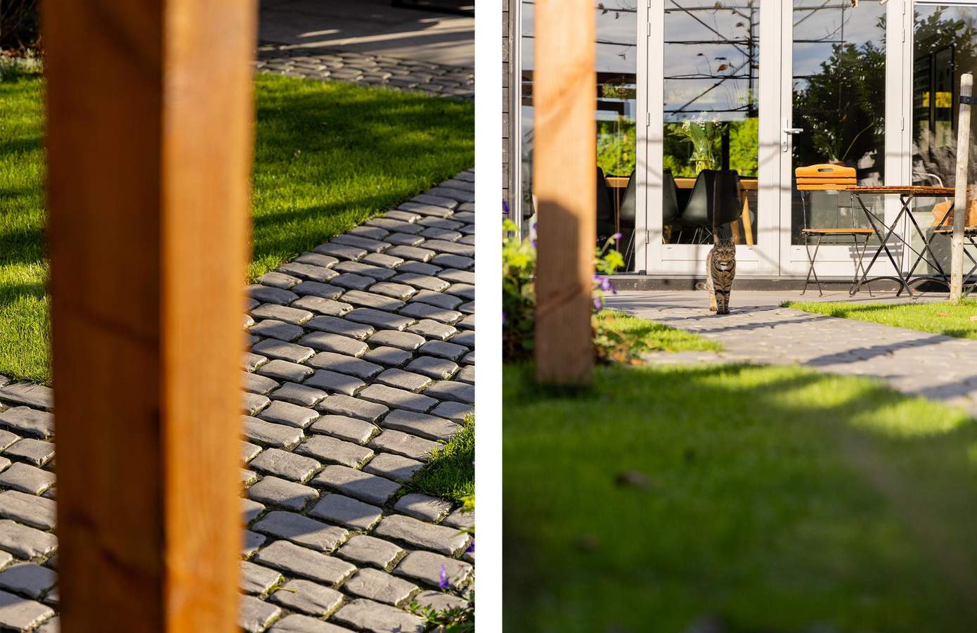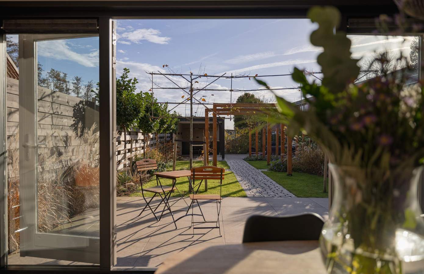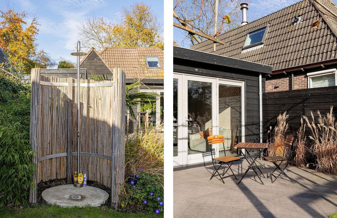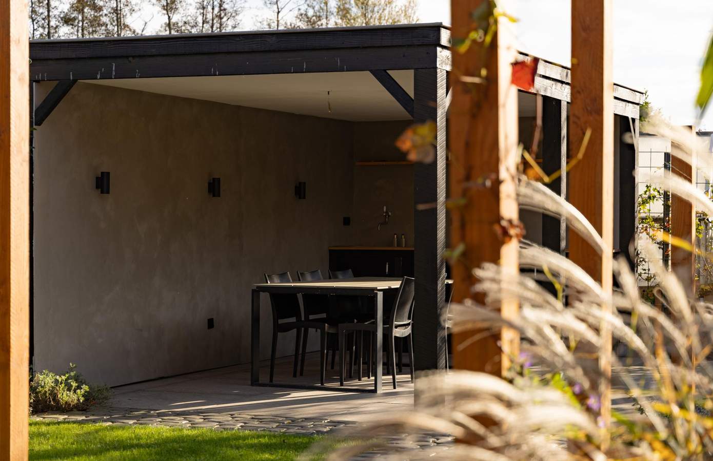 De tuin is in het voorjaar van 2023 volledig opnieuw ontworpen en aangelegd volgens een professioneel tuinplan. Het is een ontwerp waarin balans, rust en beleving centraal staan. Vanuit de woning leidt een pad van robuuste kinderkopjes door het groen van het gazon. De tuin wordt geflankeerd door houten pergola’s waar straks het blad van druiven en leibomen voor natuurlijke schaduw zorgt. Er zijn diverse zithoeken gecreëerd, een terras bij de woning, een buitendouche voor verkoeling, en achterin een robuuste overkapping met buitenkeuken. De overkapping, uitgevoerd in zwart hout, vormt samen met de stijlvolle tuinverlichting en beplanting een sfeervol geheel. Hier komt design tot leven zonder het natuurlijke karakter te verliezen. Een tuin die klopt in elk seizoen, uitnodigend en doordacht tot in elk detail.
