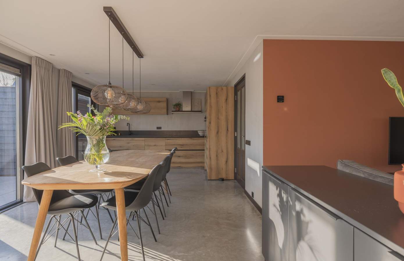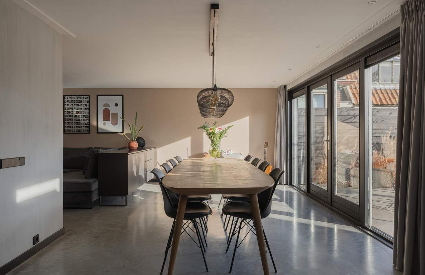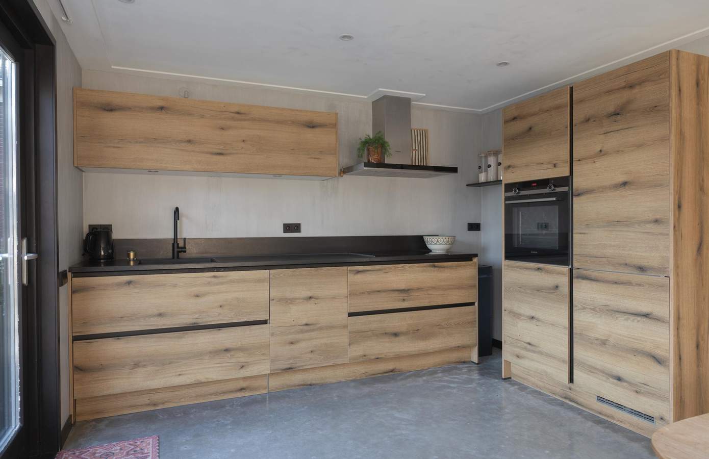 Zodra u binnenstapt, voelt u dat hier met liefde is gewerkt aan elk detail. De begane grond heeft een stoere betonvloer met vloerverwarming, die warmte en design moeiteloos combineert. De eethoek baadt in het licht door de grote raampartijen en openslaande deuren naar de prachtig aangelegde tuin. De keuken is strak vormgegeven in houtlook met zwarte accenten en heeft diverse inbouwapparatuur. De badkamer is op de begane grond gelegen en is keurig afgewerkt met visgraattegels, een regendouche en een natuurstenen waskom. Aan de voorzijde is een multifunctionele kamer, hier is een garderobe kast en de aansluitingen voor de wasmachine en droger. De slaapkamer op de verdieping ademt rust en ruimte, met witgeschilderde balken en veel natuurlijke lichtinval. Het grote dakraam zorgt voor een fijne, lichte sfeer en uitzicht op het groen. De lichte vloer en neutrale tinten versterken het gevoel van ruimte. Een praktische werkhoek en ruime opbergmogelijkheden maken de kamer compleet.