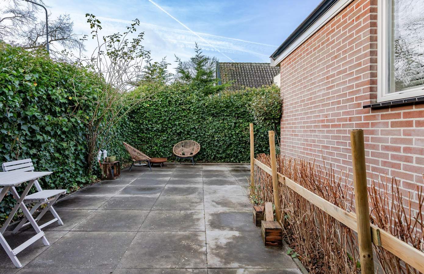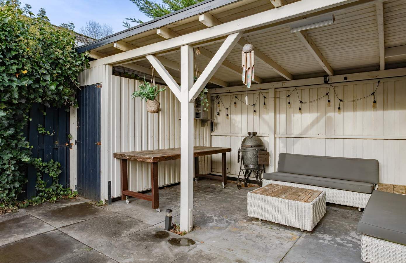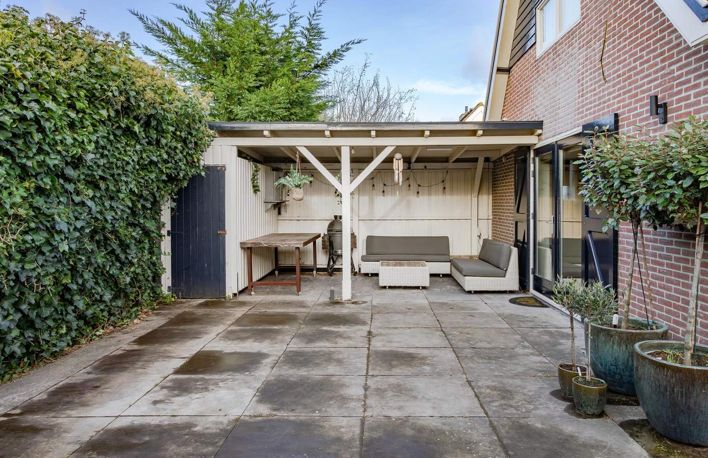 De woning is centraal tegen de achtergrens van het perceel gesitueerd, waardoor de tuin in een U-vorm rondom de woning ligt. Dankzij de omliggende groene heg geniet u in elke hoek van de tuin van optimale privacy. De achtertuin beschikt over een ruim terras met een grote overkapping, uitgerust met heaters. Zo kunt u zelfs op koudere dagen of lange avonden heerlijk buiten zitten. Direct naast de overkapping bevindt zich een nog bergruimte, ideaal voor het opbergen van uw tuinspullen.