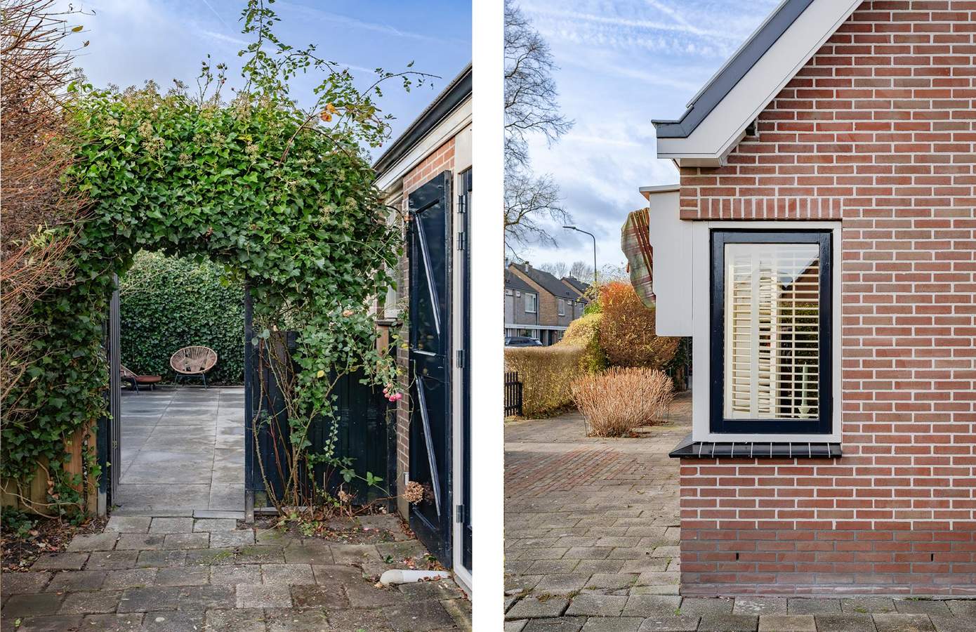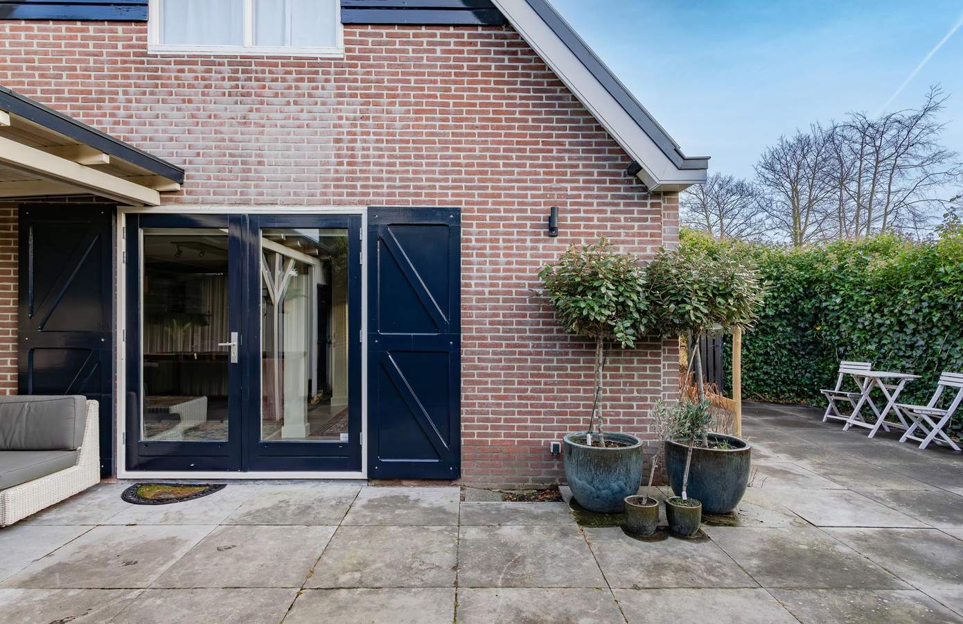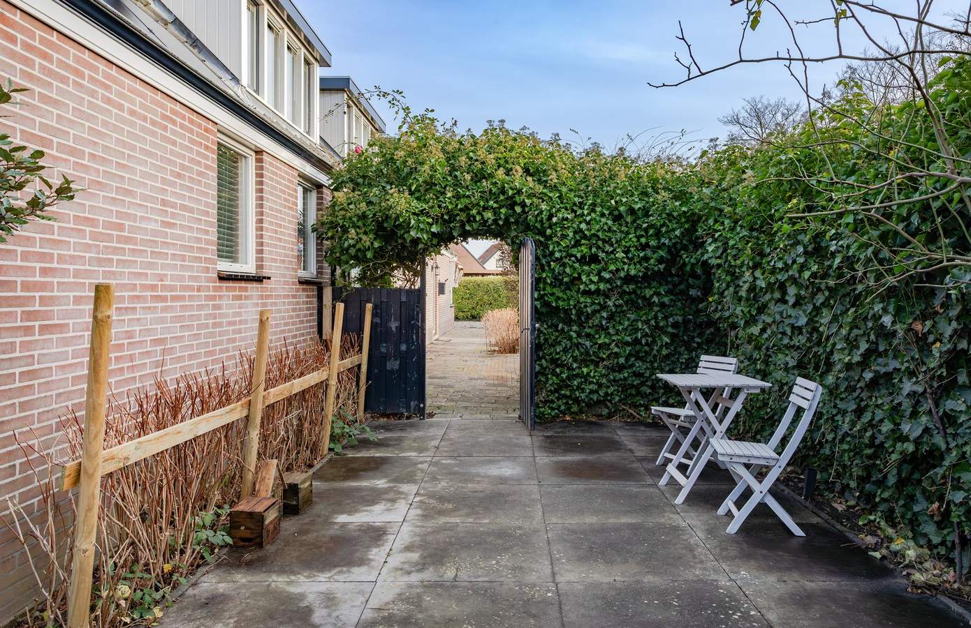 De woning is centraal tegen de achtergrens van het perceel gesitueerd, waardoor de tuin in een U-vorm rondom de woning ligt. Dankzij de omliggende groene heg geniet u in elke hoek van de tuin van optimale privacy. De achtertuin beschikt over een ruim terras met een grote overkapping, uitgerust met heaters. Zo kunt u zelfs op koudere dagen of lange avonden heerlijk buiten zitten. Direct naast de overkapping bevindt zich een nog bergruimte, ideaal voor het opbergen van uw tuinspullen.