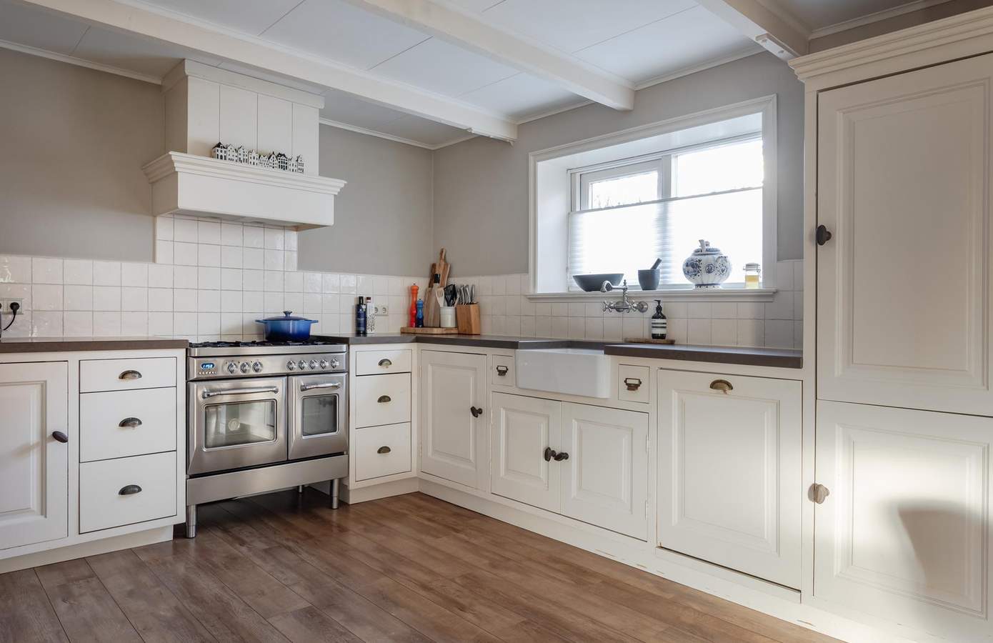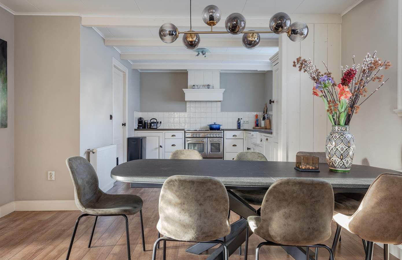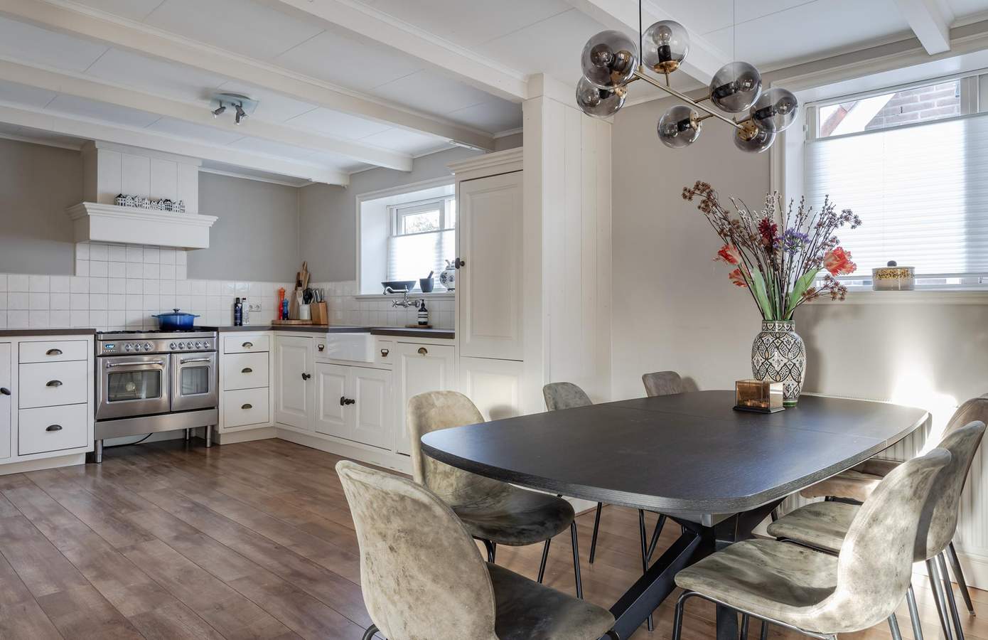Vanuit de voortuin stapt u binnen in de ruime hal, waar zich één van de twee trappen naar boven bevindt. Vanuit de hal komt u in de woonkeuken, die met prachtige glas-in-lood ensuite deuren in verbinding staat met de woonkamer. De royale woonkamer, met een authentiek balkenplafond, ademt karakter en warmte. Grote ramen zorgen voor een overvloed aan daglicht. De landelijke woonkeuken is volledig uitgerust en biedt alles wat u nodig heeft: een 5-pits gasfornuis met grill, twee ovens, een vaatwasmachine en een koel-vriescombinatie. Vanuit de keuken komt u in de gang, waar zich een toilet, een praktische natte ruimte met douche en wasbak, én een handige voorraadkast bevinden. Loopt u verder door de gang, dan bereikt u de tweede woonruimte van deze woning. Deze veelzijdige ruimte biedt vele mogelijkheden. Of u nu droomt van een kantoor of praktijk aan huis, een extra woonruimte voor de kinderen, een mantelzorgwoning of een bedrijfsruimte – hier kan het allemaal. Wilt u meer wooncomfort creëren? Dan is het eenvoudig om deze ruimte bij het woonhuis te betrekken door de muur bij de keuken door te breken. Deze tweede woonruimte is voorzien van een berging, een kitchenette, openslaande deuren naar de tuin en een trap naar boven.