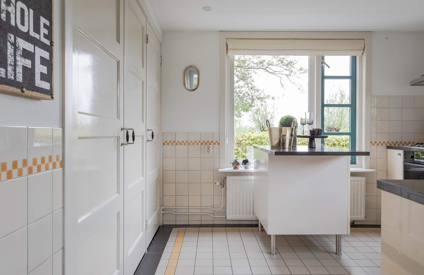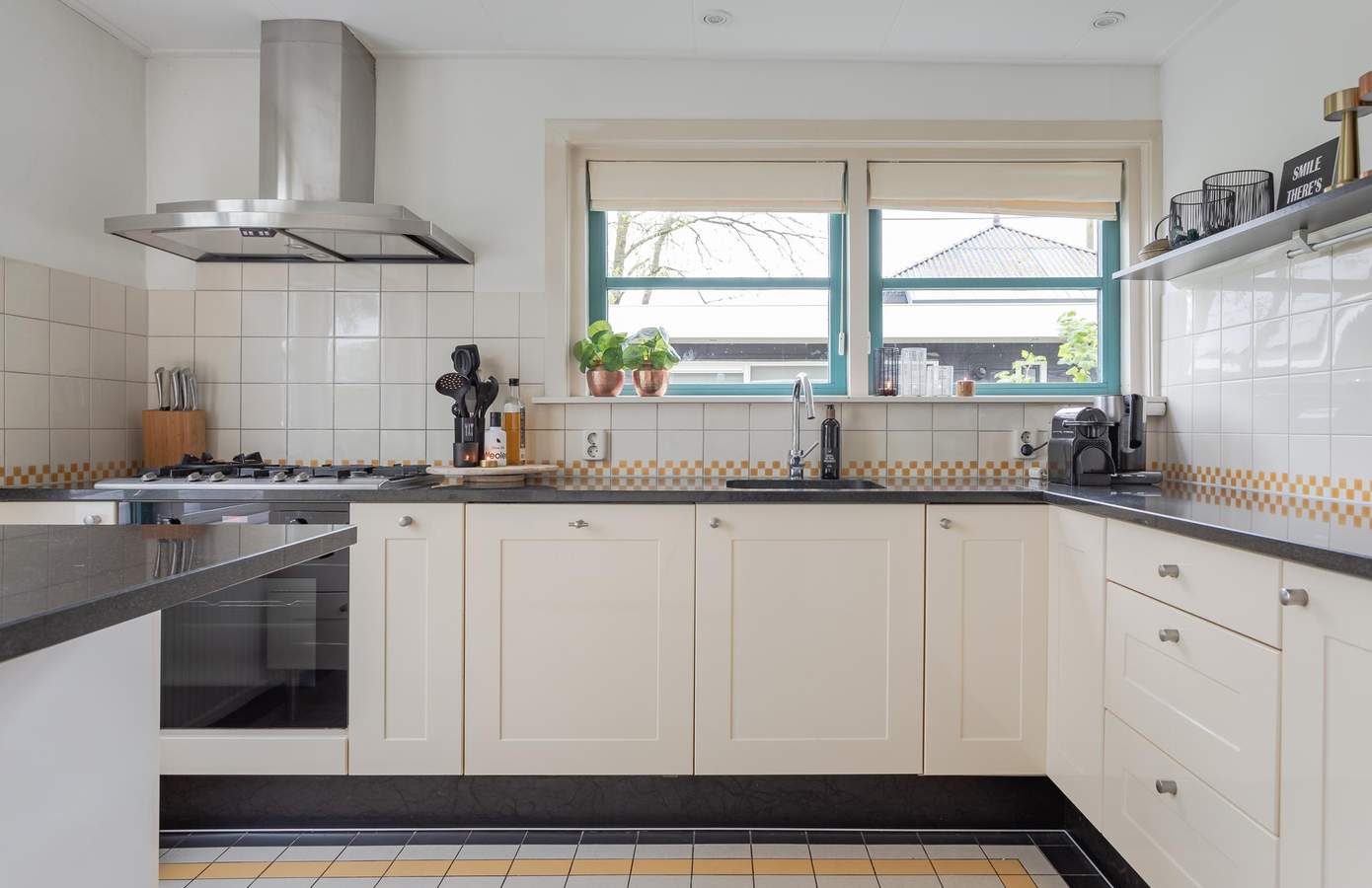 De keuken bevindt zich aan de achterzijde van de woning en is uitgerust met inbouwapparatuur en ruime, handige inbouwkasten om uw spullen op te bergen, perfect voor bijvoorbeeld het plaatsen van uw wasmachine en droger. Vanuit de keuken heeft u ook directe toegang tot de tuin via een buitendeur.