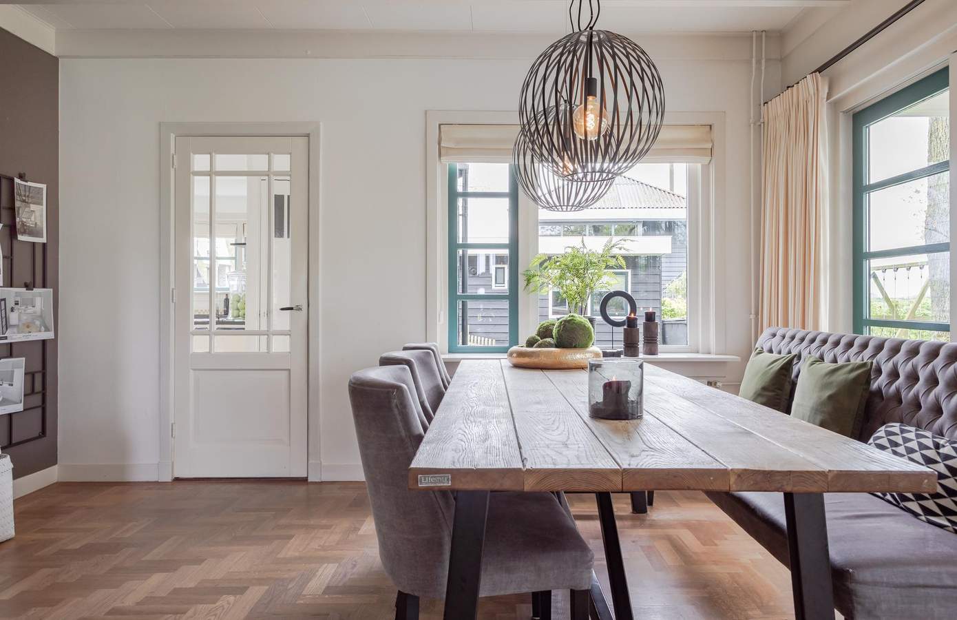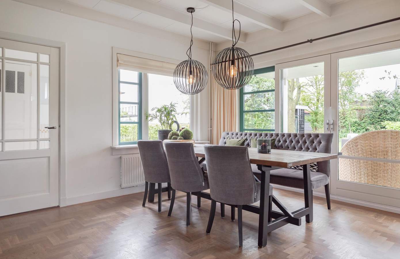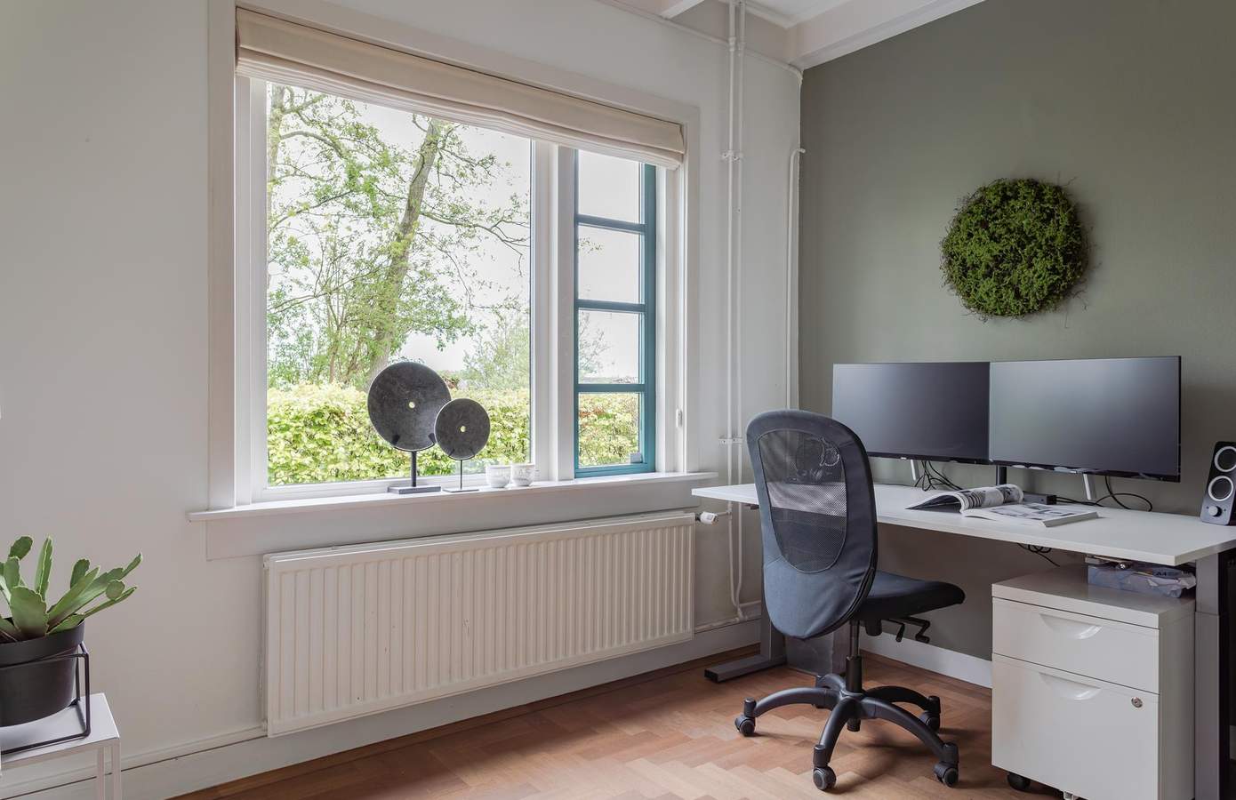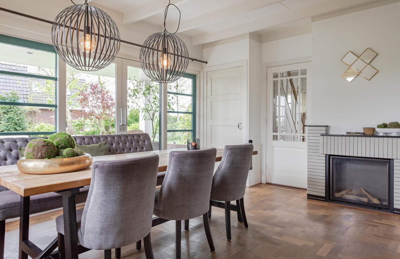 Door de ruime hal betreedt u de eetkamer, welke openslaande deuren heeft naar de zuidelijk gelegen veranda. Hier kunt u genieten van een prachtig uitzicht op de tuin en het landschap aan de zijkant. Grenzend aan de eetkamer bevindt zich een extra kamer, ideaal voor een kantoor aan huis of als speelkamer voor de kinderen.