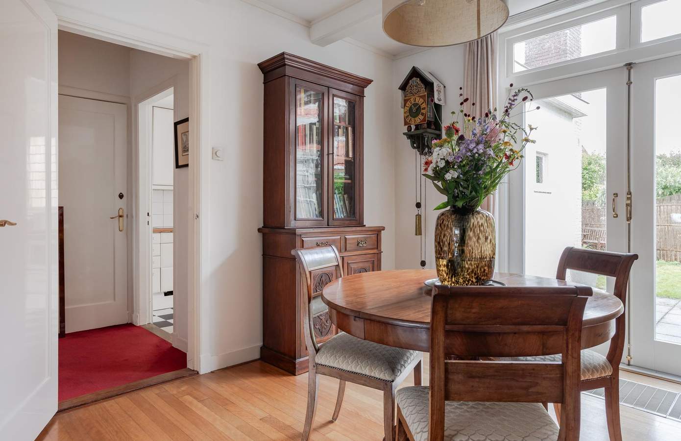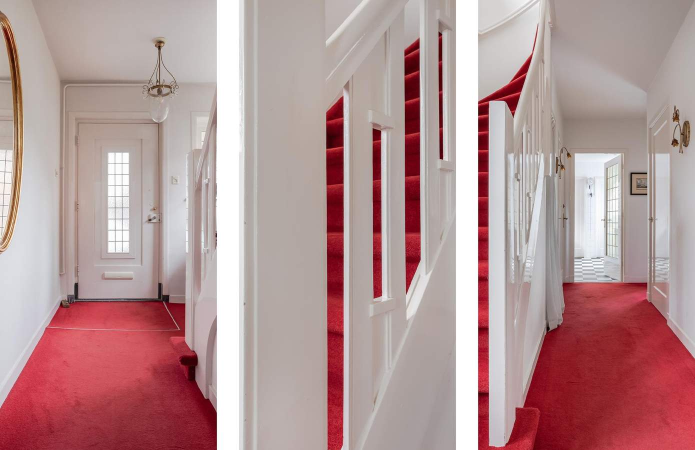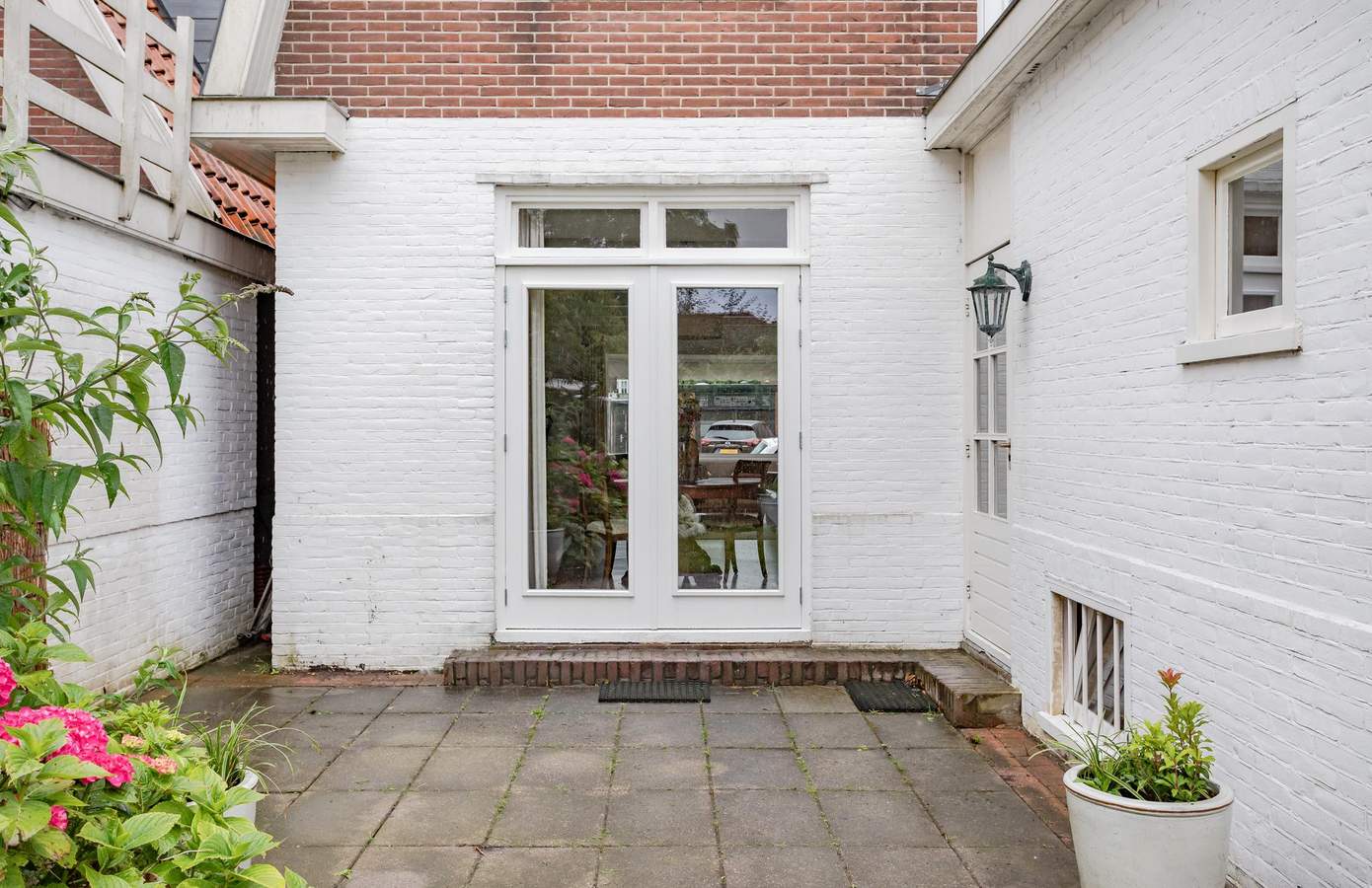 Een opstap naar de portiek met nog de originele voordeur is de entree van deze woning. Via de rood beklede hal bereikt u alle ruimtes op de begane grond. De keuken, de woonkamer, het toilet en de trap naar de verdieping. De woonkamer is sfeervol door het hoge plafond met balken, glas-in-lood, de erker en de schouw. Heerlijke openslaande deuren naar de tuin zorgen voor verkoeling op de zomerse dagen. De keuken is gedateerd maar functioneert. Vanuit de keuken bereikt u de wasruimte/bijkeuken en de werkkamer. Deze werkkamer kan met een buitendeur aan de voorzijde ook prima functioneren als schuur.