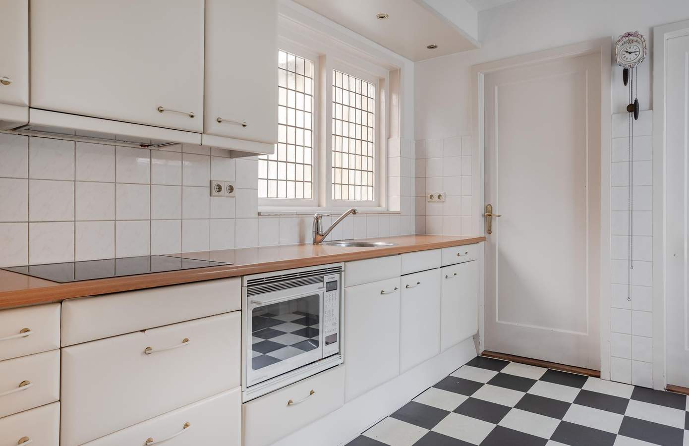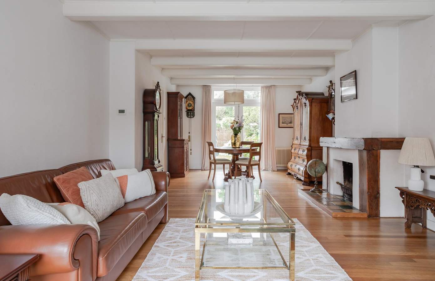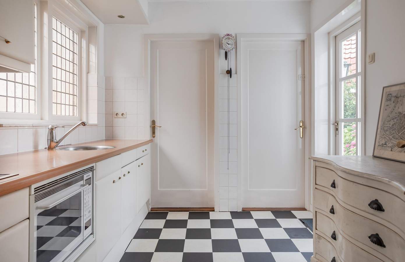 Een opstap naar de portiek met nog de originele voordeur is de entree van deze woning. Via de rood beklede hal bereikt u alle ruimtes op de begane grond. De keuken, de woonkamer, het toilet en de trap naar de verdieping. De woonkamer is sfeervol door het hoge plafond met balken, glas-in-lood, de erker en de schouw. Heerlijke openslaande deuren naar de tuin zorgen voor verkoeling op de zomerse dagen. De keuken is gedateerd maar functioneert. Vanuit de keuken bereikt u de wasruimte/bijkeuken en de werkkamer. Deze werkkamer kan met een buitendeur aan de voorzijde ook prima functioneren als schuur.