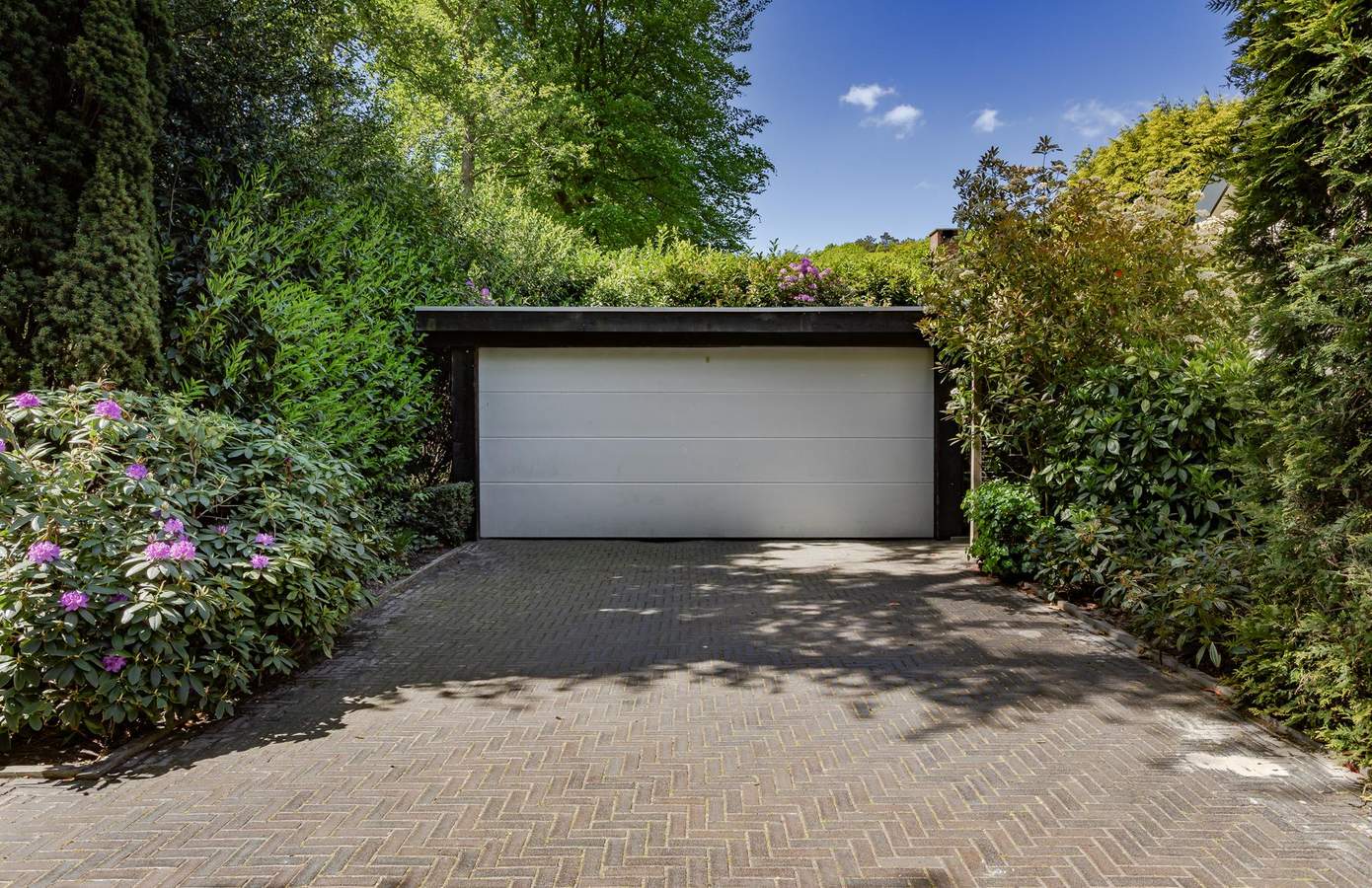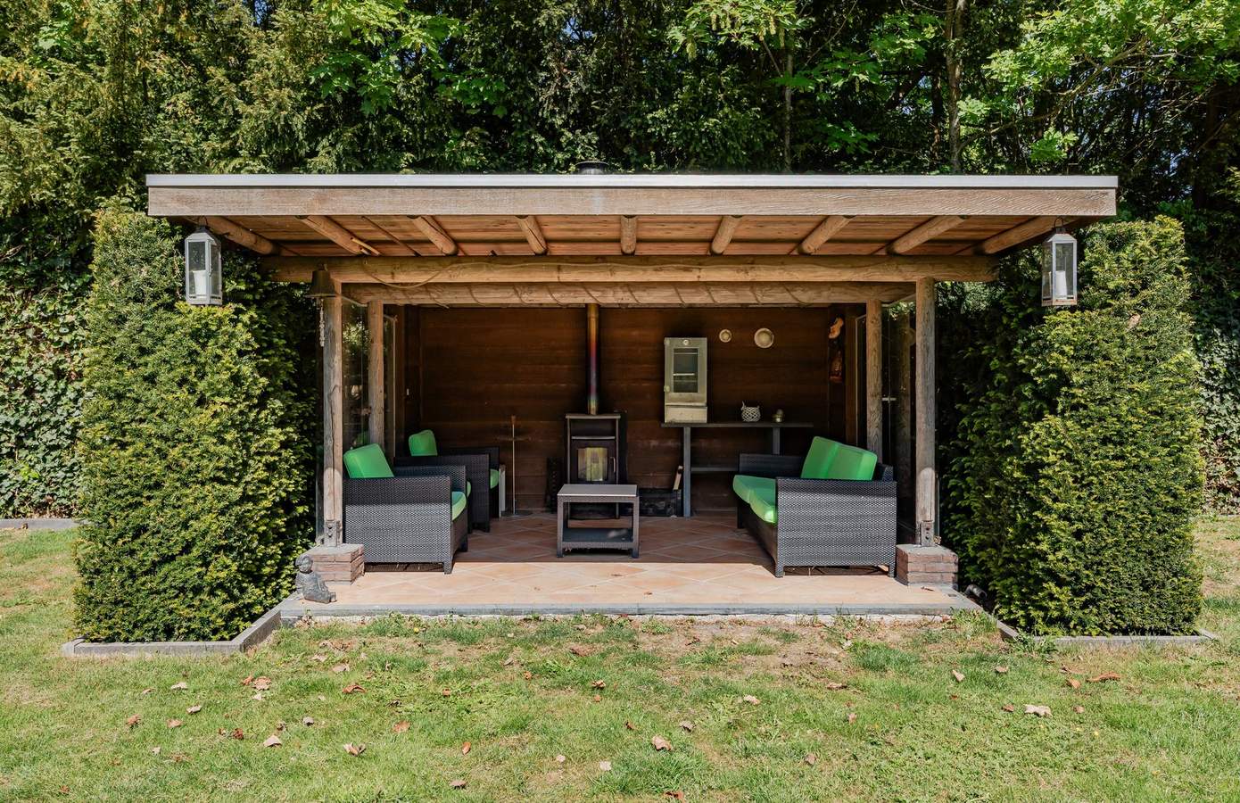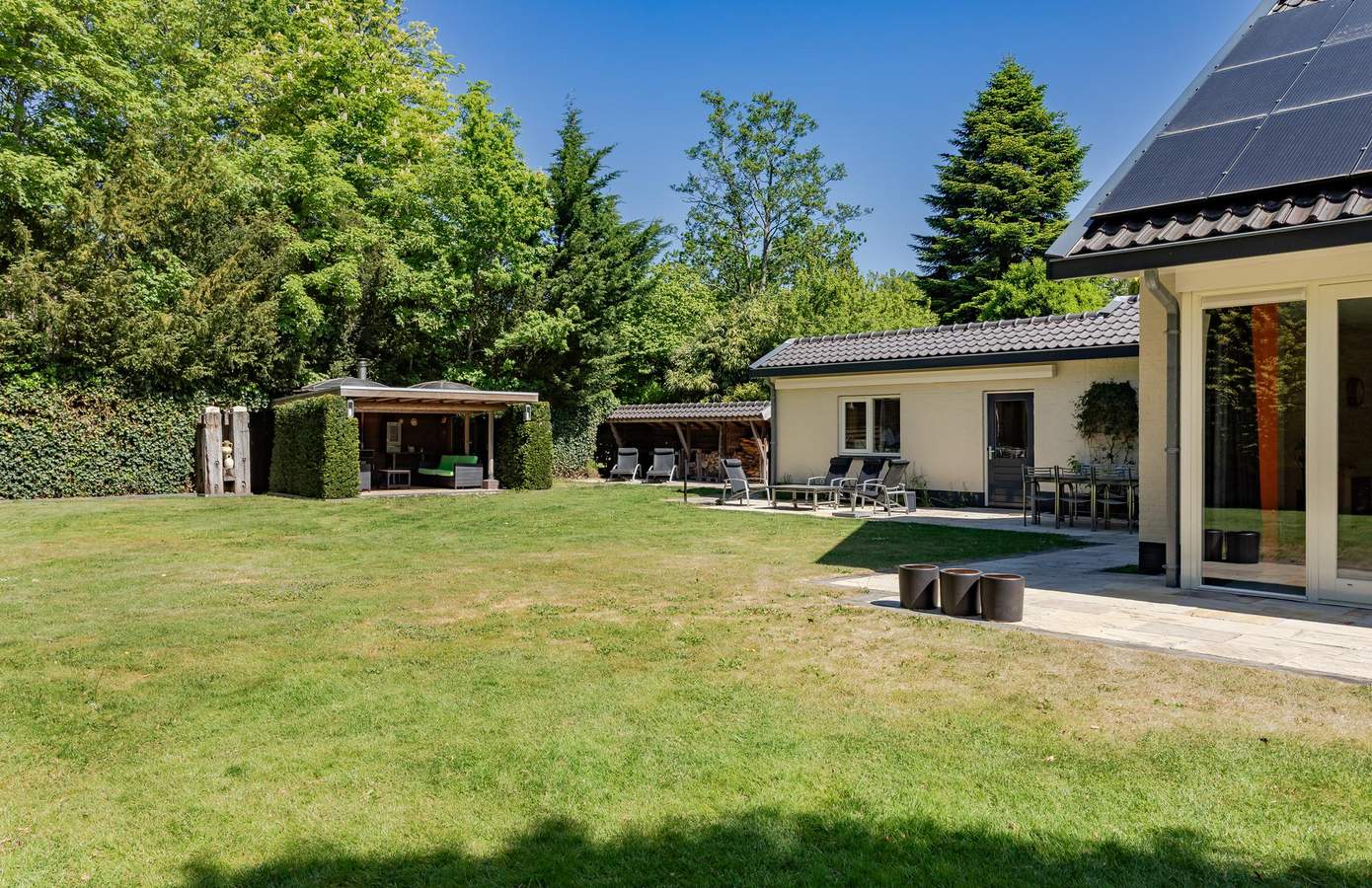 De tuin is een oase van rust. Groen, onderhoudsvriendelijk door de vaste planten en omzoomd door imposante bomen. De zon draait mooi over het perceel, waardoor u de hele dag van het buitenleven kunt genieten, van de ochtendzon bij het ontbijt tot de avondzon in de buitenkamer, waar een wijntje drinken bij het verwarmde zwembad bijna vanzelfsprekend wordt. Op de oprit kunnen gemakkelijk meerdere auto’s worden geparkeerd. Ook is er een dubbele garage voor het stallen van uw auto(‘s). Er is een prachtige buitenkamer waar u beschut kunt zitten, omringd door het gezang van vogels en het geritsel van de bomen. Uniek is, dat er nog een soort tuinhuis aanwezig is, een ruimte, momenteel ingevuld als mancave, voorzien van elektra en een eigen oprit.
