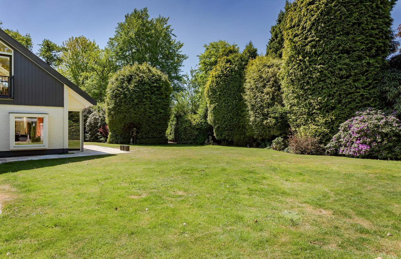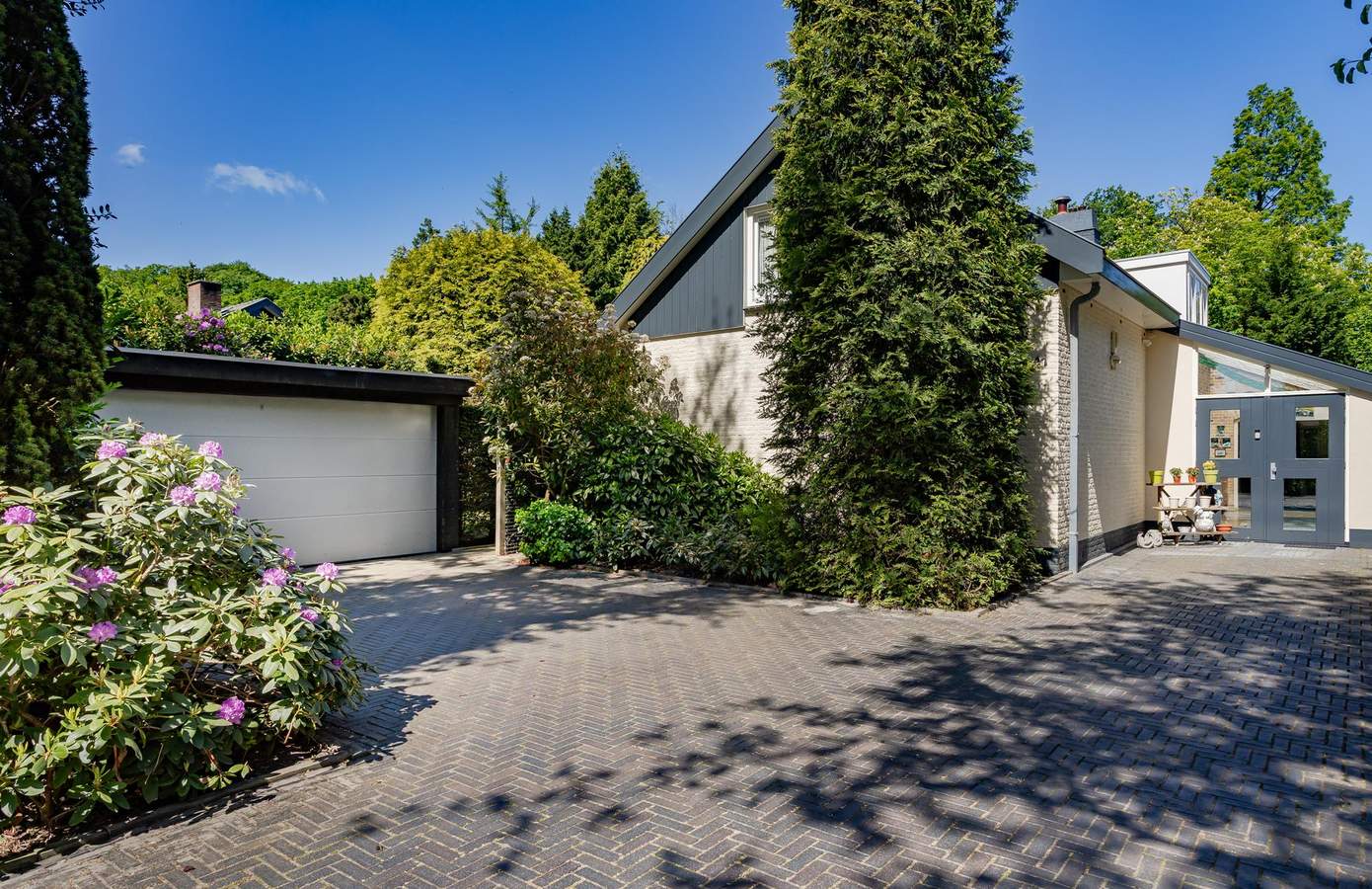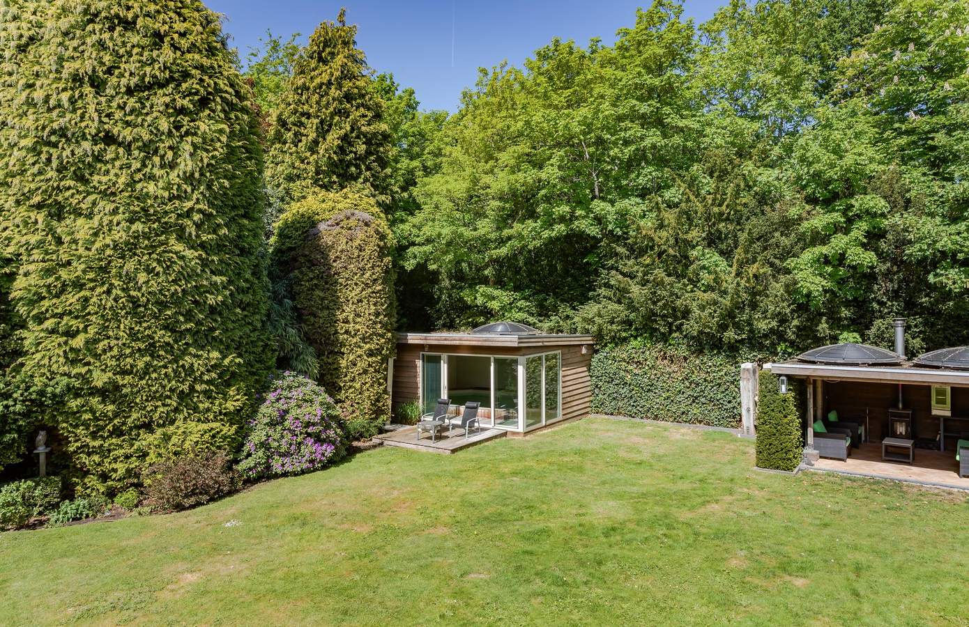 De tuin is een oase van rust. Groen, onderhoudsvriendelijk door de vaste planten en omzoomd door imposante bomen. De zon draait mooi over het perceel, waardoor u de hele dag van het buitenleven kunt genieten, van de ochtendzon bij het ontbijt tot de avondzon in de buitenkamer, waar een wijntje drinken bij het verwarmde zwembad bijna vanzelfsprekend wordt. Op de oprit kunnen gemakkelijk meerdere auto’s worden geparkeerd. Ook is er een dubbele garage voor het stallen van uw auto(‘s). Er is een prachtige buitenkamer waar u beschut kunt zitten, omringd door het gezang van vogels en het geritsel van de bomen. Uniek is, dat er nog een soort tuinhuis aanwezig is, een ruimte, momenteel ingevuld als mancave, voorzien van elektra en een eigen oprit.