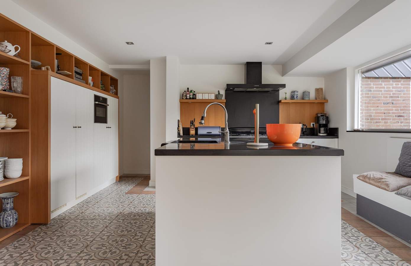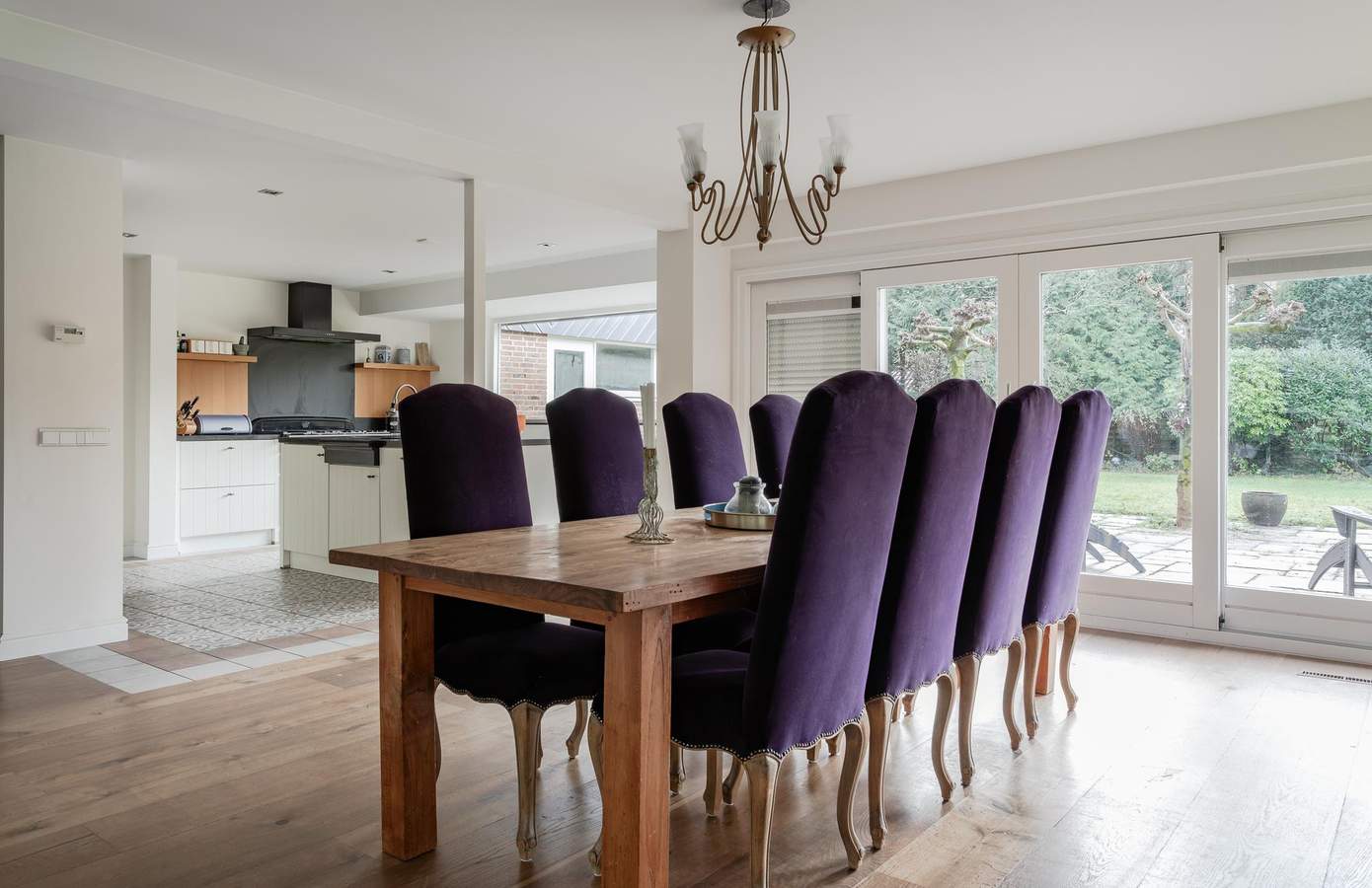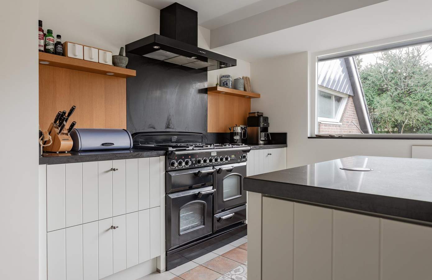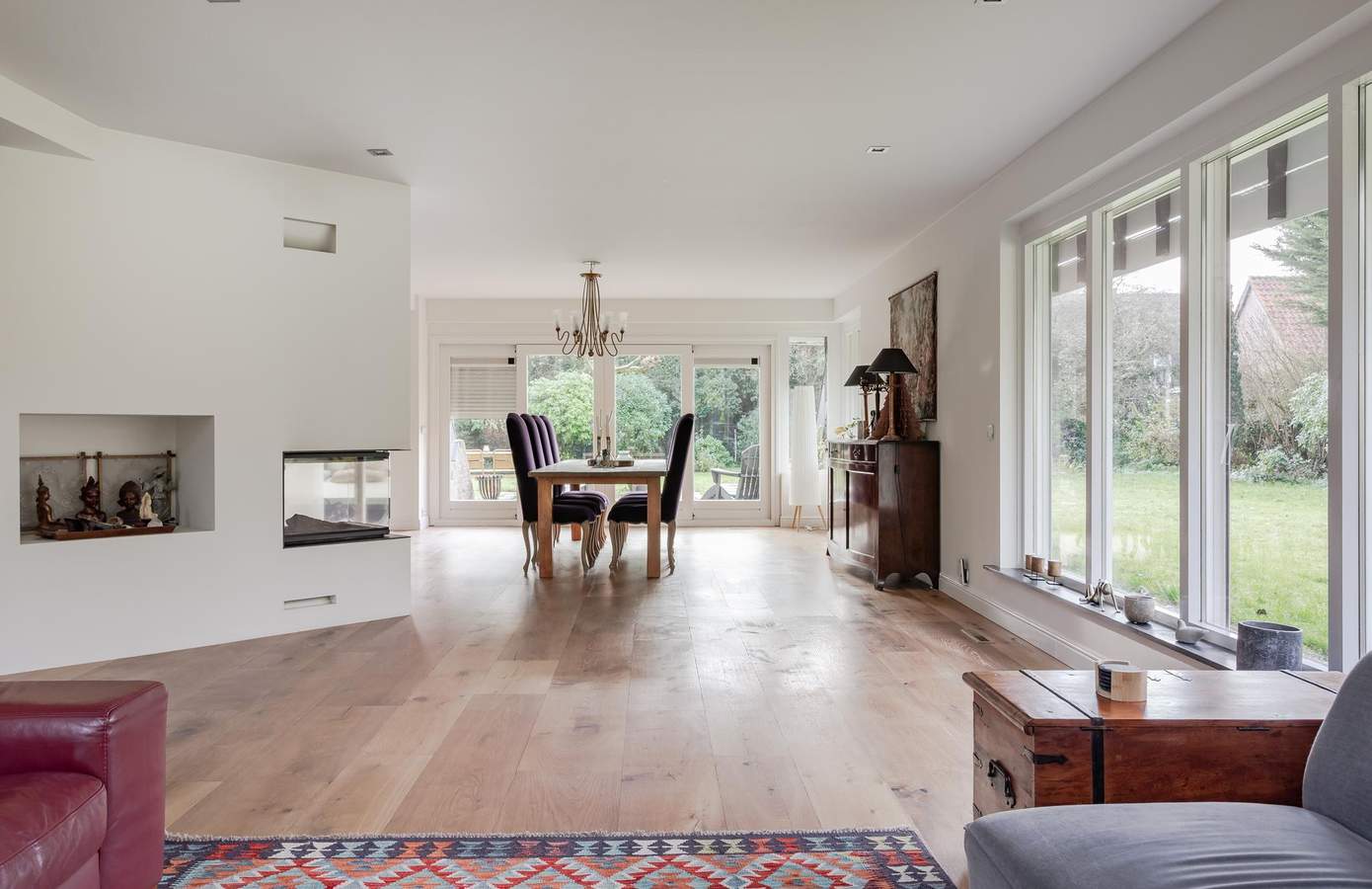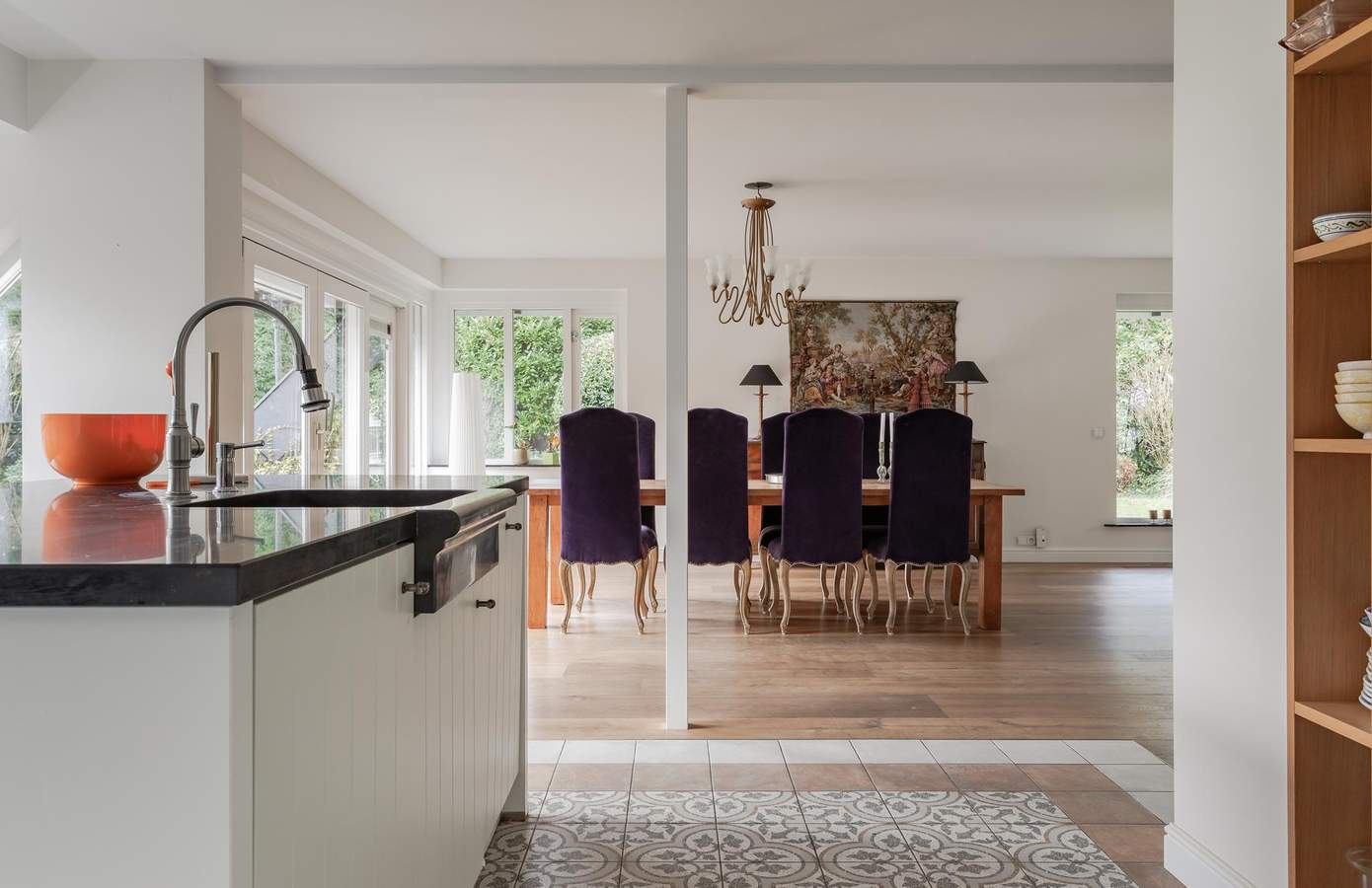 De royale woonkamer van circa 150 m² vormt het hart van de woning. De woonkamer is opgedeeld in verschillende zithoeken, elk met een eigen karakter en uitstraling. Deze indeling creëert een fijne afwisseling tussen openheid en geborgenheid. De prachtige haard is vanuit vrijwel elke hoek zichtbaar en zorgt voor een warme sfeer. De keuken sluit aan op de woonkamer en is uitgerust met alles wat een kookliefhebber zich kan wensen, een Falcon fornuis, een ingebouwde combi/stoomoven, meerdere inbouwkoelkasten, een vaatwasser en een royaal spoeleiland. Het grote raam zorgt voor een prachtige lichtval en een fijn uitzicht op uw eigen tuin tijdens het koken. Aangrenzend vindt u de praktische bijkeuken met veel kastruimte en aansluitingen voor het witgoed. Van daaruit loopt u door naar de enorme inpandige garage, die qua oppervlakte veel mogelijkheden biedt, van werkplaats tot fitnessruimte of het stallen van meerdere voertuigen.