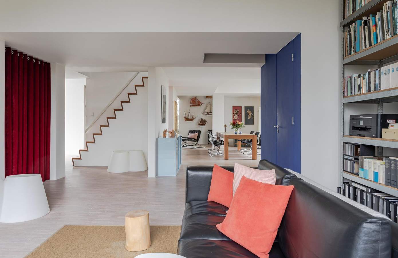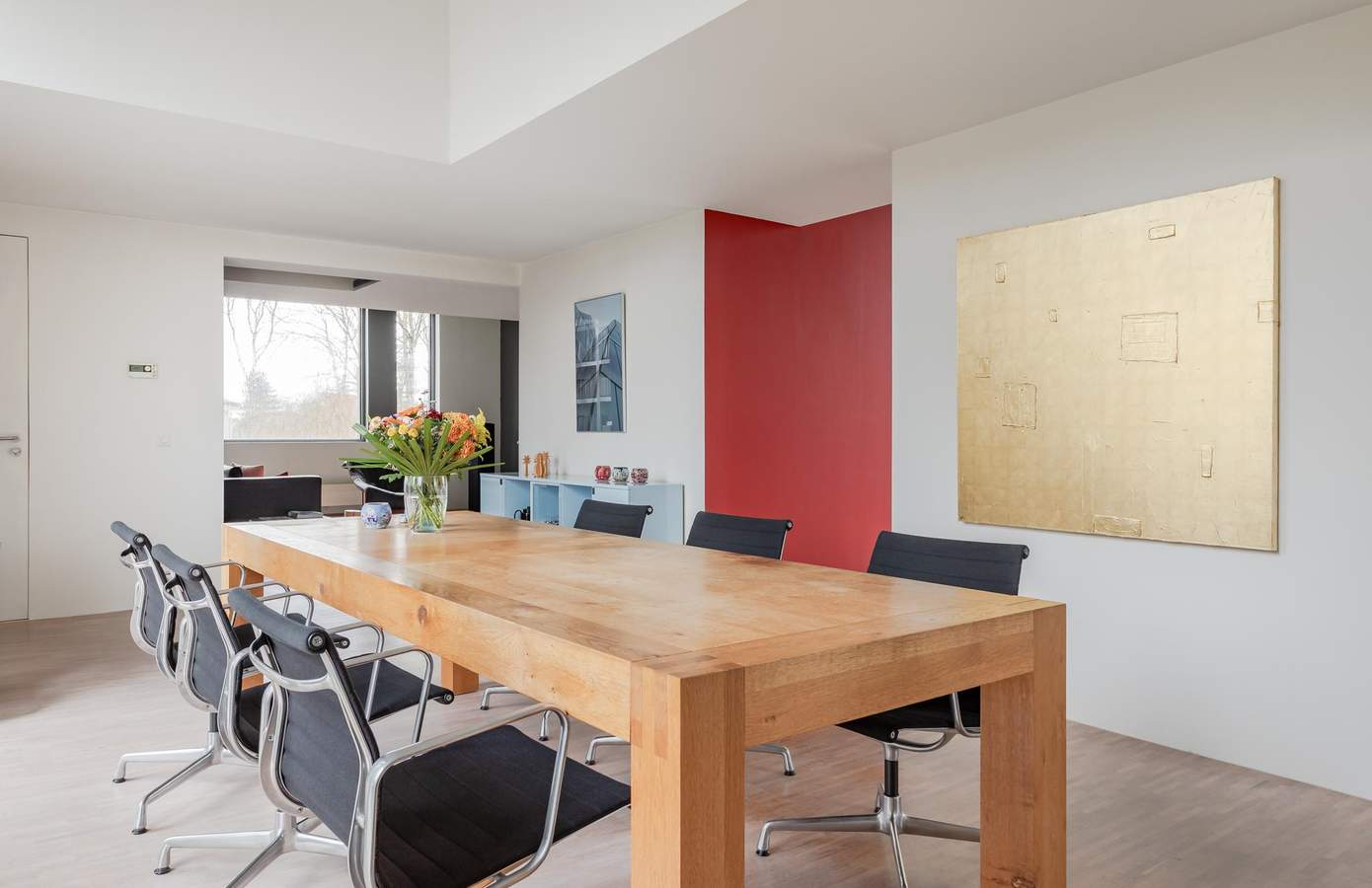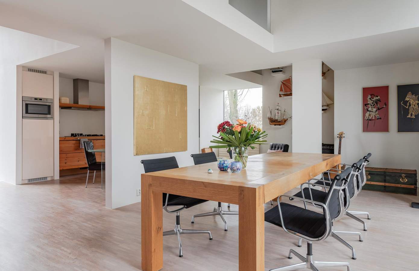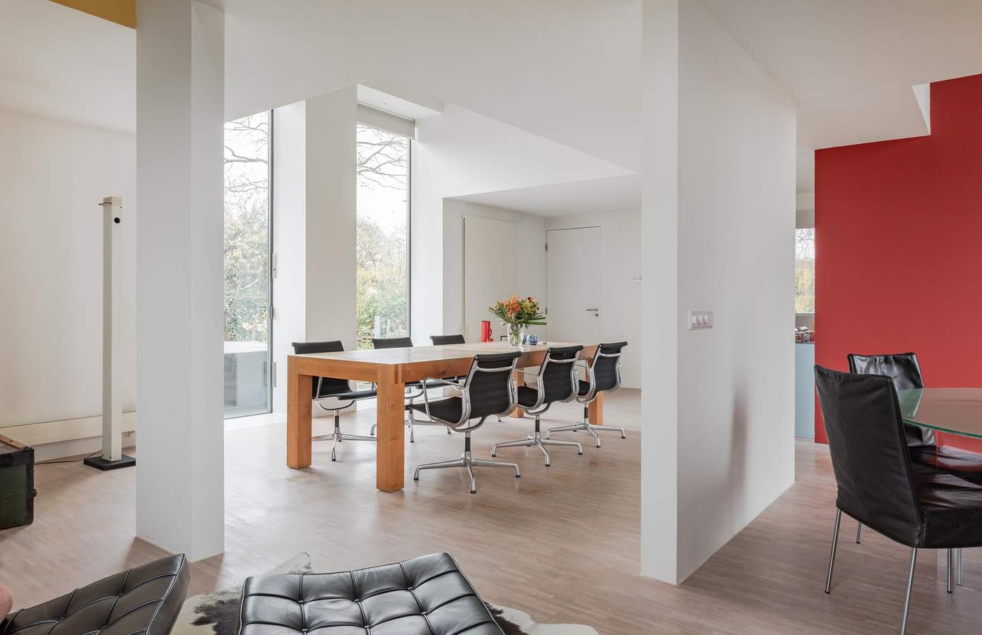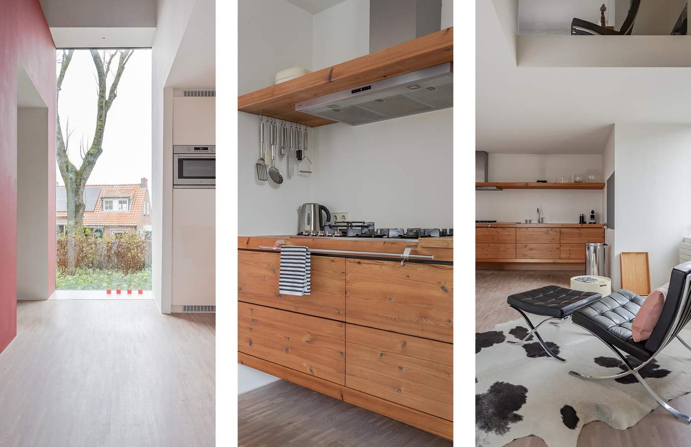 Architectuur interieurVervolgens ontwierp Ton het compleet nieuwe interieur. Het zonlicht, dat op deze vrije locatie de hele dag binnenvalt, stond centraal. Het inspireerde tot een open, huiselijke indeling met veel doorzichten en vertrekken zonder deuren. Vrijstaande wanden definiëren de ruimten. Alles is met elkaar verbonden. Ook de eikenhouten mozaïekvloer verbindt: het strekt zich uit over de gehele begane grond. De wanden zijn strak gestuukt. Vier ervan kregen een kleur. Deze spelen een rol in de weerkaatsing van zonlicht door de dag heen. De hoogte van de vides versterkt de ruimtelijkheid. Grote raampartijen zorgen voor contact tussen boven en beneden. Transparantie. Eén geheel.