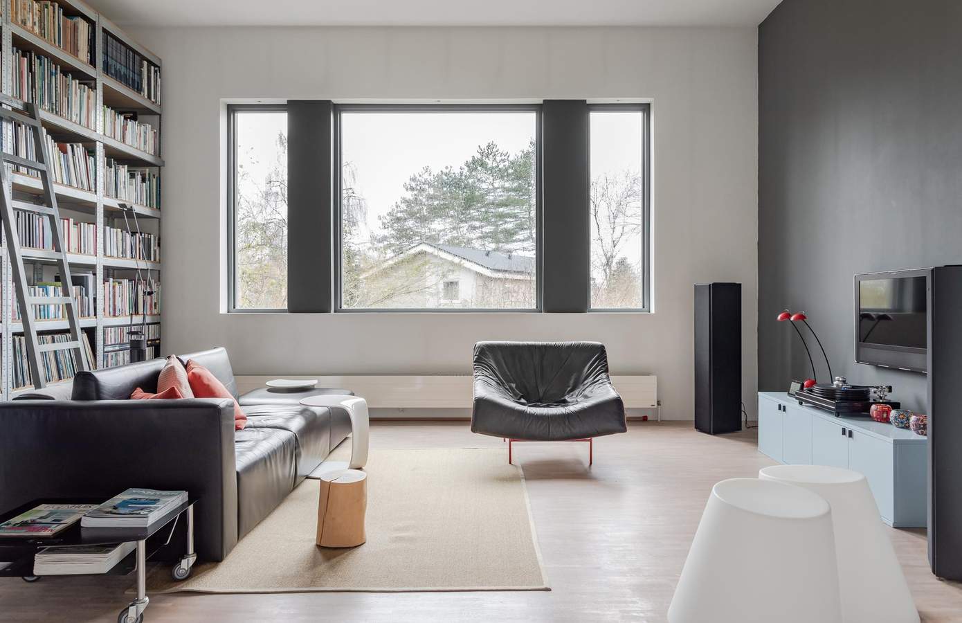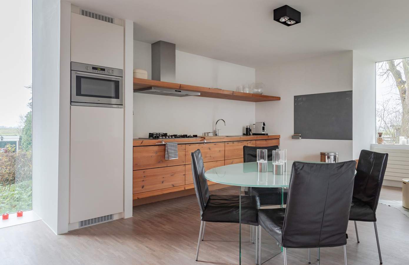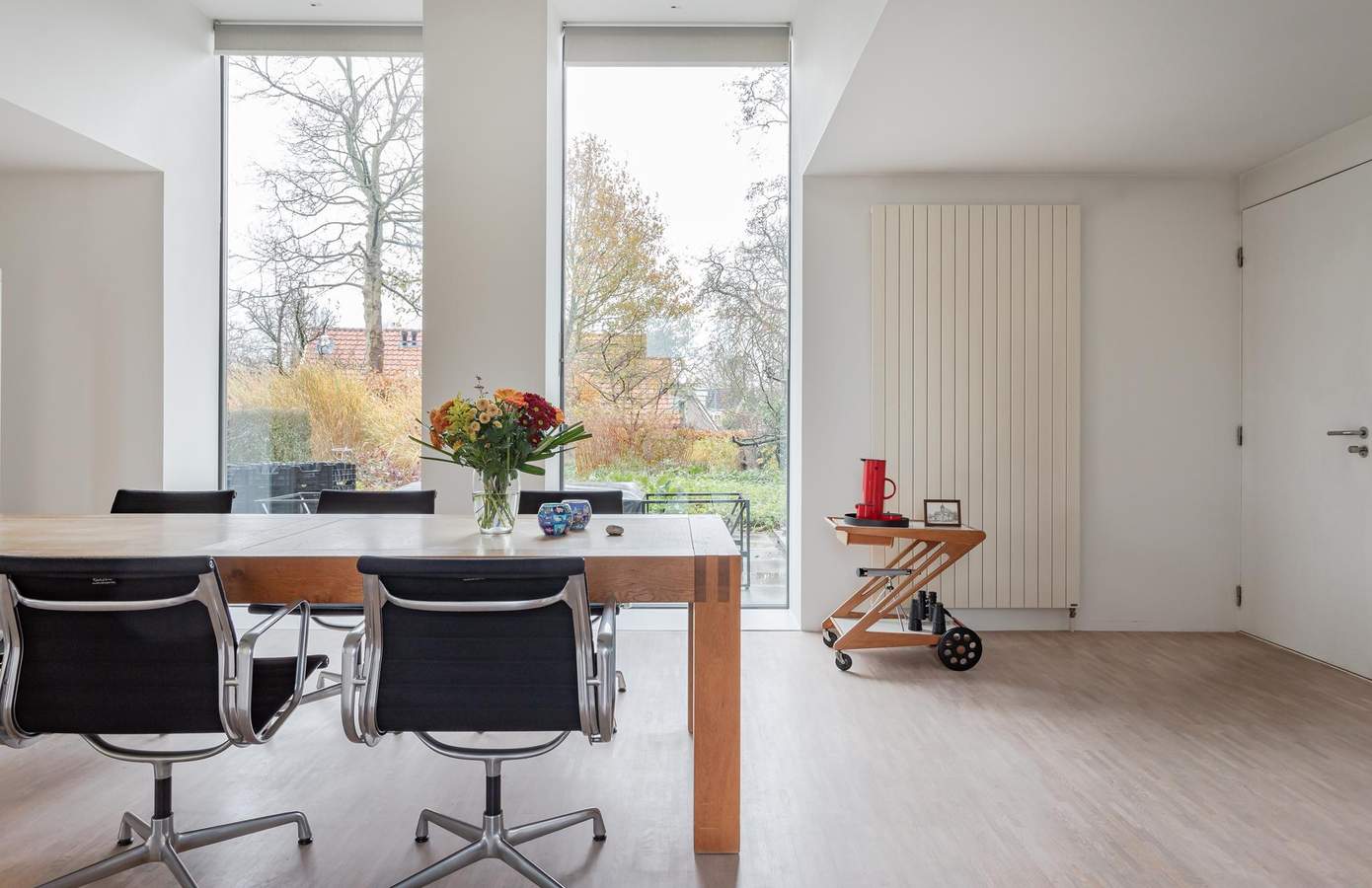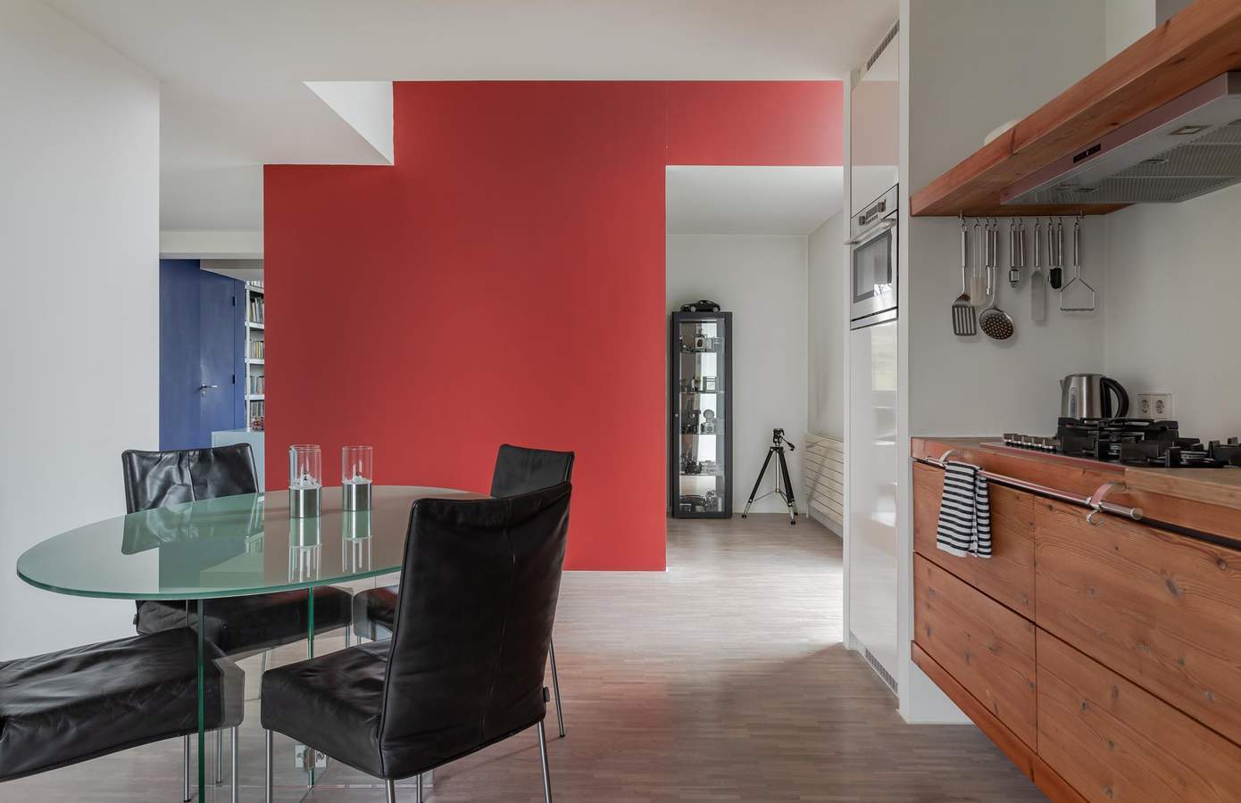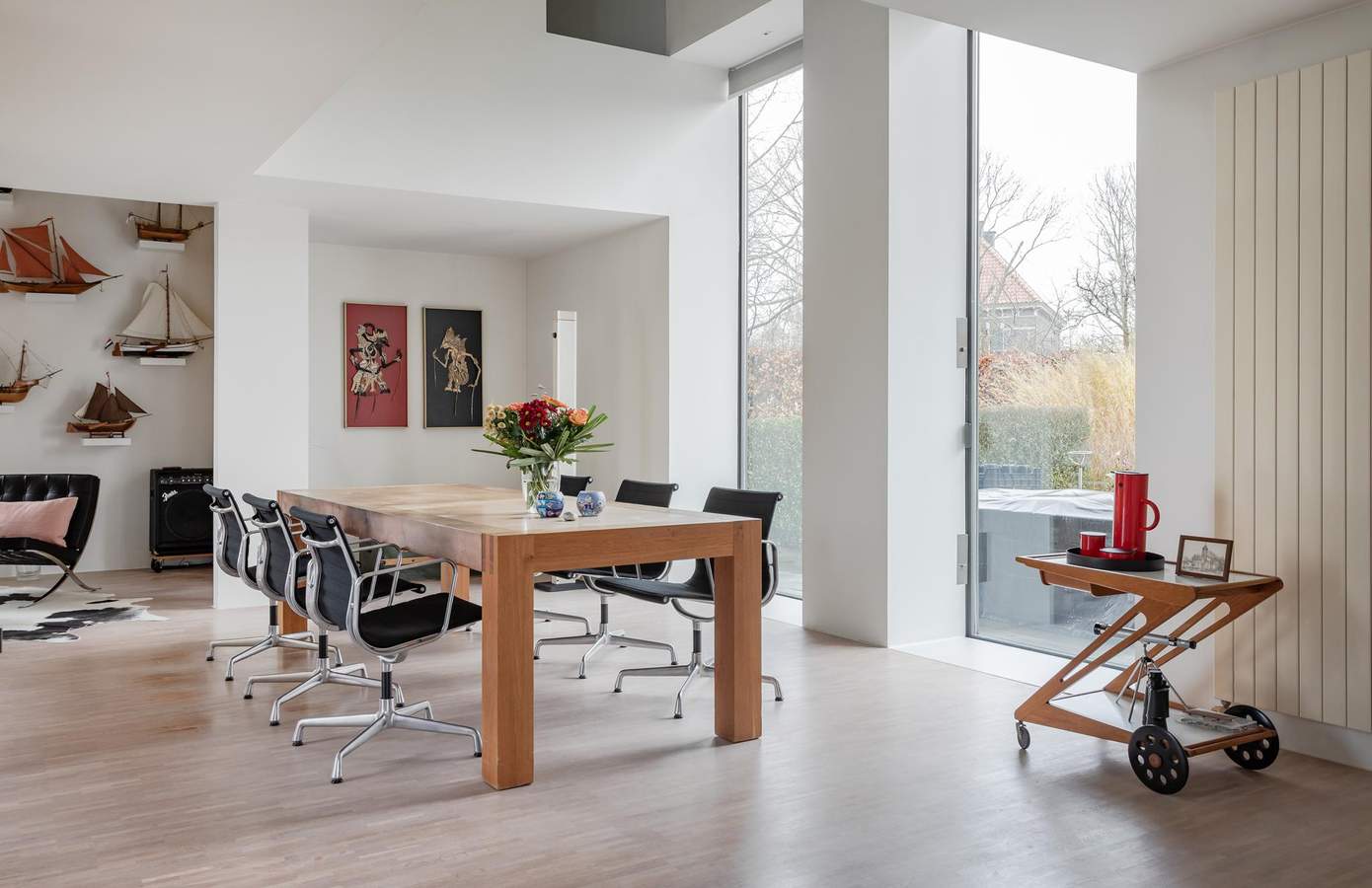 Architectuur interieurVervolgens ontwierp Ton het compleet nieuwe interieur. Het zonlicht, dat op deze vrije locatie de hele dag binnenvalt, stond centraal. Het inspireerde tot een open, huiselijke indeling met veel doorzichten en vertrekken zonder deuren. Vrijstaande wanden definiëren de ruimten. Alles is met elkaar verbonden. Ook de eikenhouten mozaïekvloer verbindt: het strekt zich uit over de gehele begane grond. De wanden zijn strak gestuukt. Vier ervan kregen een kleur. Deze spelen een rol in de weerkaatsing van zonlicht door de dag heen. De hoogte van de vides versterkt de ruimtelijkheid. Grote raampartijen zorgen voor contact tussen boven en beneden. Transparantie. Eén geheel.