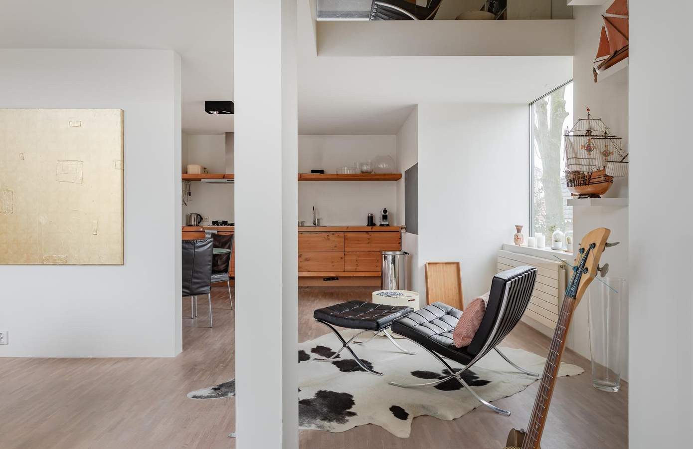 VerdiepingIn het midden staat de strakke, open trap naar de bovenverdieping. De overloop heeft niet alleen een praktische vaste kastenwand, maar ook grote ramen. Eentje geeft uitzicht op het westen, de andere twee op de begane grond. Boven en beneden voelen hierdoor als een geheel. De overloop is geen gangetje, maar een volwaardig onderdeel van de woning. De open ruimte leidt langs de badkamer, slaapkamer en een kleine droogkamer. Deze kunt u ook inrichten als tweede slaapplek, met of zonder deur. De badkamer heeft een ruime inloopdouche, wastafel en toilet. Vanuit de slaapkamer op het koele noorden kijkt u in drie richtingen door ramen in de vides. Het raam naar buiten biedt weids uitzicht over de historische omgeving.