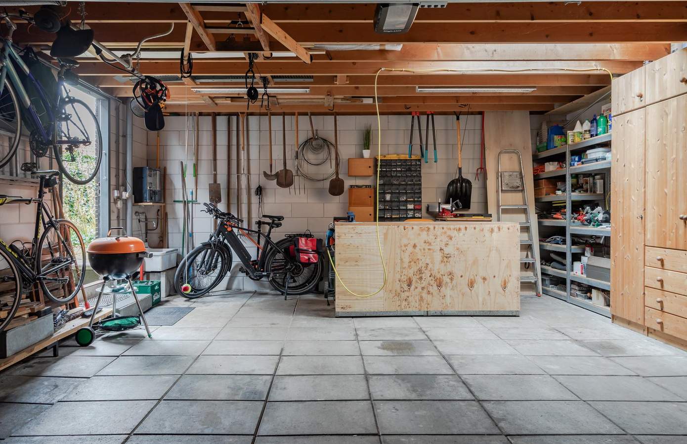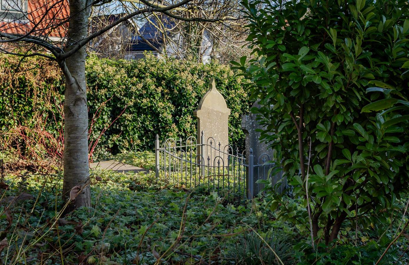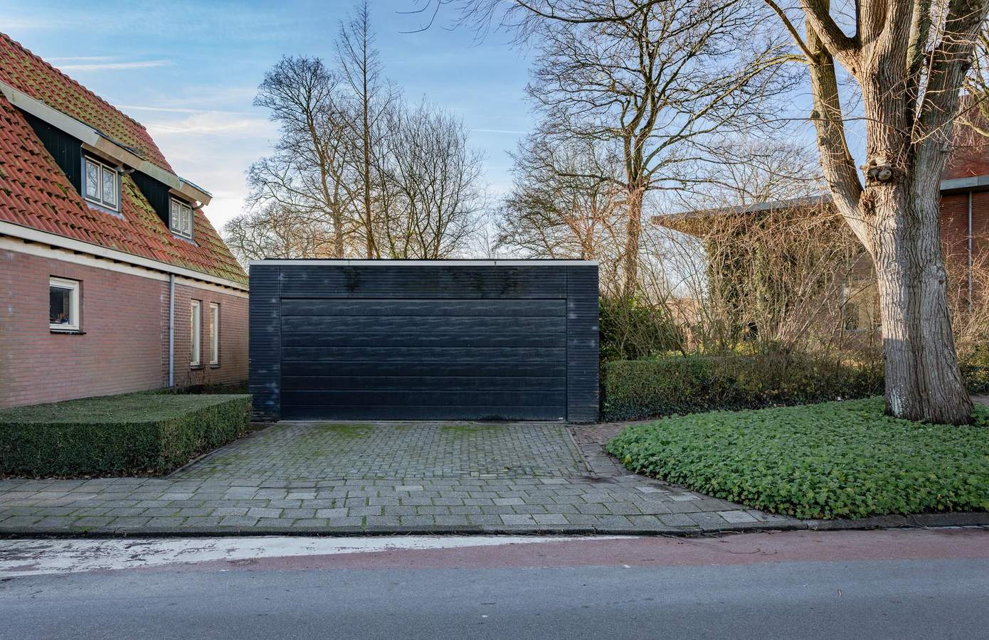 Het groen, de hoogte en de afstand tot de omgeving geven u een privacy-rijke tuin. Hier staan onder meer fruitbomen, kastanjes en een walnotenboom. De rust en beschutting trekken ook veel vogels. Spechten, boomklevers en puttertjes zijn vaste gasten. Voor de grote glazen tuindeuren ligt een royaal terras. Hier geniet u van rust, luwte en zon. Zowel verharde en onverharde paadjes slingeren door het groen, onder meer naar de tuinkas. Het semiopenbare grafmonumentenveldje langs het Kerkepad wordt onderhouden door de gemeente. Een hoge beukenhaag beschermt uw privacy. Vanaf de Hoge Buurt rijdt u uw eigen pad op. Hier staat ook de dubbele garage. Deze is gebouwd in 2003 van steen en bekleed met hout. Het is voorzien van een daklicht en een brede overheaddeur.