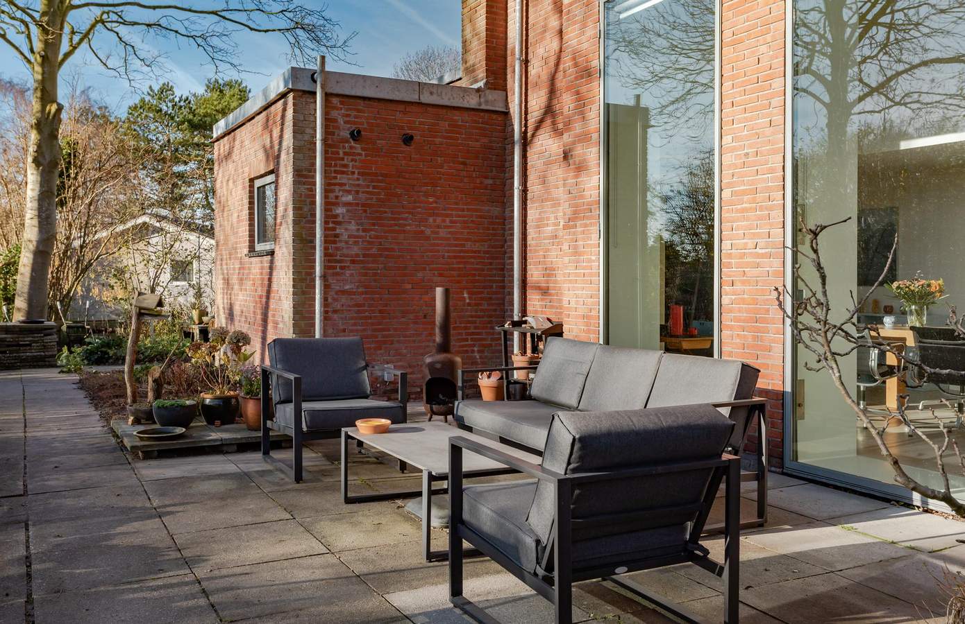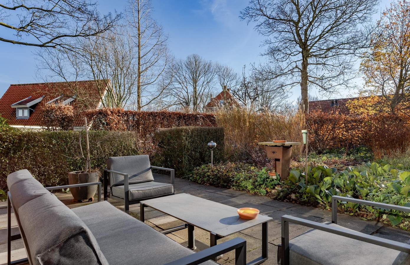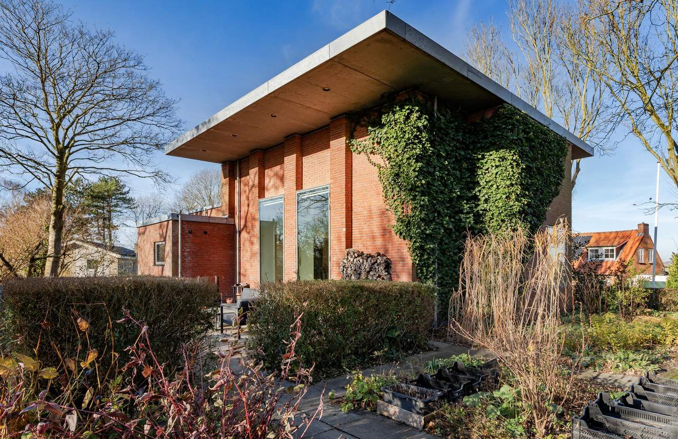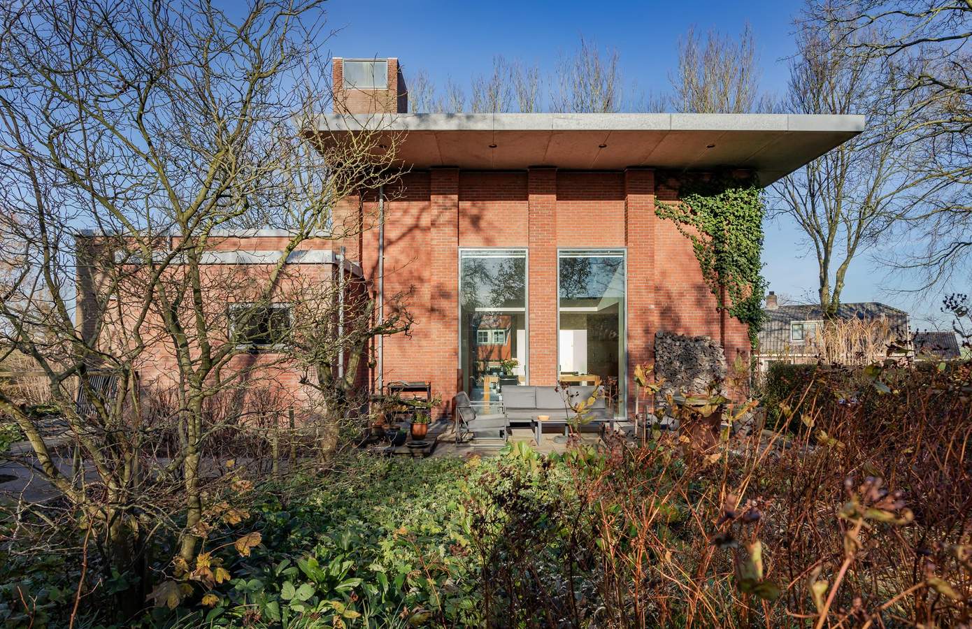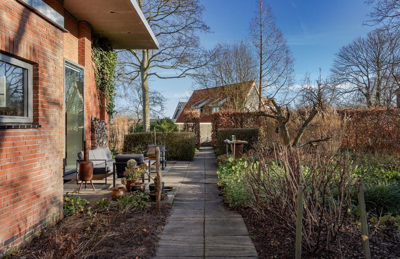 Tuin, kas en garageDe woning op de terp is rondom voorzien van een fijne, volwassen tuin van in totaal zo’n 1.500 m2. De tuin is ontworpen door Buro Mien Ruys (1904-1999), één van de belangrijkste Nederlandse tuinarchitecten uit de vorige eeuw.