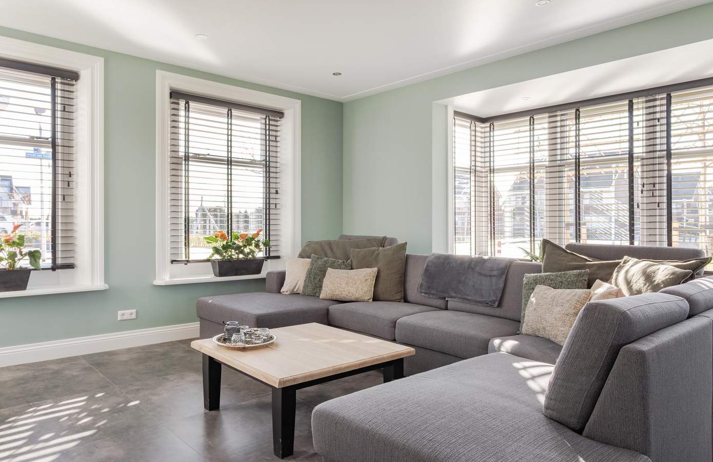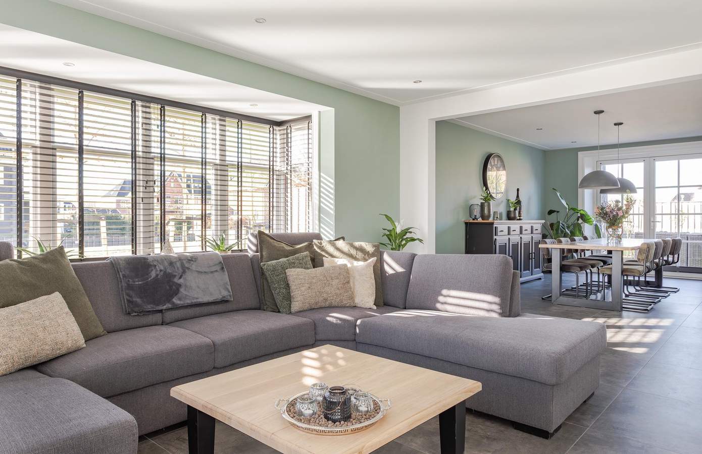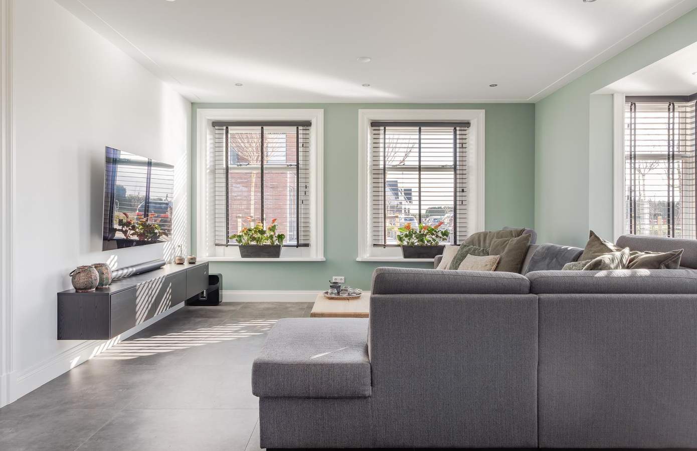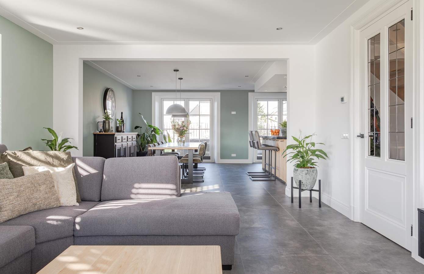 De ruime en lichte woonkamer vormt het hart van de woning. Dankzij de vele ramen aan zowel de voor- als achterzijde én de sfeervolle erker aan de zuidkant baadt de ruimte in natuurlijk daglicht. De openslaande deuren naar de achtertuin zorgen voor een prachtige verbinding tussen binnen en buiten.