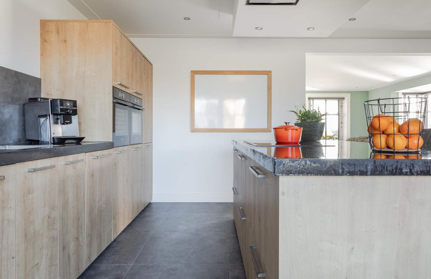 De begane grond is volledig voorzien van een luxe hardstenen tegelvloer met vloerverwarming. De keuken straalt warmte en klasse uit, met een elegant eikenhouten design en een werkblad dat met vakmanschap is gegoten in epoxy. Hier treft u hoogwaardig BOSCH-inbouwapparatuur, waaronder twee vriezers, een koelkast, een inductiekookplaat, een oven, een stoomoven en een vaatwasser – alles voor een culinaire beleving op topniveau. De inpandige garage biedt volop praktisch gemak. Hier bevindt zich niet alleen de wasruimte en de technische installatie, met een warmtepomp en een royale 500L boiler, maar ook een handige toegang naar de achtertuin.
