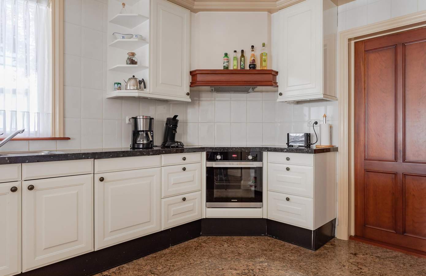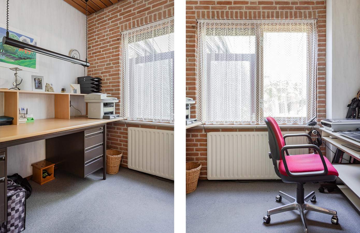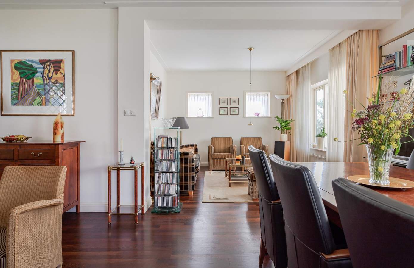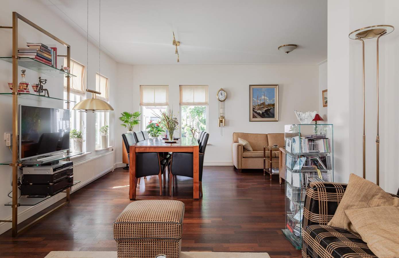 Eerst betreedt u de fraaie stoep en vervolgens een opstapje naar binnen, ‘hoog en droog’ noemen we dat. We staan in de ruime hal met leistenen vloer en vanuit hier is er toegang tot het kantoor, het ruime toilet, woonkamer en de trap naar de verdieping. De woonkamer is straatgericht met goede raampartijen voor fijne lichtinval en heeft een fraaie scheiding met de keuken. Via de keuken bereikt u de bijkeuken met eigen keukenblok en achterdeur.