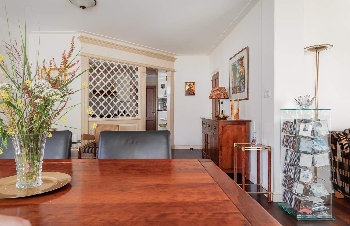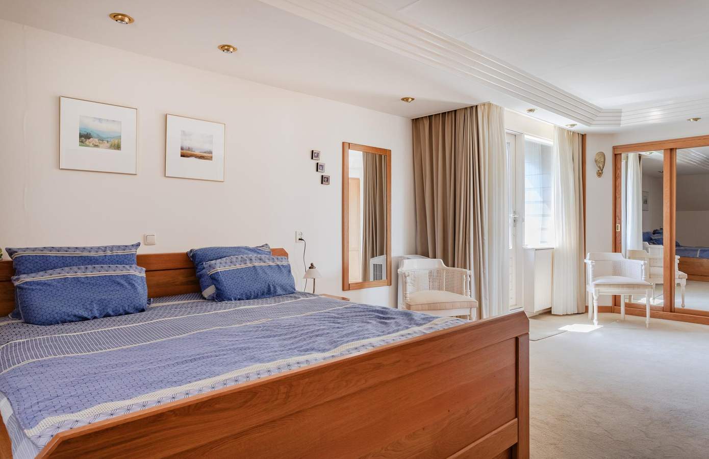 De woonkamer heeft een tropische hardhouten vloer en de keuken een natuursteen vloer. In 1979 is de woning verrijkt met een fraaie verdieping, deze is volledig bekleed met Red Cedar hout. Hier bevinden zich de badkamer, twee slaapkamers met balkon en één slaapkamer aan de achterzijde met een deur naar het platte dak. Via een vaste trap bereikt u de zolderverdieping met een vierde slaapkamer (atelier) en een technische ruimte met de CV opstelling.