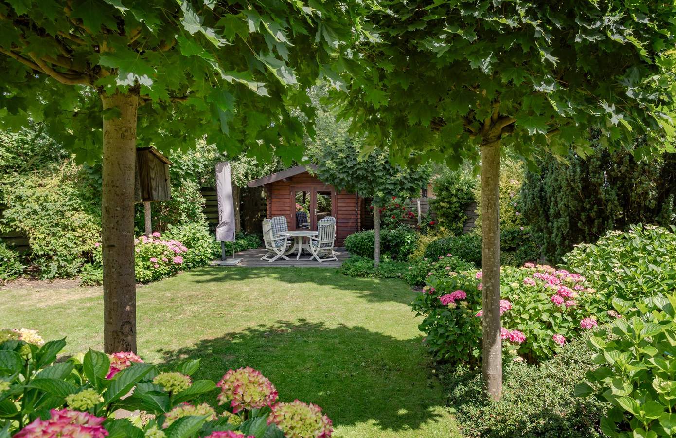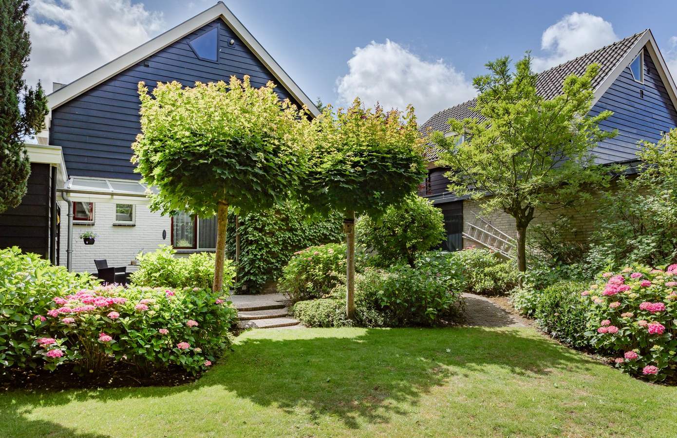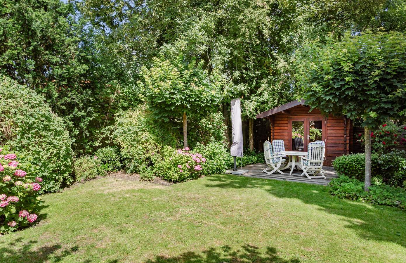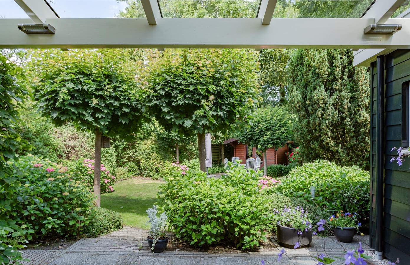 De woning heeft een fraaie verzorgde tuin, wat mooi samenkomt met de sfeer van de woning. We komen via de linkerzijpoort in de achtertuin, dan wel via de garage of de bijkeuken. De achtertuin is sfeervol ingericht met bloeiende planten en een fraaie bomensingel van drie essen- en een wilgenboom. In de tuin is een houten tuinhuis met terras voor de nodige mooie geniet momenten! Aan de achterzijde is een overkapping gemaakt, voor ook die momenten.