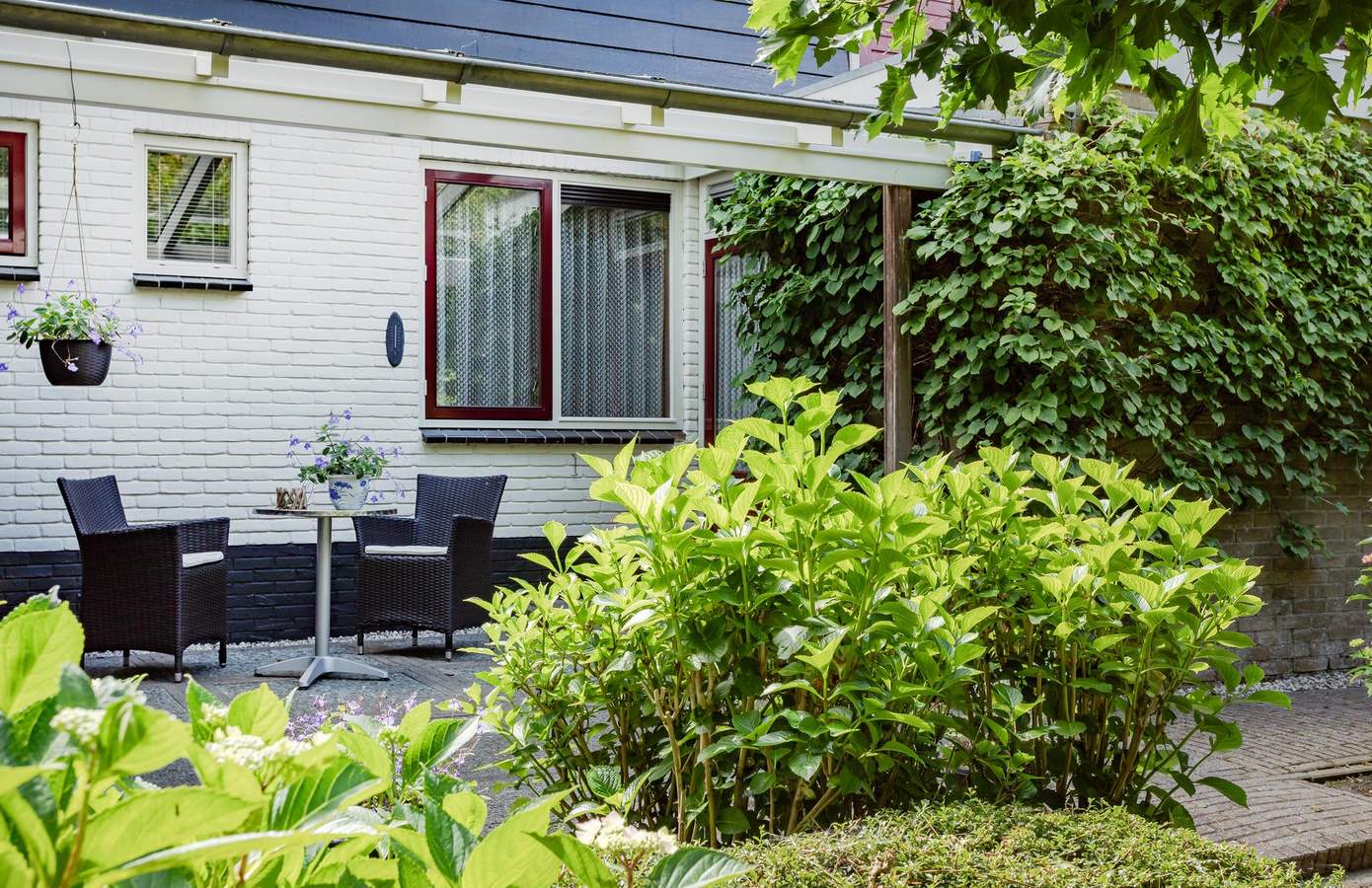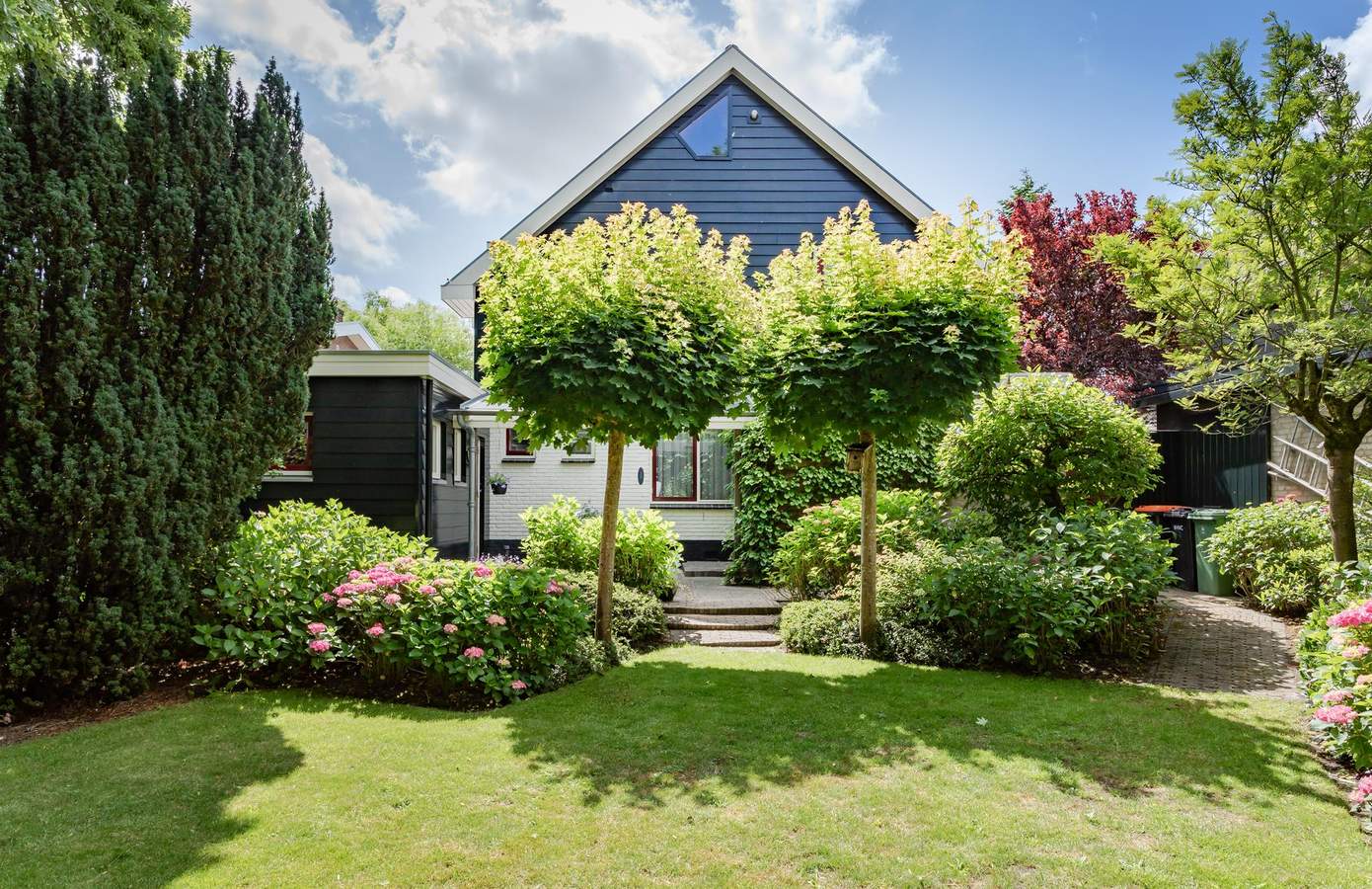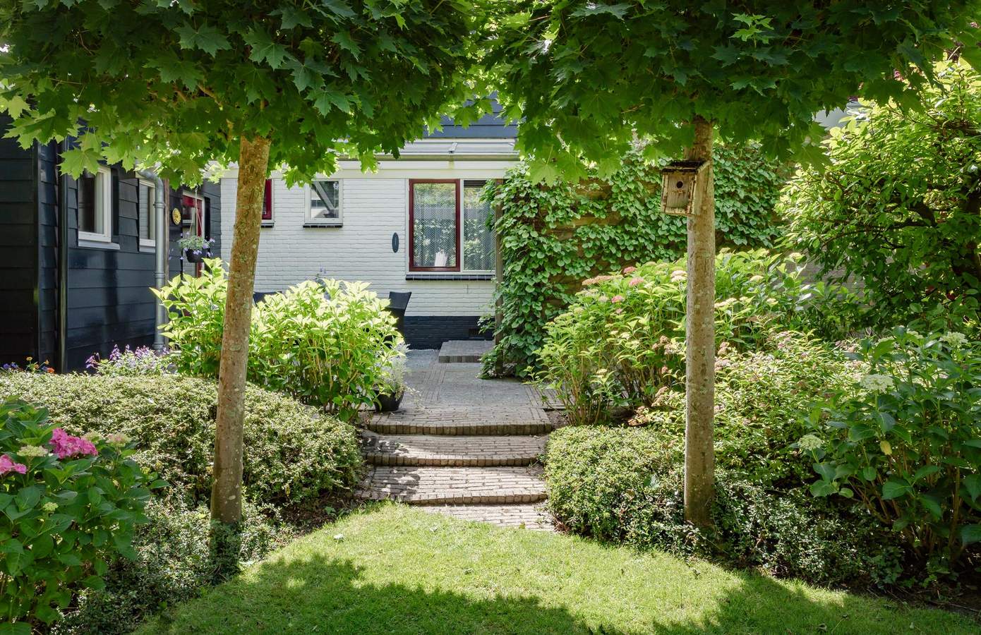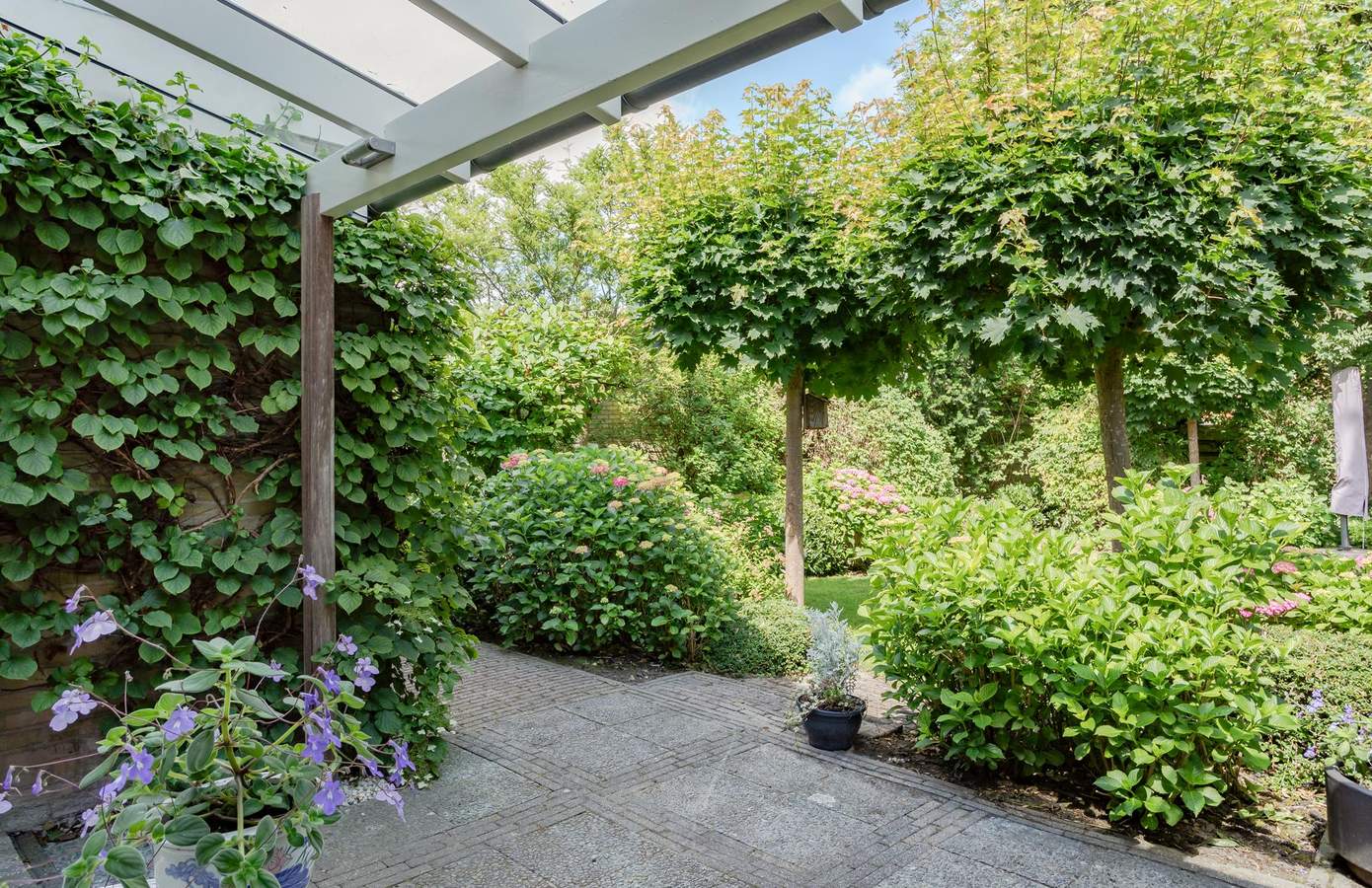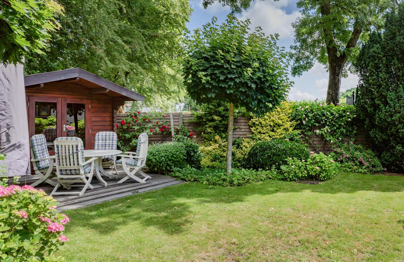 De woning heeft een fraaie verzorgde tuin, wat mooi samenkomt met de sfeer van de woning. We komen via de linkerzijpoort in de achtertuin, dan wel via de garage of de bijkeuken. De achtertuin is sfeervol ingericht met bloeiende planten en een fraaie bomensingel van drie essen- en een wilgenboom. In de tuin is een houten tuinhuis met terras voor de nodige mooie geniet momenten! Aan de achterzijde is een overkapping gemaakt, voor ook die momenten.