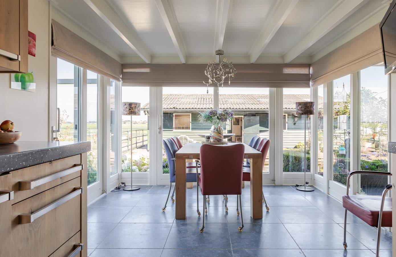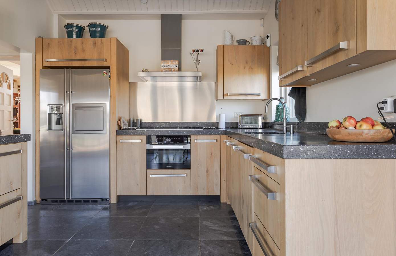 Bij binnenkomst via de veranda aan de achterzijde wordt u verwelkomd in een hal met aangrenzende bijkeuken, voorzien van aansluitingen voor wasmachine en droger. Aan uw rechterhand vindt u de sfeervolle keuken, die dankzij de twee schuifpuien baadt in het licht en een panoramisch uitzicht biedt op de tuin. De keuken, een meesterwerk van ambachtelijk vakmanschap door Fred Constant uit Wormerveer, is het centrale middelpunt van het huis. Voorzien van een handgemaakt houten interieur, een luxueus granieten werkblad en alle moderne inbouwapparatuur, waaronder een Quooker, inductiekookplaat en een royale Amerikaanse koelkast, vormt deze ruimte een heerlijke plek voor een kopje koffie in de ochtend of om ’s avonds gezellig samen te eten.