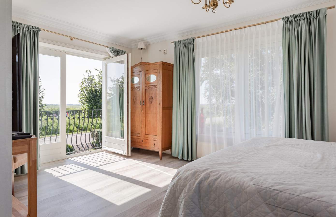 De open trap in de woonkamer leidt naar de eerste verdieping, waar de luxueuze masterbedroom met een Frans balkon zich bevindt. Hier opent u de dubbele deuren en wordt u iedere ochtend wakker met een fantastisch uitzicht op het water en de uitgestrekte weilanden. De en suite badkamer is uitgevoerd met een inloopdouche, een toilet en een stijlvol wastafelmeubel met dubbele wastafels. Twee extra kamers bieden volop mogelijkheden, waarvan één in gebruik is als kledingkamer en de andere als een comfortabel thuiskantoor. De overloop is praktisch ingericht met inbouwkasten voor extra opbergruimte.
