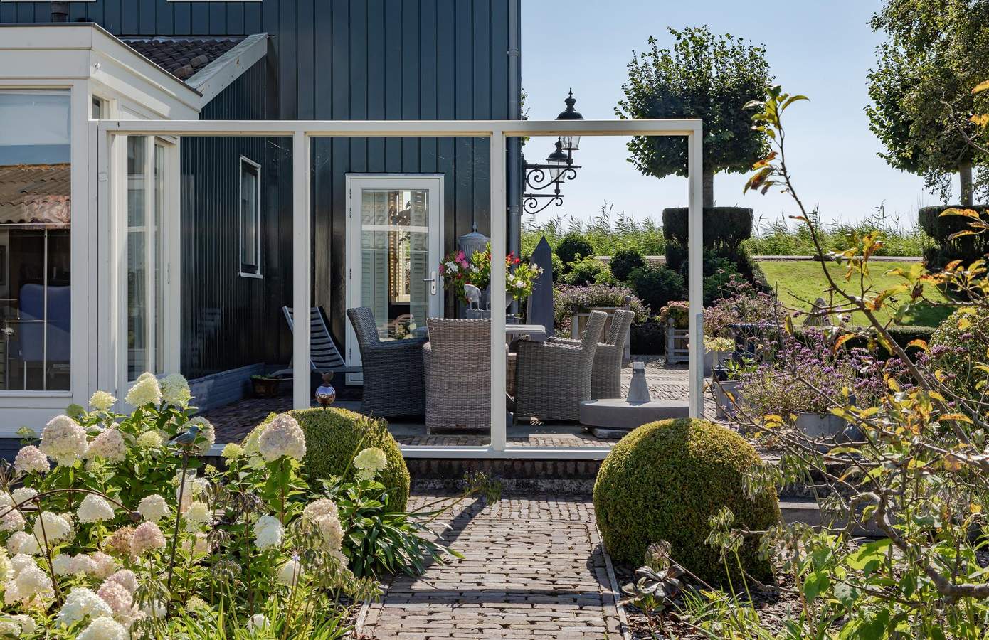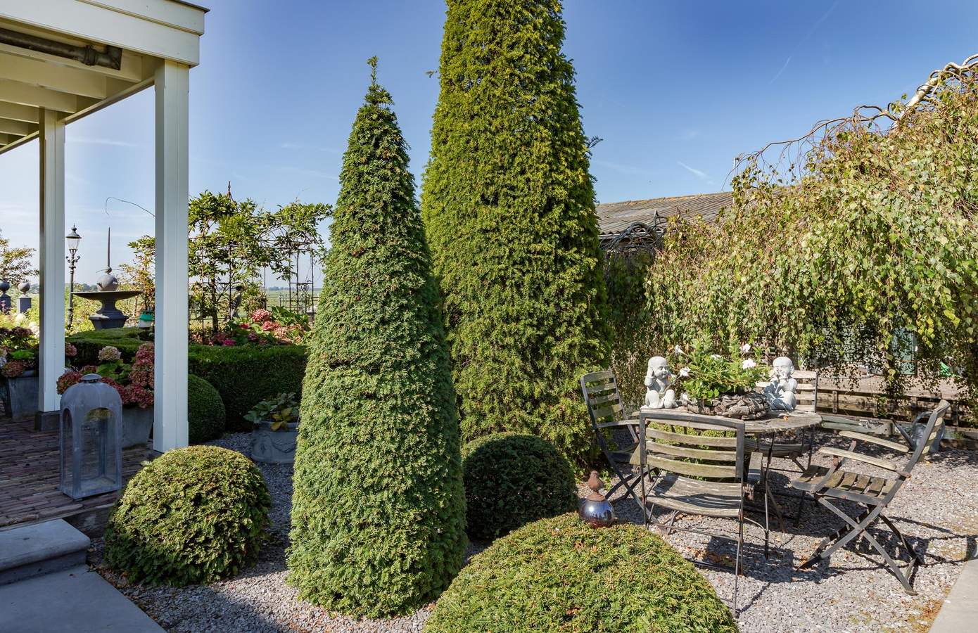 De tuin is werkelijk een lust voor het oog. Met een zorgvuldig aangelegd ontwerp, inclusief waterpartijen, bruggetjes, weelderige borders en meerdere terrassen, biedt deze buitenruimte tal van plekken om te ontspannen en te genieten van het buitenleven. De veranda bij de keuken vormt een idyllisch plekje om te ontbijten in de ochtendzon of te genieten van lange zomeravonden met familie en vrienden.