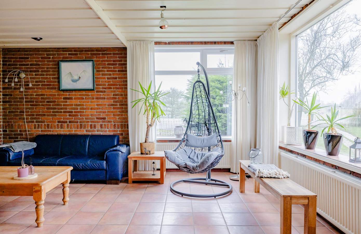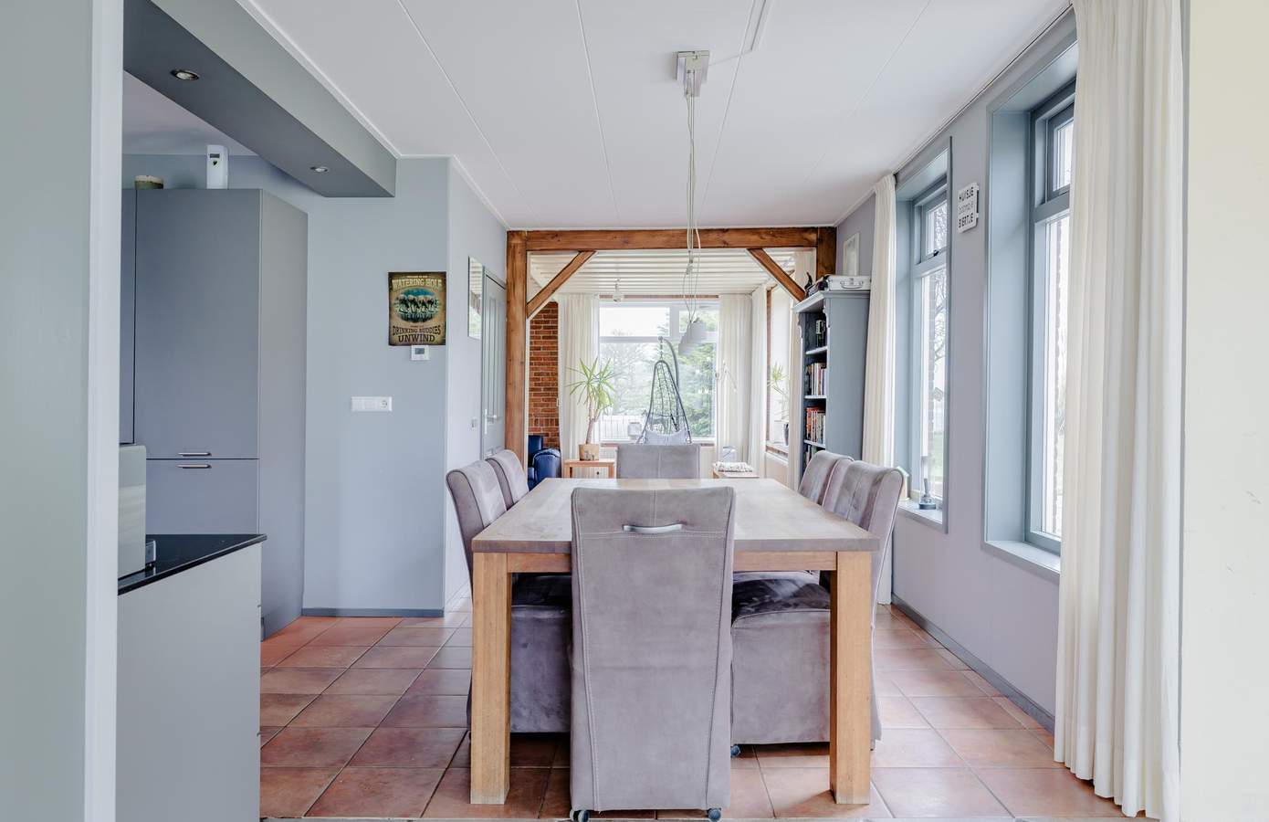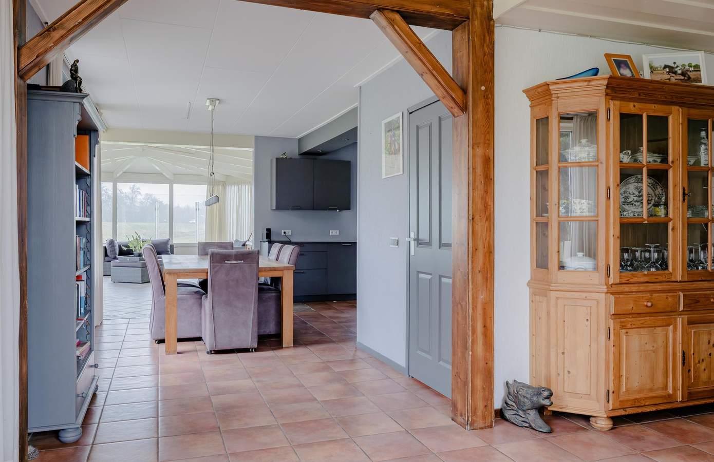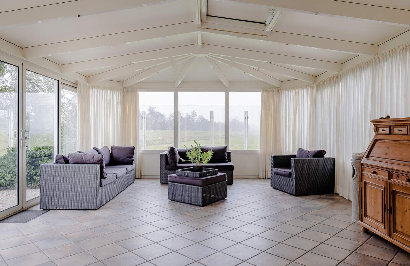 De serre, met grote raampartijen, vormt een natuurlijke overgang tussen binnen en buiten. Vanuit hier heeft u zicht op de tuin en het erf en kunt u het buitenseizoen optimaal verlengen. De tuin leent zich uitstekend voor het creëren van meerdere zitplekken, het aanleggen van terrassen of het verder vergroenen van het perceel.
