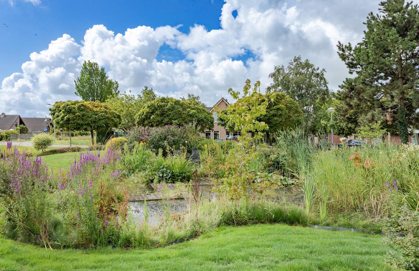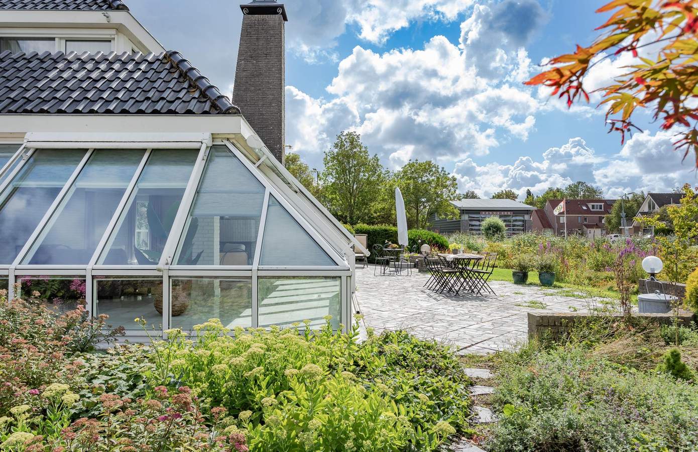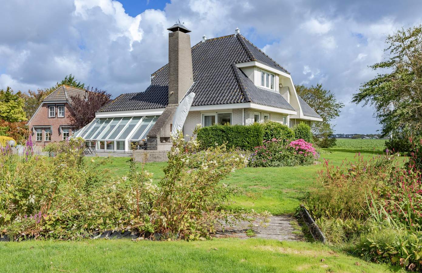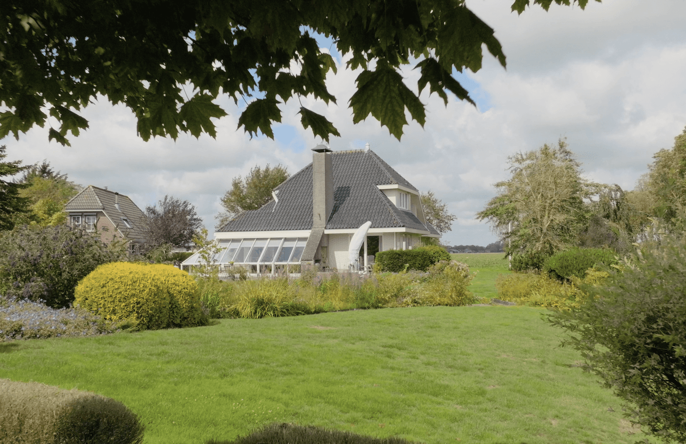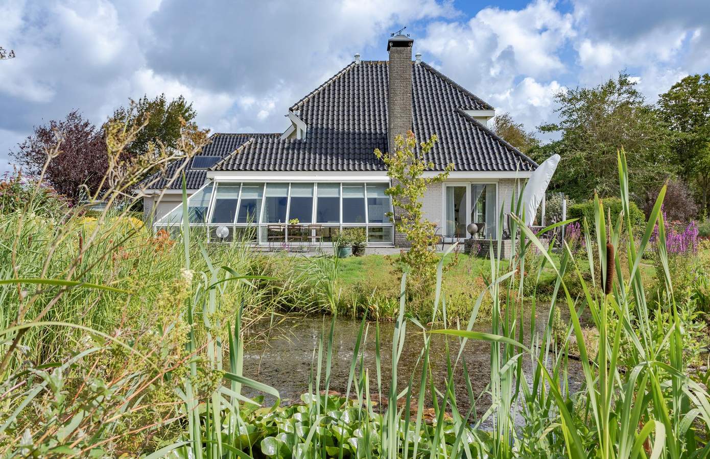 De tuin rondom de woning is onder architectuur aangelegd. Weelderige planten en een grote vijver. Het grote terras rondom de woning zorgen voor elk moment van de dag zon, maar ook zeker schaduw. Vanuit de achterkant van de woning een prachtig uitzicht op de uitgestrekte weilanden.