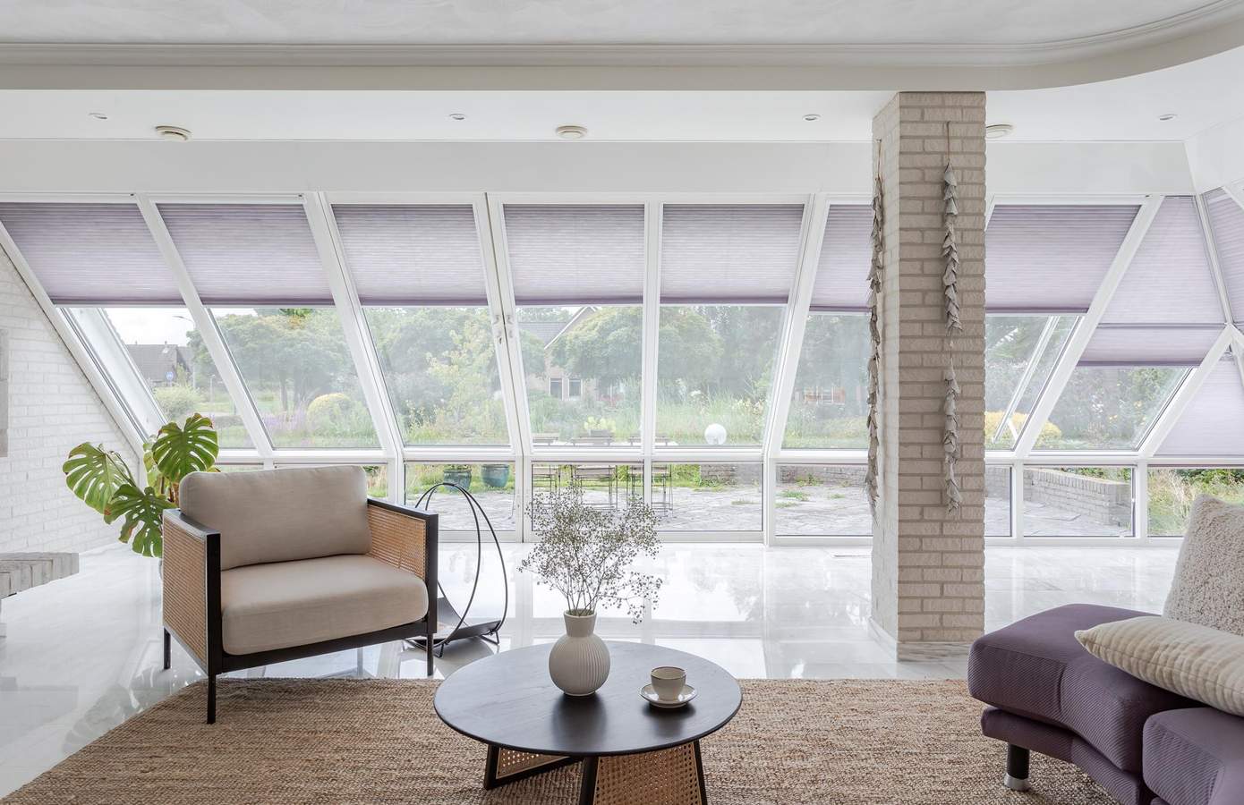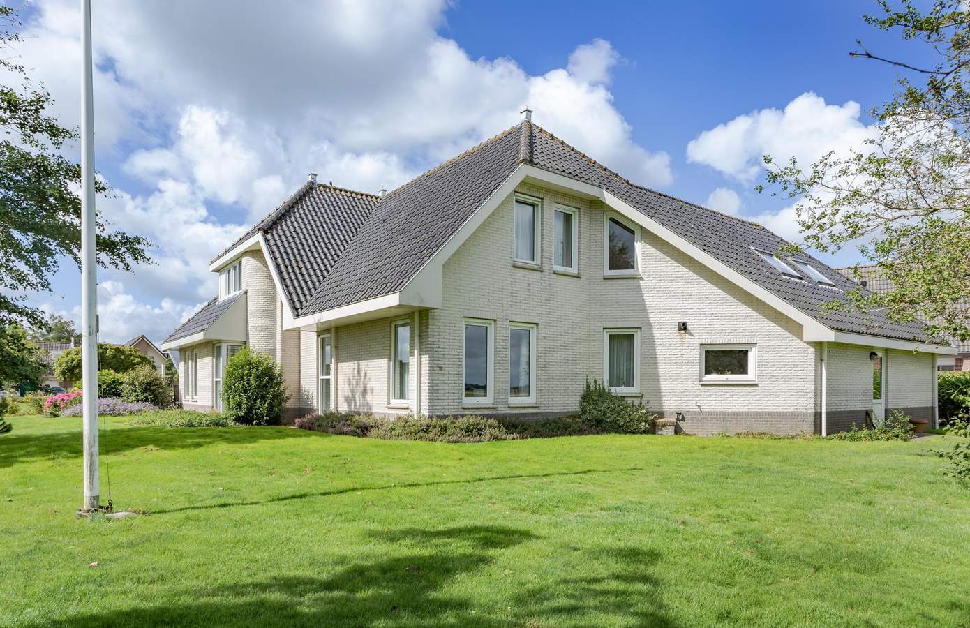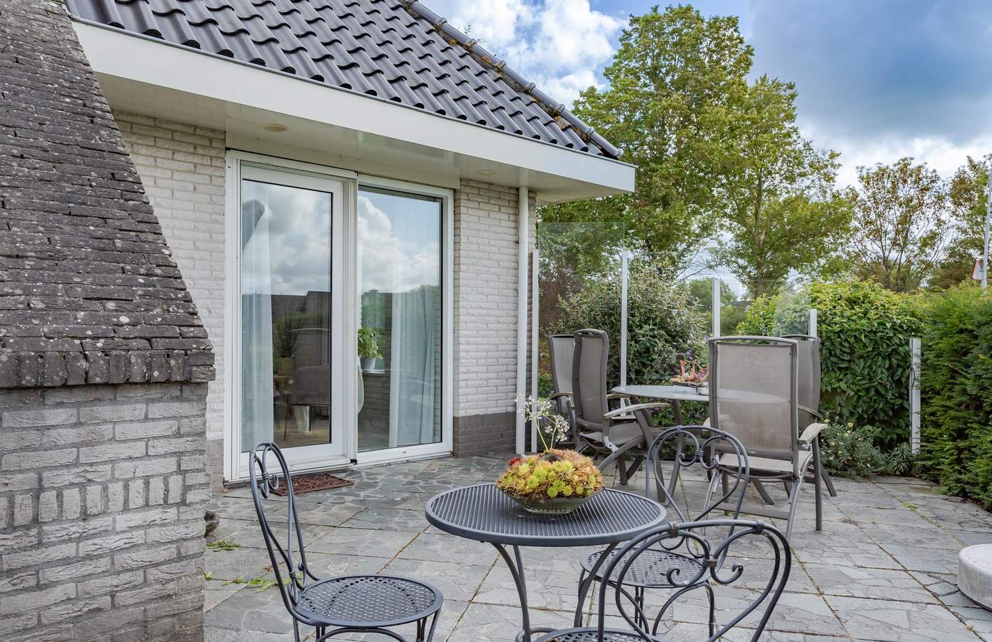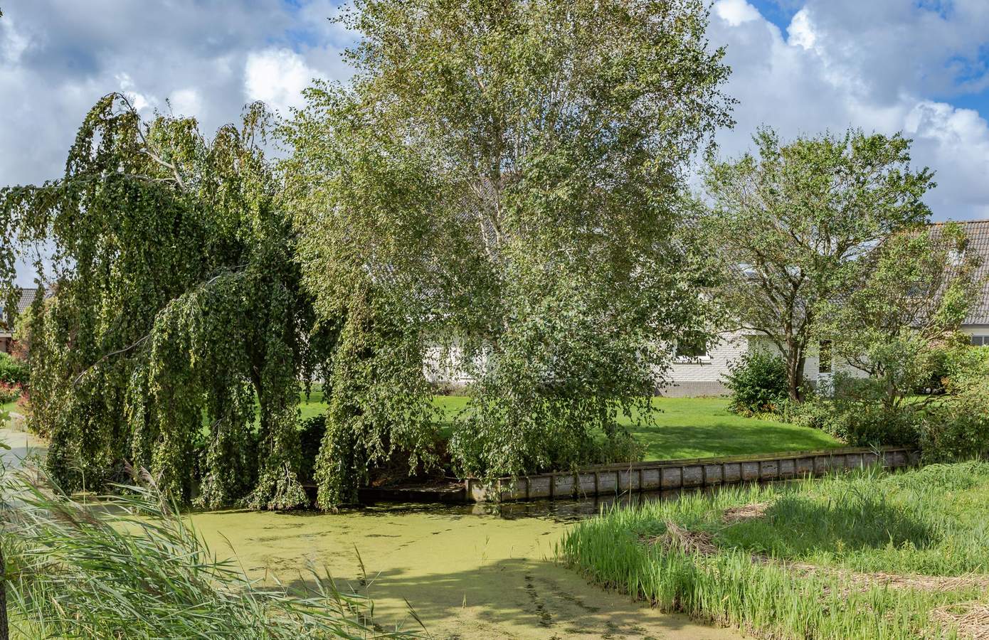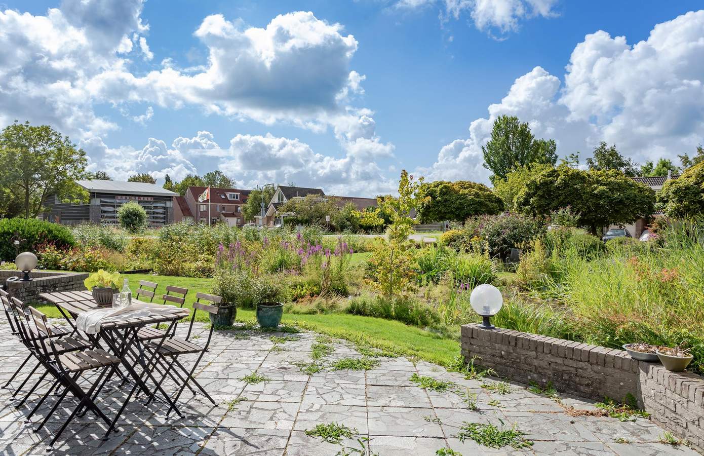 De tuin rondom de woning is onder architectuur aangelegd. Weelderige planten en een grote vijver. Het grote terras rondom de woning zorgen voor elk moment van de dag zon, maar ook zeker schaduw. Vanuit de achterkant van de woning een prachtig uitzicht op de uitgestrekte weilanden.