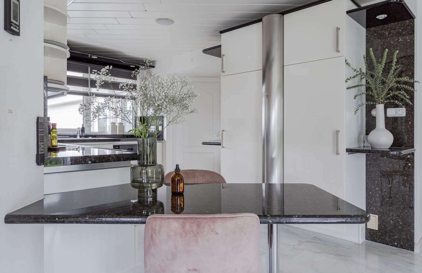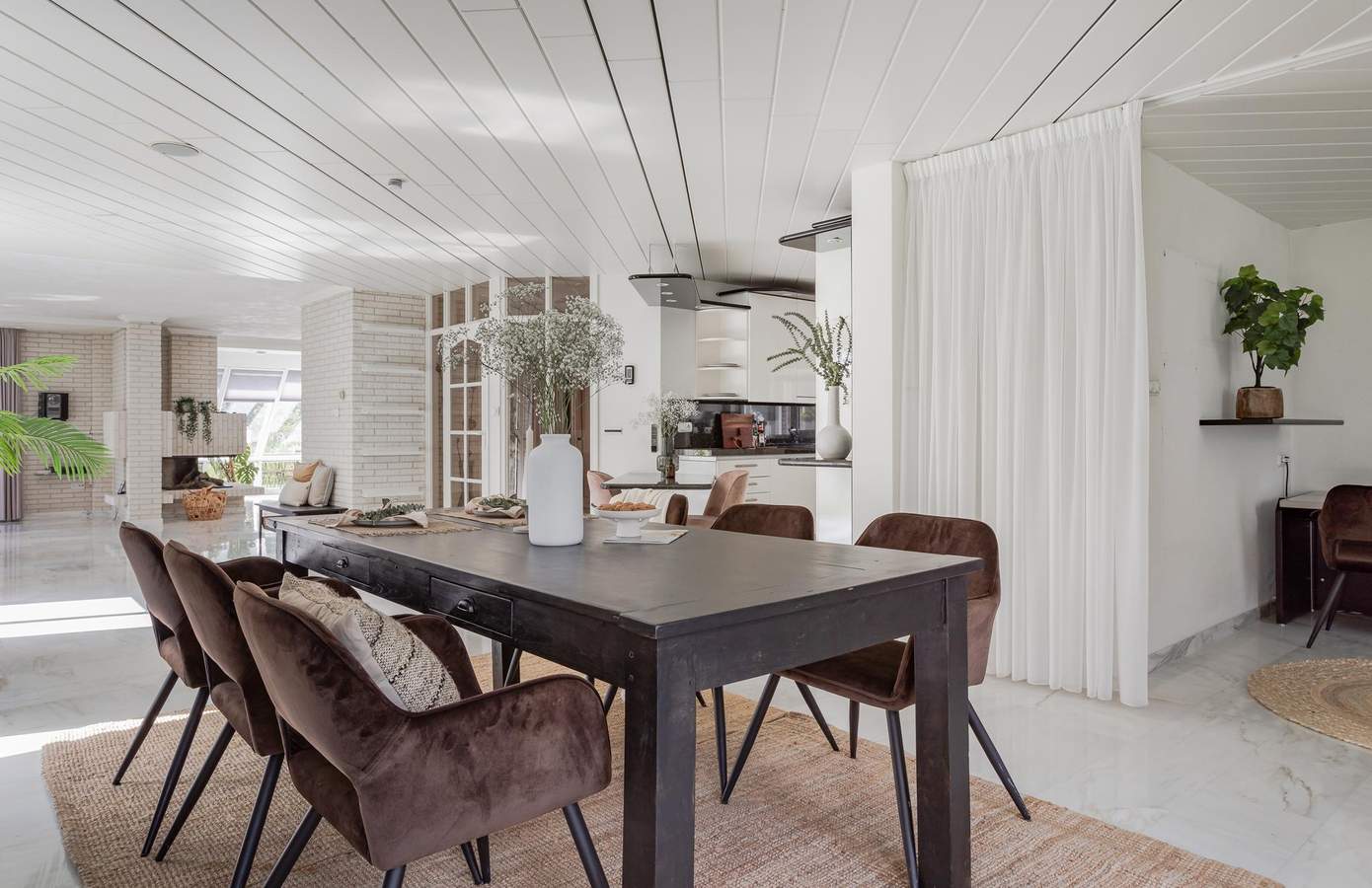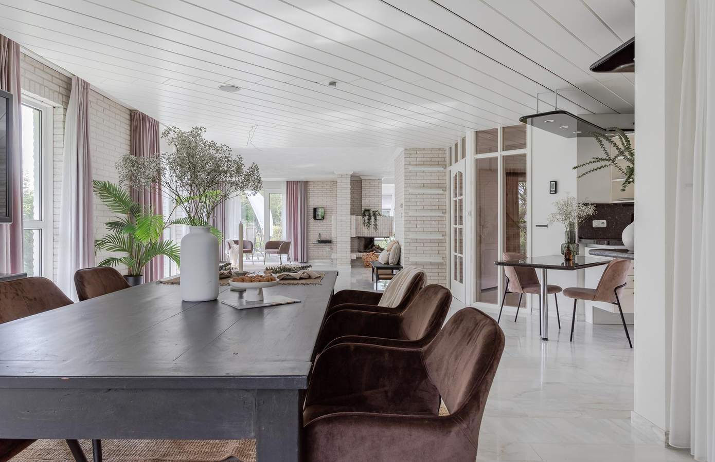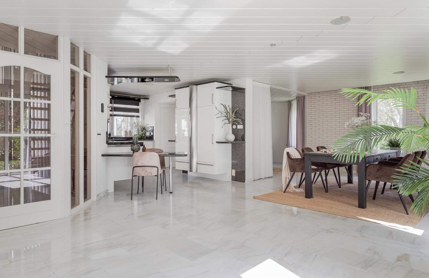De hal is al een mooi binnenkomen. De hoogte, de vide en de open trap naar boven geven een ruimtelijk gevoel. De bouwstijl en afwerking verwijzen direct naar het bouwjaar (1991) van de woning. Over de gehele begane grond ligt een plavuizen vloer met heteluchtverwarming. Een fijne woonkamer met verschillende zithoekjes, een openkeuken, een haard en een luxe serre. De ramen in de serre zijn voorzien van automatische zonwering. Door de vele raampartijen rondom is er veel natuurlijk lichtinval in de woonkamer. Vanuit de keuken loopt u via de bijkeuken naar de inpandige garage. Deze is goed geïsoleerd, geeft ruimte aan twee auto’s en is voorzien van een elektrische garagedeur.