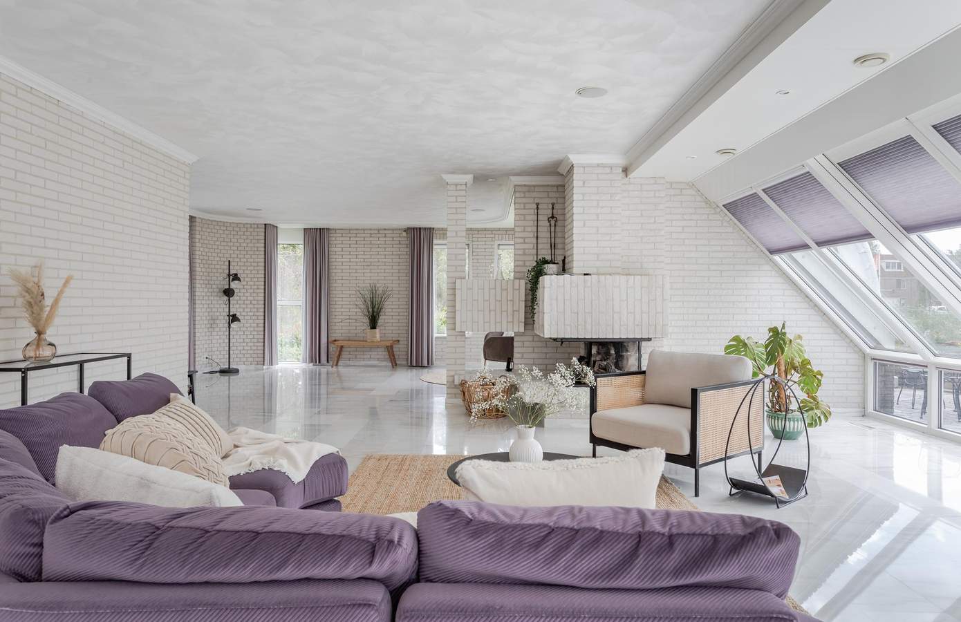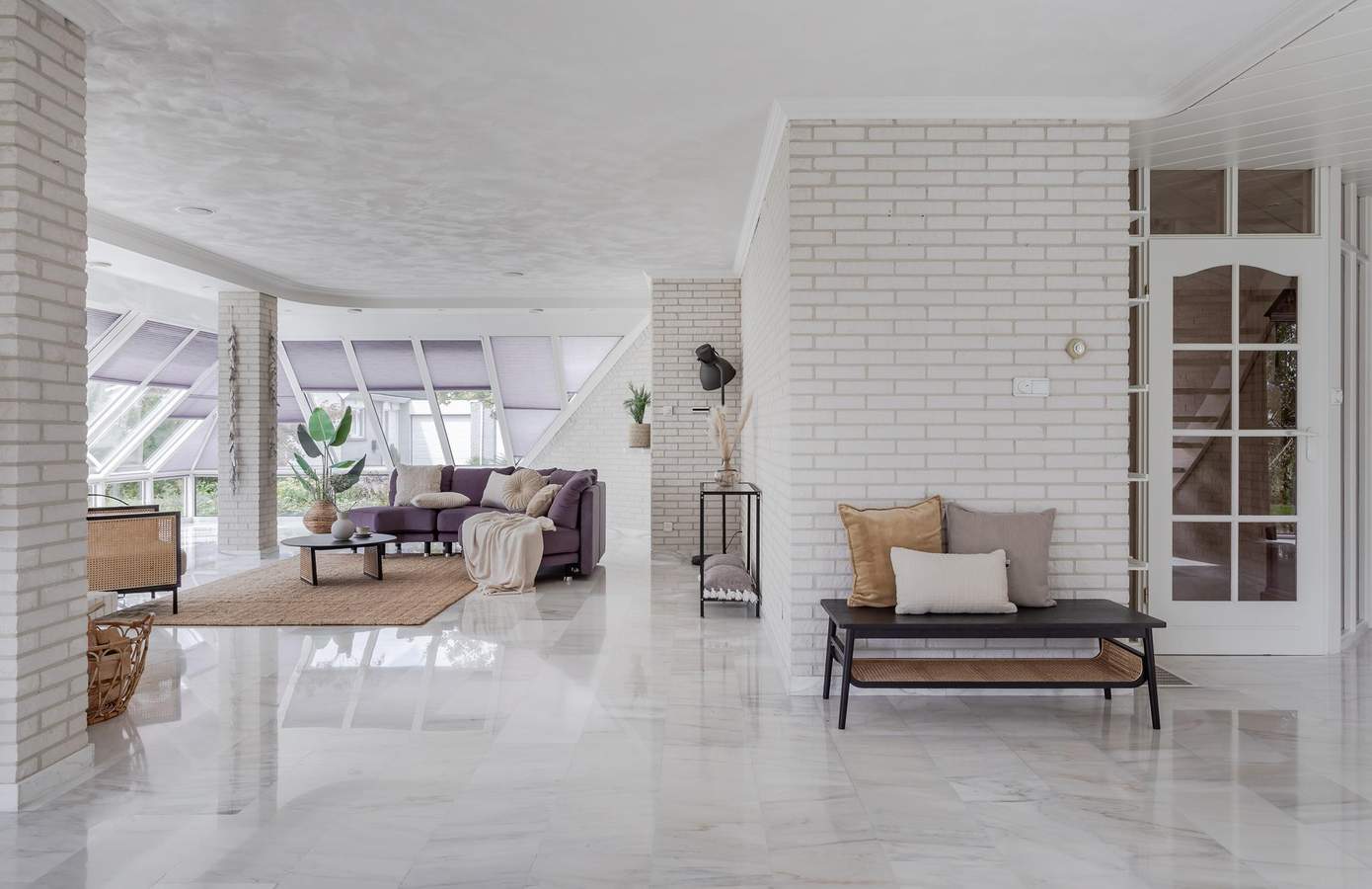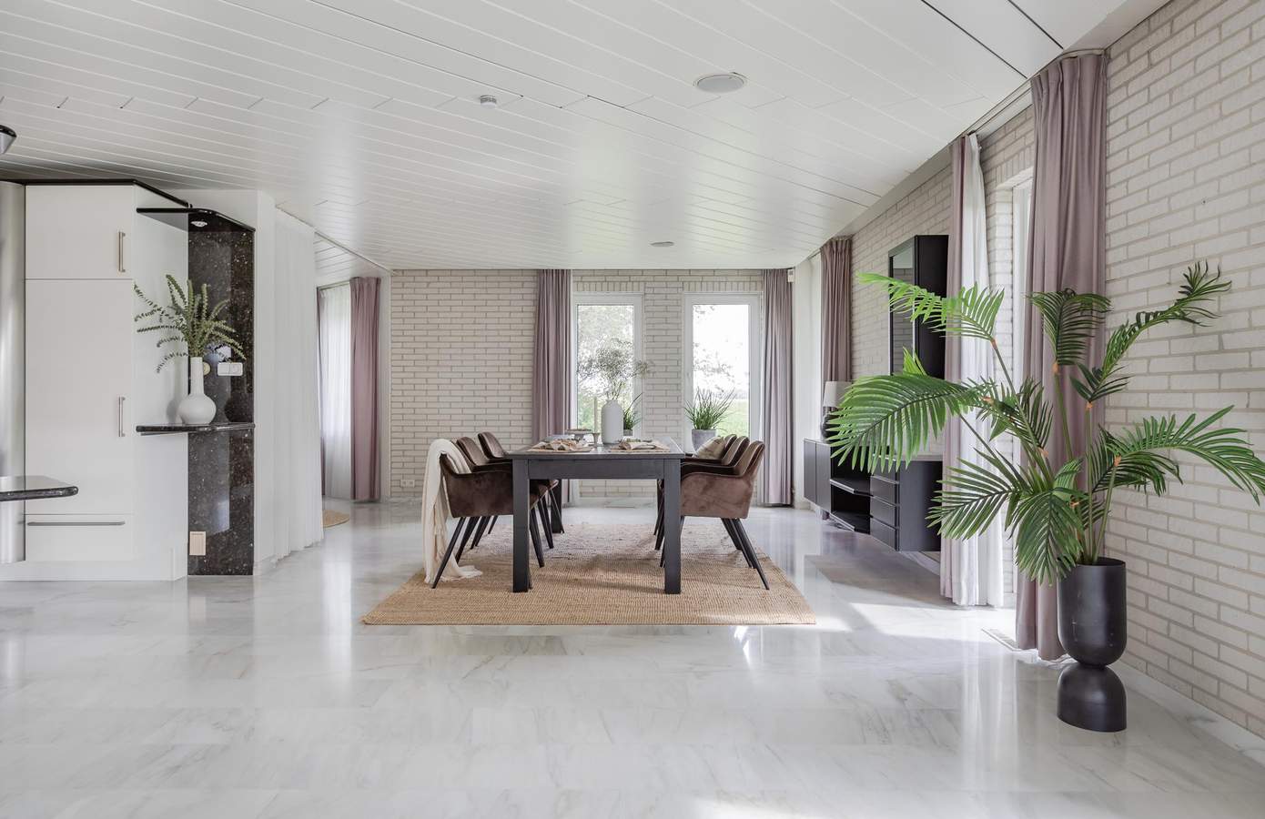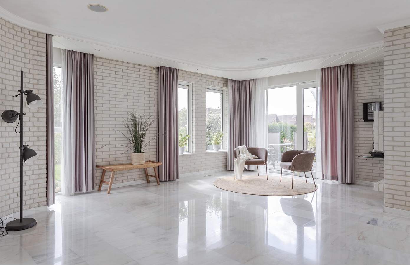 De hal is al een mooi binnenkomen. De hoogte, de vide en de open trap naar boven geven een ruimtelijk gevoel. De bouwstijl en afwerking verwijzen direct naar het bouwjaar (1991) van de woning. Over de gehele begane grond ligt een plavuizen vloer met heteluchtverwarming. Een fijne woonkamer met verschillende zithoekjes, een openkeuken, een haard en een luxe serre. De ramen in de serre zijn voorzien van automatische zonwering. Door de vele raampartijen rondom is er veel natuurlijk lichtinval in de woonkamer. Vanuit de keuken loopt u via de bijkeuken naar de inpandige garage. Deze is goed geïsoleerd, geeft ruimte aan twee auto’s en is voorzien van een elektrische garagedeur.