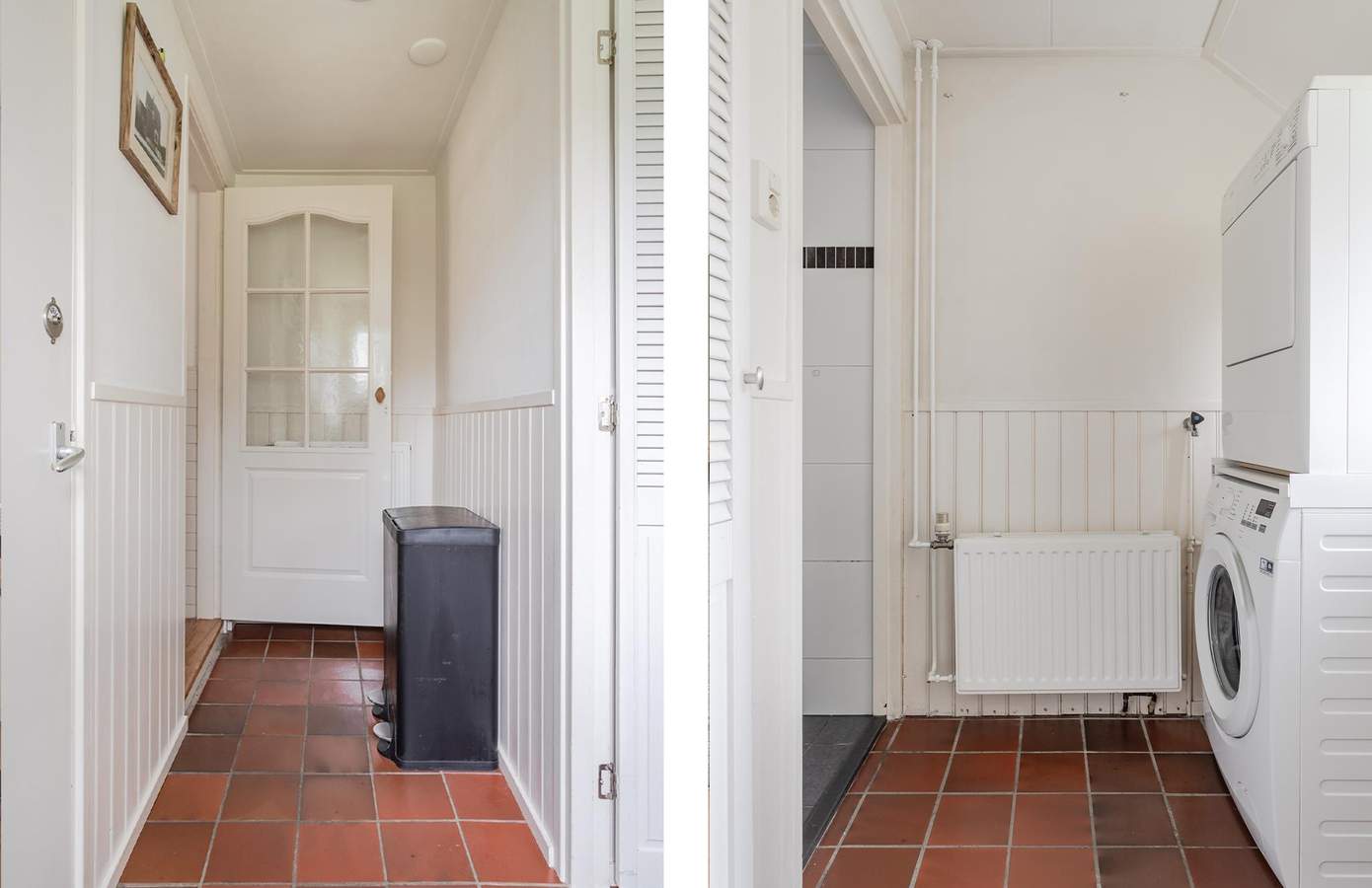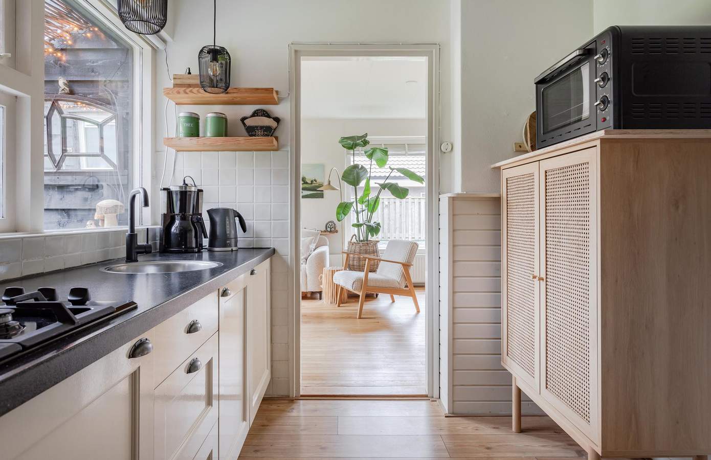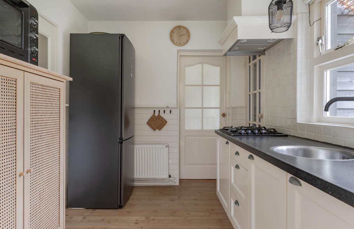 Via de ruime entree komt u binnen in de woning. Hier bevindt zich de trap naar boven, een praktische kelderkast en de plek voor de cv-ketel. Vanuit de entree komt u in de keuken, die centraal in de woning is gelegen. De keuken is compact van opzet, maar functioneel ingericht met een gaskookplaat, een vaatwasmachine en een breed raam dat uitzicht biedt op de tuin. Rechts van de keuken bevindt zich de woonkamer, een sfeervolle en lichte ruimte dankzij de grote ramen en openslaande deuren naar de tuin. Hier smelten binnen en buiten moeiteloos samen, wat een heerlijk gevoel van ruimte en verbinding creëert. Vanuit de keuken heeft u toegang tot een hal waar zich het toilet bevindt. In deze hal vindt u ook de badkamer op de begane grond, uitgerust met aansluitingen voor een wasmachine en droger. Bovendien is er een extra vliering bereikbaar en een loopdeur die leidt naar de achtertuin.