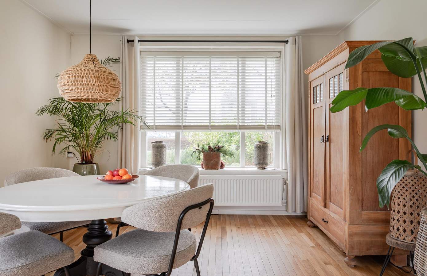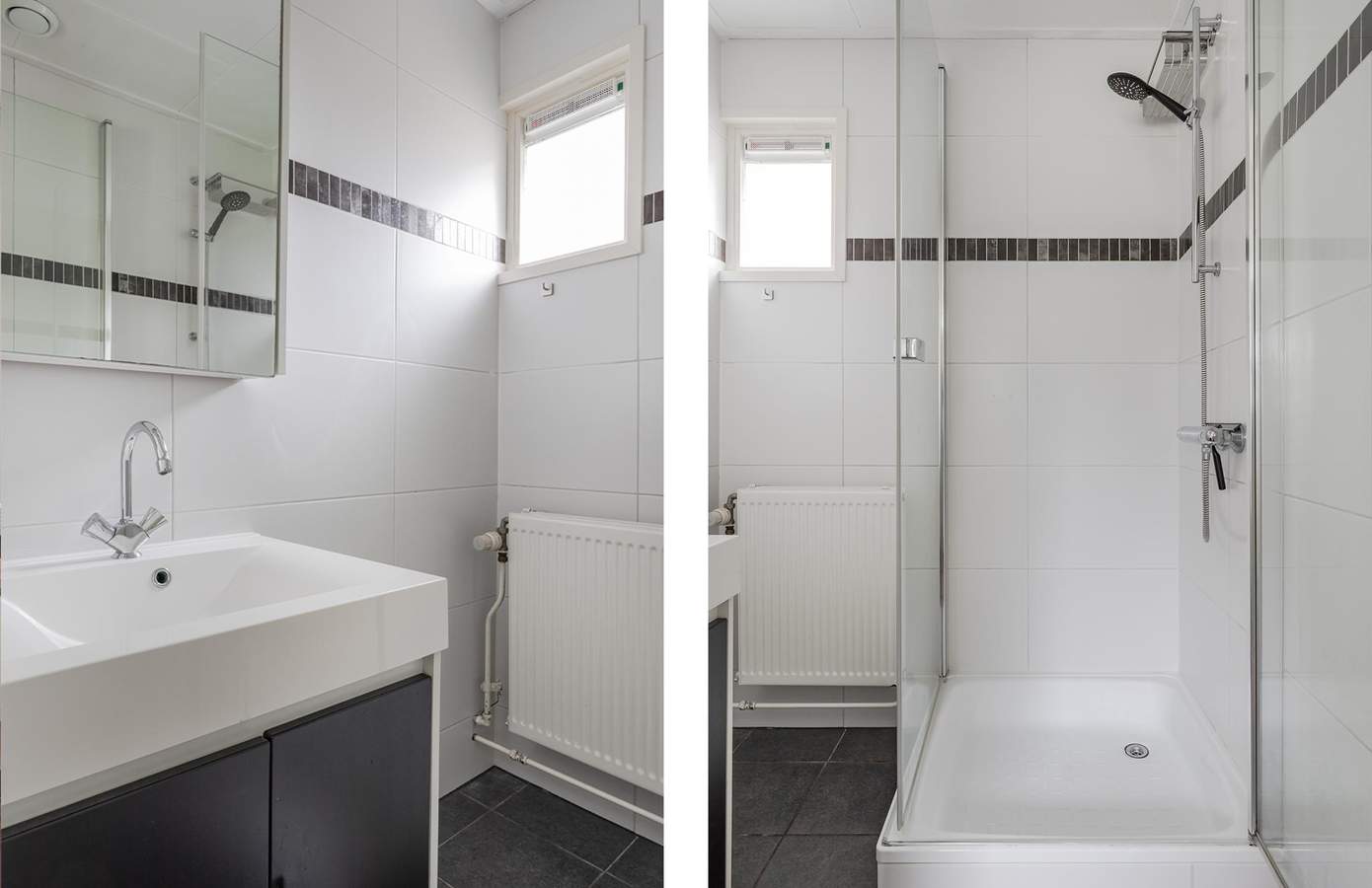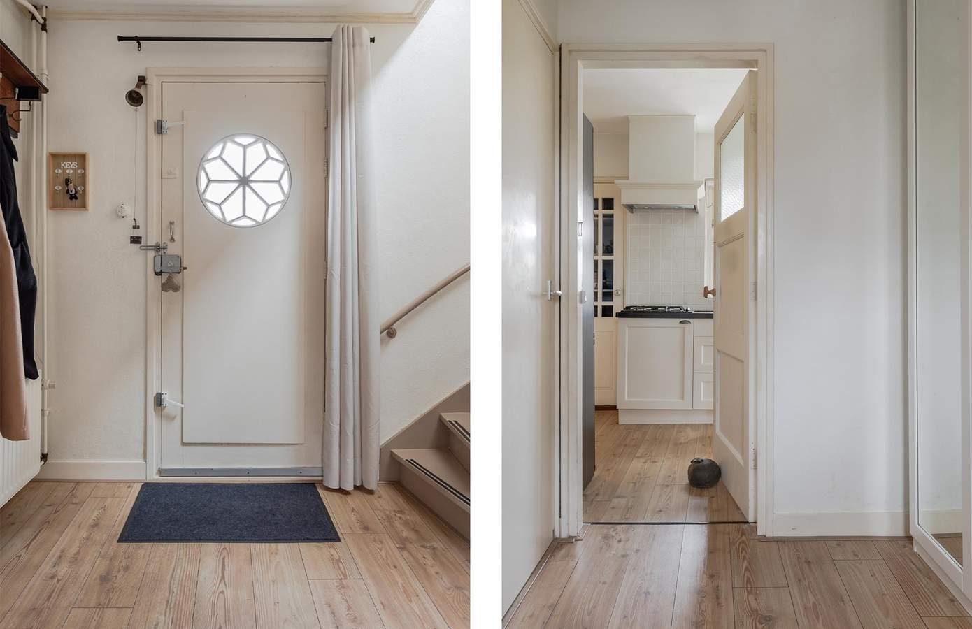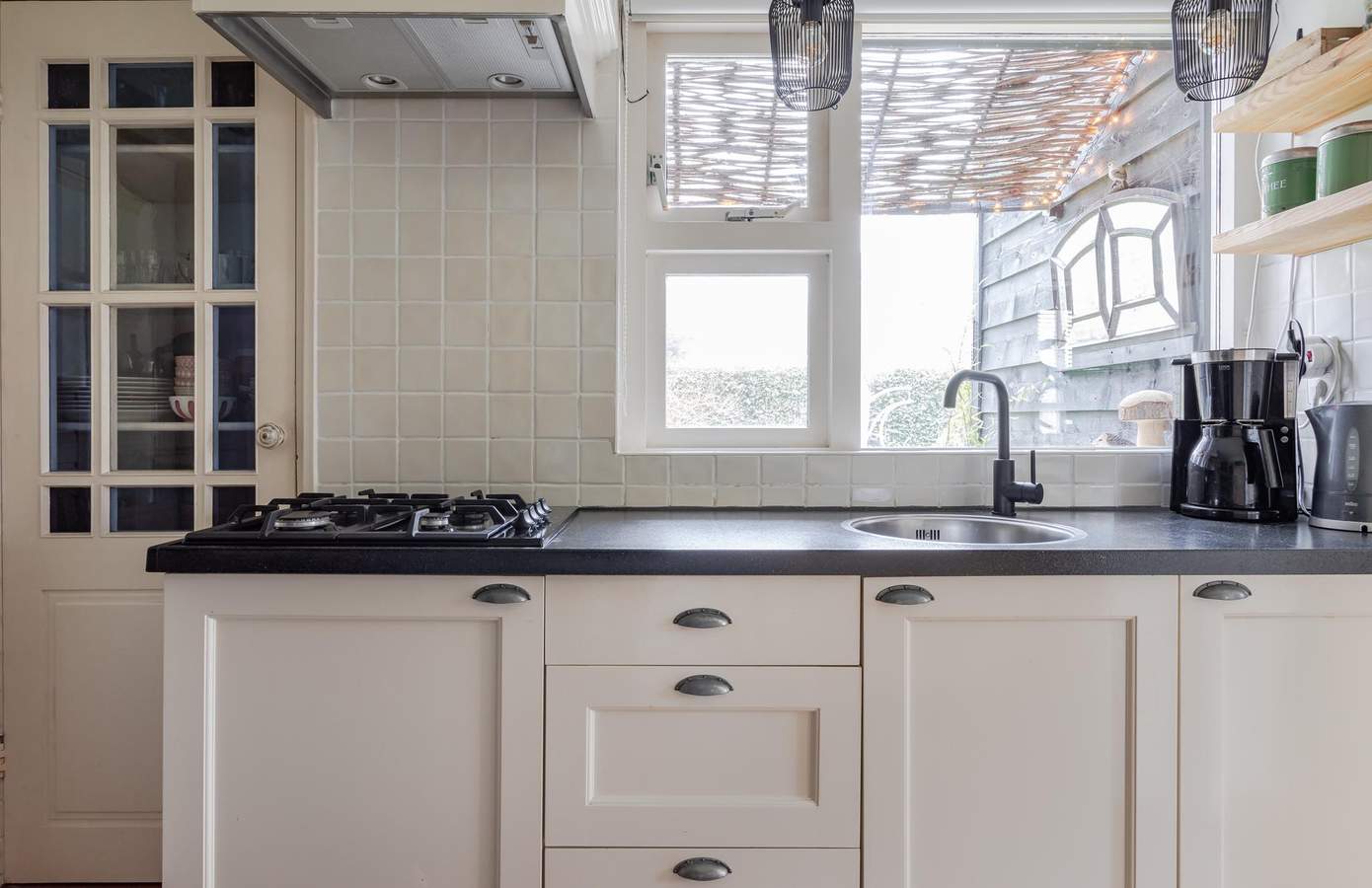 Via de ruime entree komt u binnen in de woning. Hier bevindt zich de trap naar boven, een praktische kelderkast en de plek voor de cv-ketel. Vanuit de entree komt u in de keuken, die centraal in de woning is gelegen. De keuken is compact van opzet, maar functioneel ingericht met een gaskookplaat, een vaatwasmachine en een breed raam dat uitzicht biedt op de tuin. Rechts van de keuken bevindt zich de woonkamer, een sfeervolle en lichte ruimte dankzij de grote ramen en openslaande deuren naar de tuin. Hier smelten binnen en buiten moeiteloos samen, wat een heerlijk gevoel van ruimte en verbinding creëert. Vanuit de keuken heeft u toegang tot een hal waar zich het toilet bevindt. In deze hal vindt u ook de badkamer op de begane grond, uitgerust met aansluitingen voor een wasmachine en droger. Bovendien is er een extra vliering bereikbaar en een loopdeur die leidt naar de achtertuin.
