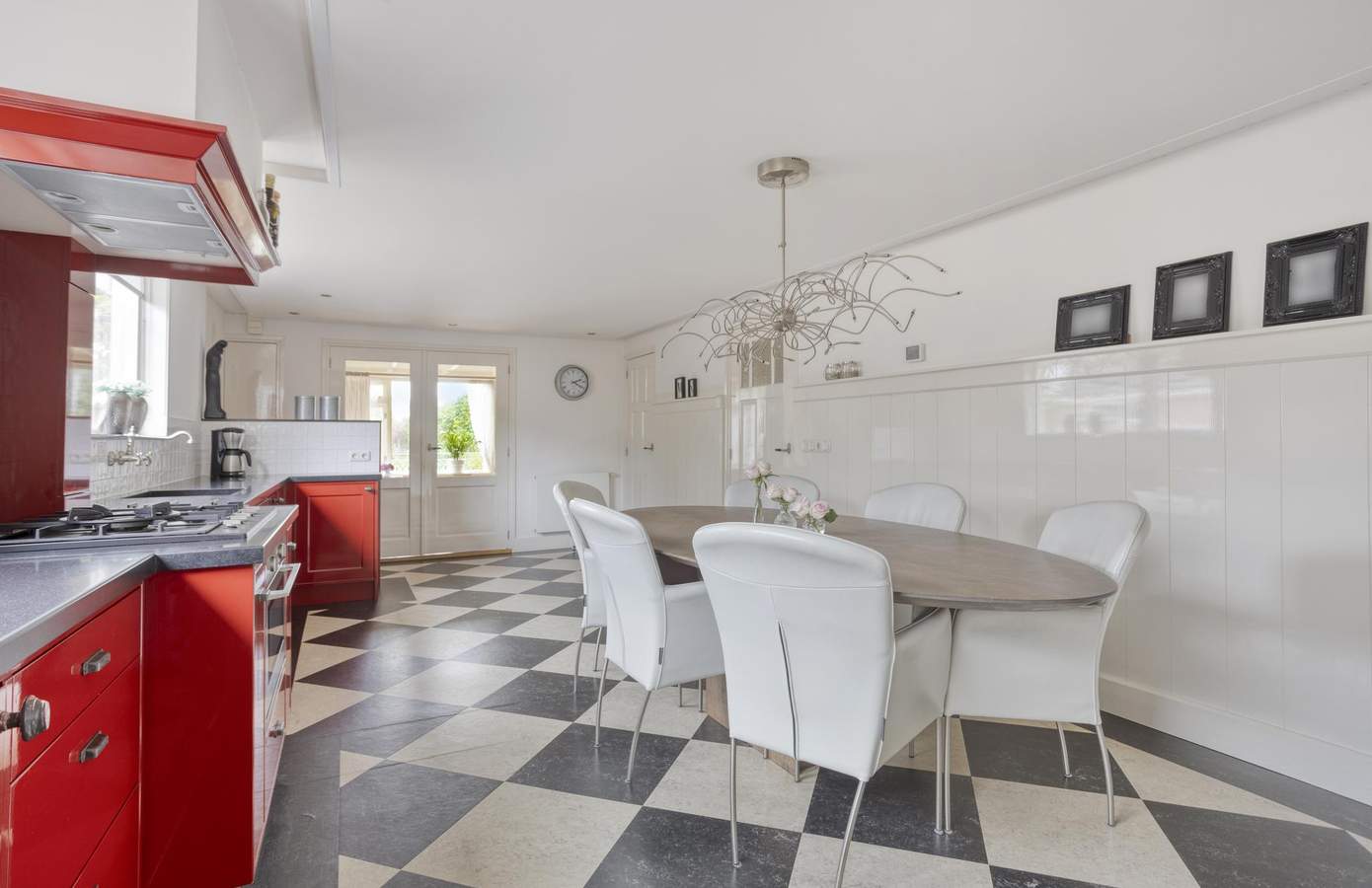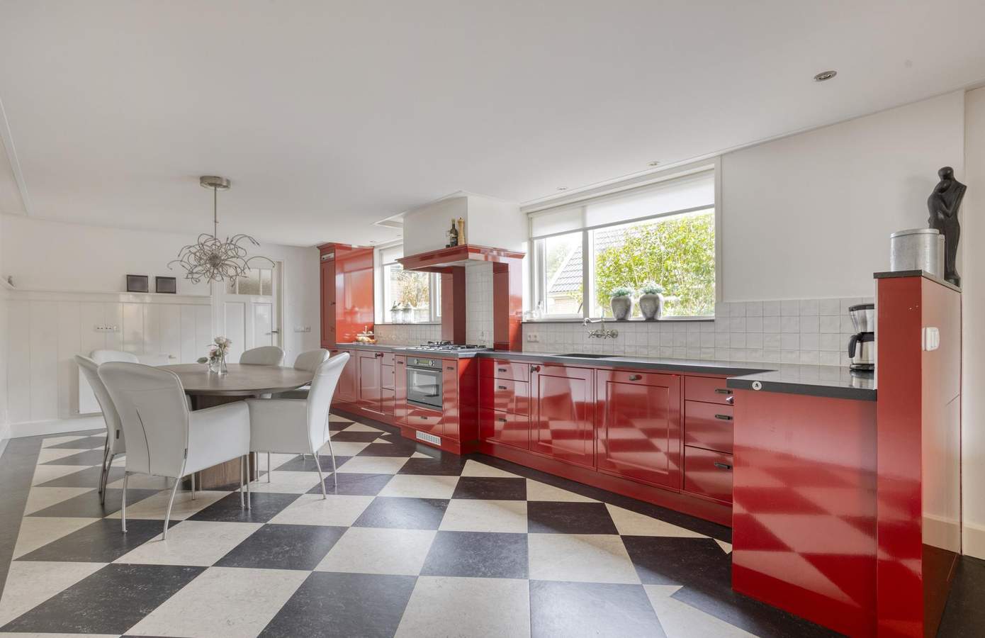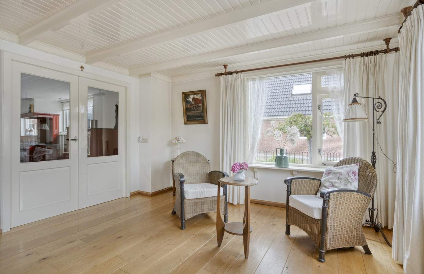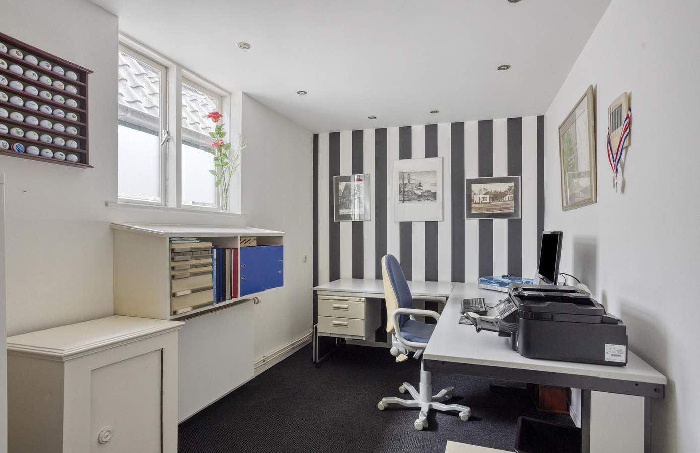 Via de zijentree komt u binnen in de ruime hal met toilet. U komt vanuit de hal in de royale woonkeuken, het kloppend hart van het huis. Hier vandaan bereikt u de sfeervolle woonkamer, waar de houten vloer, het balkenplafond en de grote raampartijen direct de aandacht trekken. De gashaard vormt het warme middelpunt van de ruimte en zorgt voor een uitnodigende, huiselijke sfeer. Aan de achterzijde van de woning vindt u de royale tuinkamer van circa 30 m². Dankzij de openslaande deuren en de ligging aan de tuin is dit een heerlijke lichte ruimte, ideaal als werkplek, hobbyruimte of speelkamer. Verder is er op de begane grond een bijkeuken, kantoor/werkkamer, berging en een inpandige garage met elektrische deur. De indeling maakt het huis uitermate geschikt voor werken aan huis of het creëren van een zelfstandige praktijkruimte. De eerste verdieping heeft een ruime overloop, vier slaapkamers, een badkamer en veel bergruimte.
