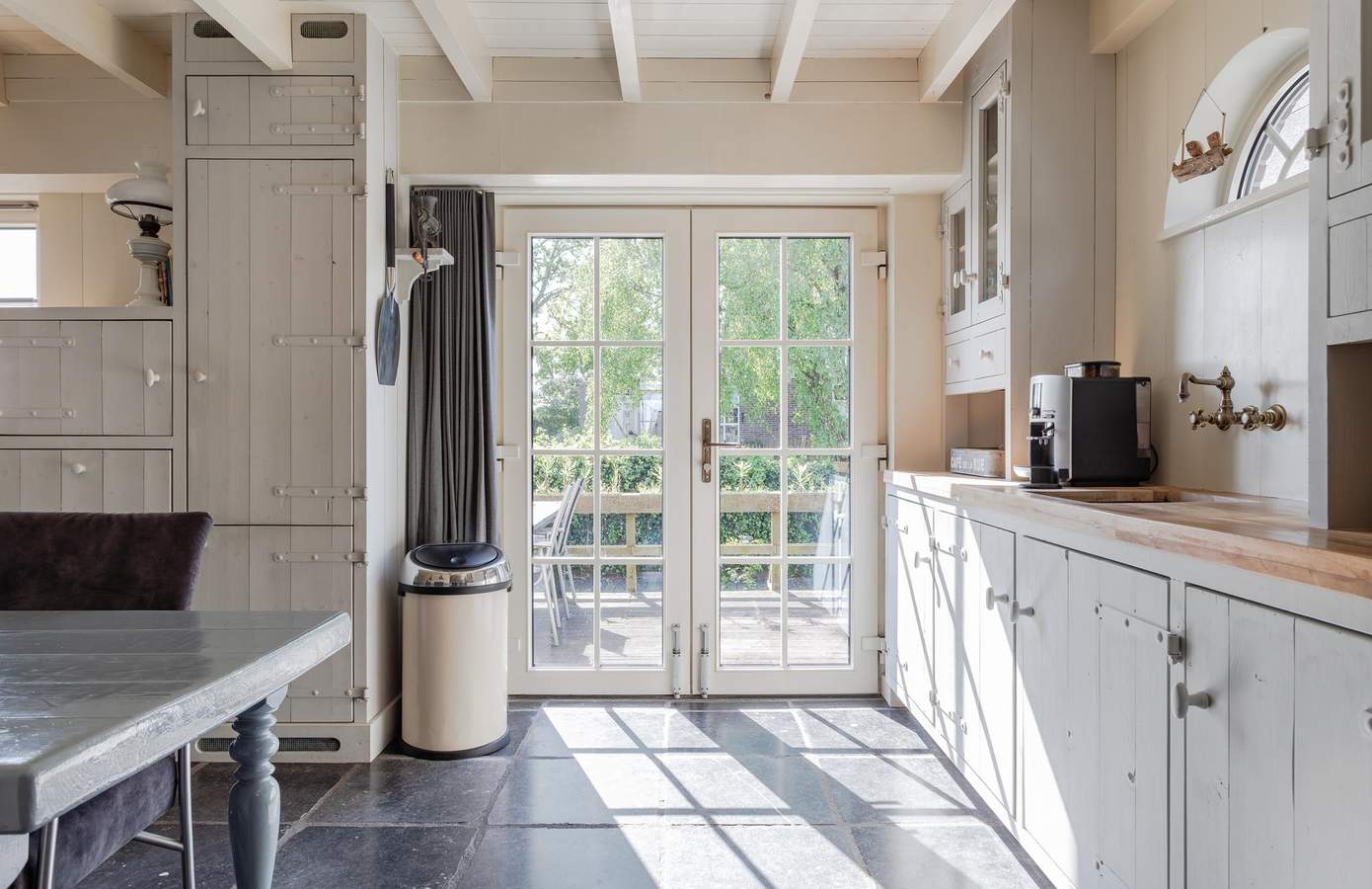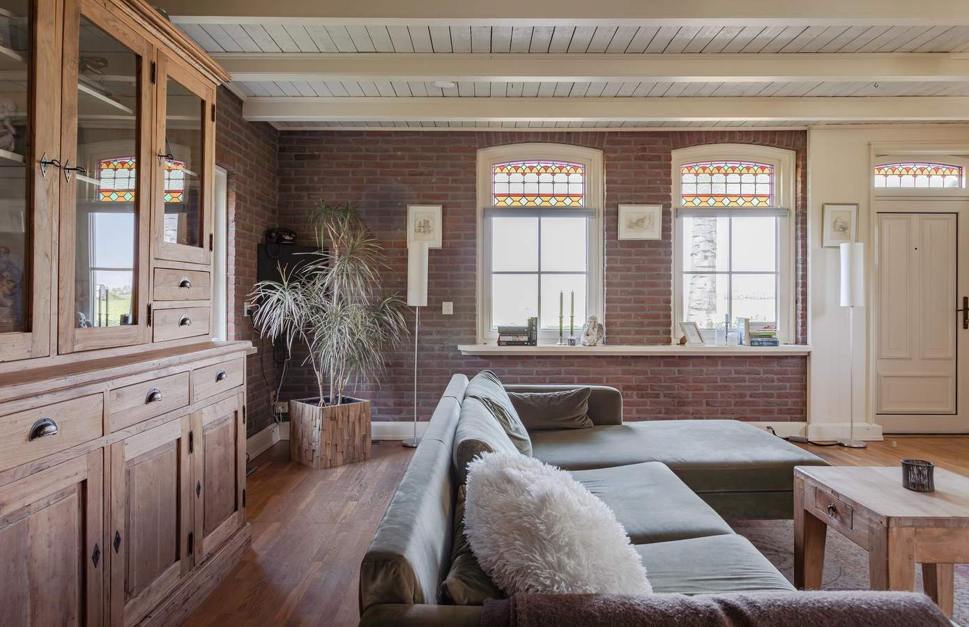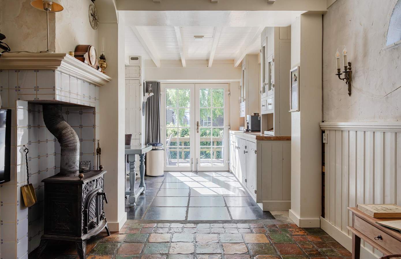 Bij binnenkomst via de entree proeft u direct de authentieke sfeer van de woning. De fraaie vloer met originele kerkdallen, gecombineerd met het zicht op diverse ruimtes, zet meteen de toon. Vanuit de hal heeft u toegang tot de inpandige garage, de woonkeuken, de woonkamer én de trap naar boven. De woonkamer straalt karakter en sfeer uit dankzij het authentieke balkenplafond, de houten wandafwerking en sfeervolle glas-in-loodramen. Centraal in de kamer staat de schouw, met aan de ene kant een boekenkast en aan de andere kant een sfeervolle pelletkachel. De woonkeuken vormt het hart van het huis. Met zijn landelijke uitstraling is dit een plek waar iedere kookliefhebber zijn hart kan ophalen. Voorzien van een Boretti-gasfornuis, een vaatwasmachine op hoogte, twee close-in boilers, een teakhouten werkblad en openslaande deuren naar het verhoogde terras aan het water.
