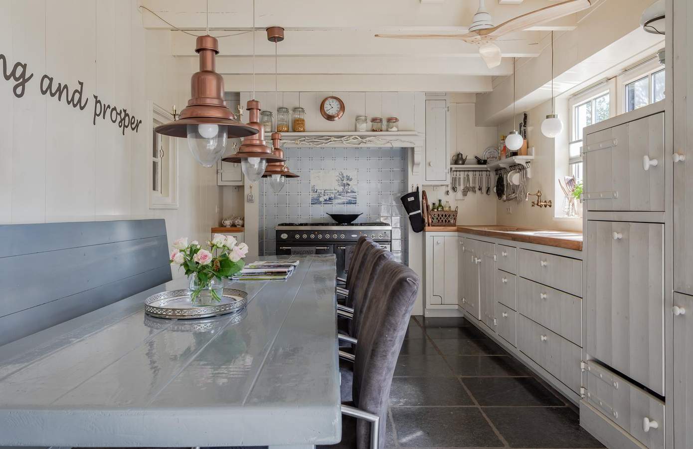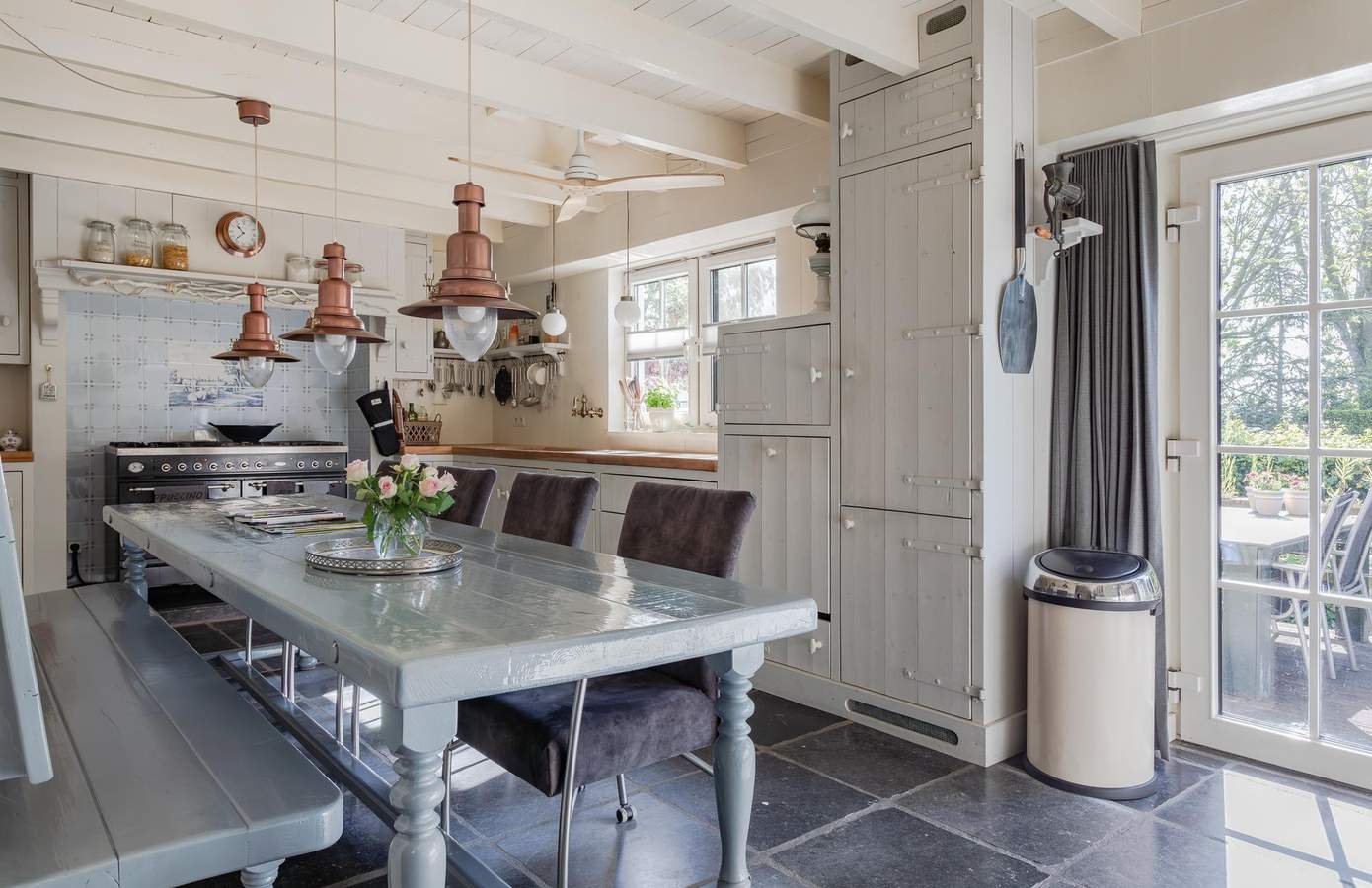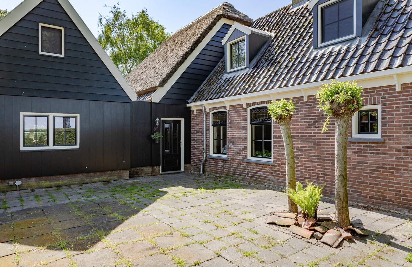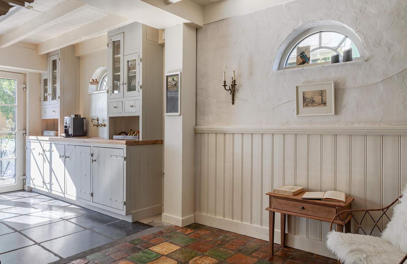 Bij binnenkomst via de entree proeft u direct de authentieke sfeer van de woning. De fraaie vloer met originele kerkdallen, gecombineerd met het zicht op diverse ruimtes, zet meteen de toon. Vanuit de hal heeft u toegang tot de inpandige garage, de woonkeuken, de woonkamer én de trap naar boven. De woonkamer straalt karakter en sfeer uit dankzij het authentieke balkenplafond, de houten wandafwerking en sfeervolle glas-in-loodramen. Centraal in de kamer staat de schouw, met aan de ene kant een boekenkast en aan de andere kant een sfeervolle pelletkachel. De woonkeuken vormt het hart van het huis. Met zijn landelijke uitstraling is dit een plek waar iedere kookliefhebber zijn hart kan ophalen. Voorzien van een Boretti-gasfornuis, een vaatwasmachine op hoogte, twee close-in boilers, een teakhouten werkblad en openslaande deuren naar het verhoogde terras aan het water.