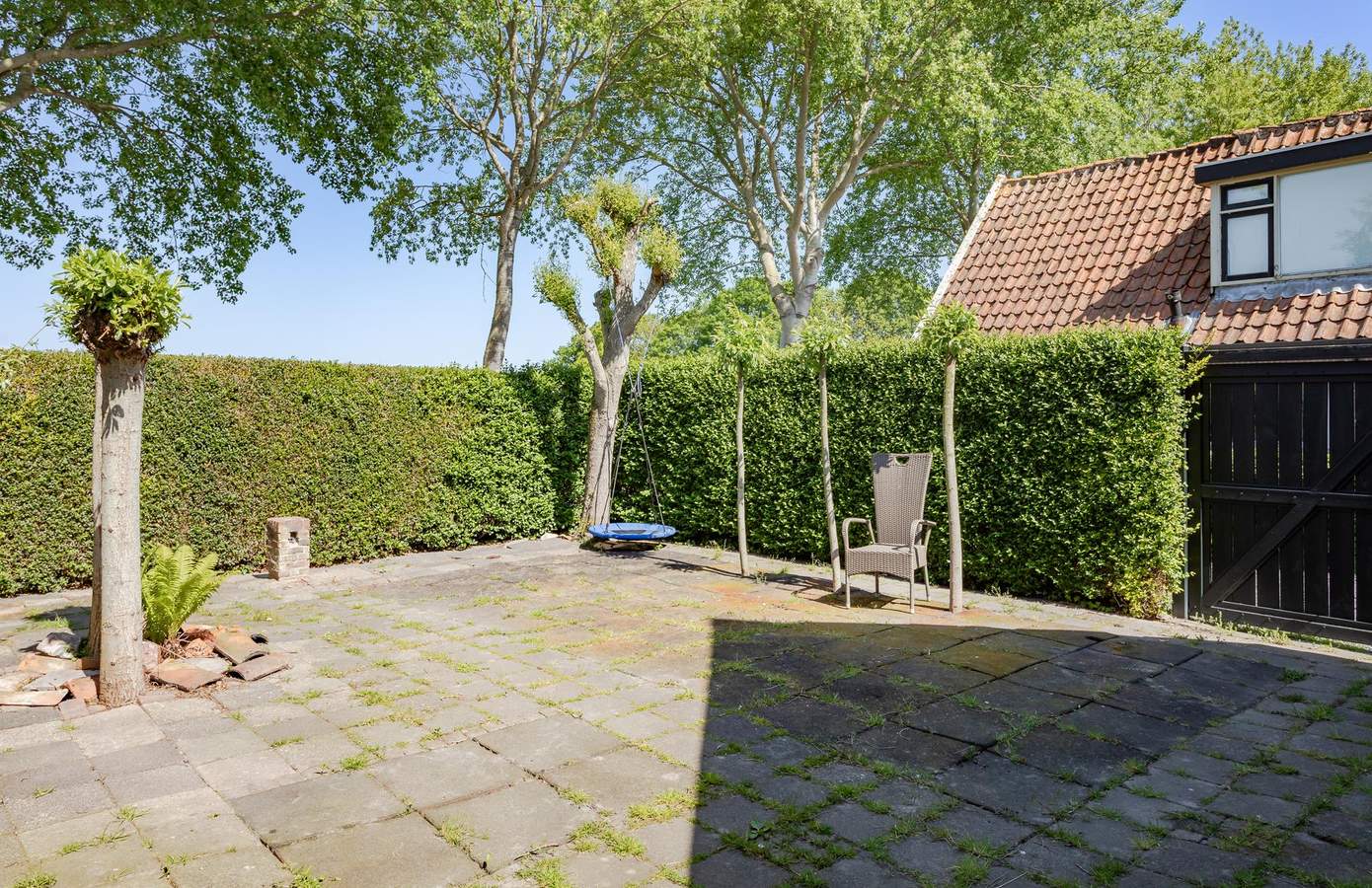 De zijtuin bevindt zich tussen de woning en de garage. Deze onderhoudsvrije tuin is omsloten door een groene heg, wat zorgt voor optimale privacy. Een fijne plek om een leuke zitplek te creëren of een veilige speelruimte voor kinderen in te richten.