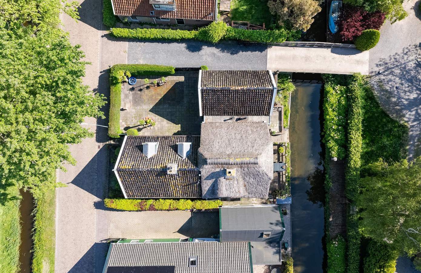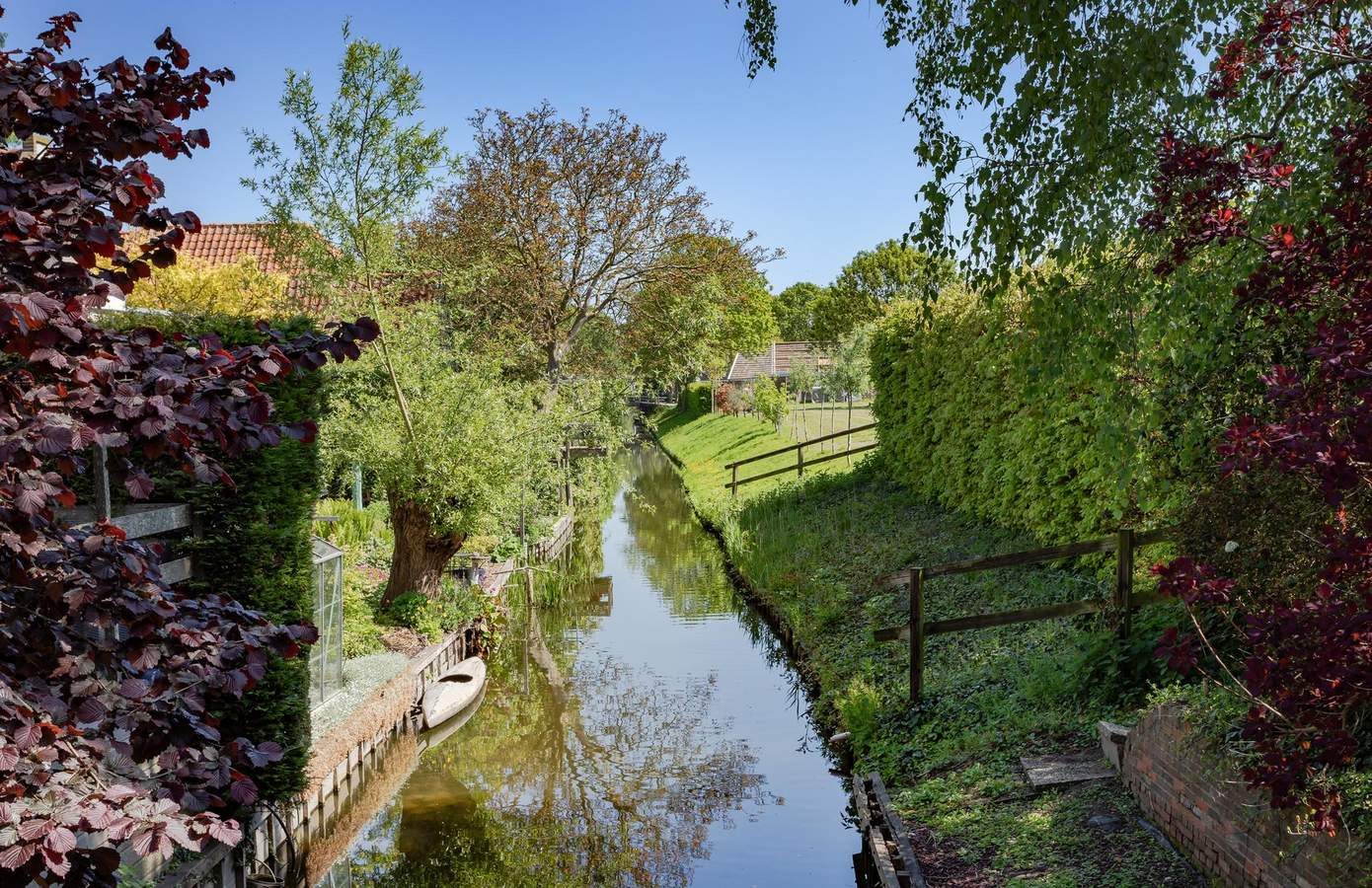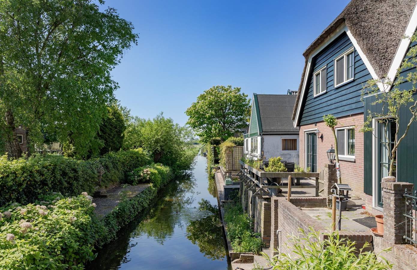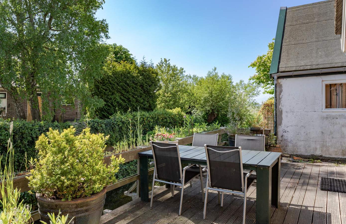 De achtertuin ligt direct aan vaarwater en biedt een prachtig uitzicht over de dorpssloot. Vanuit de keuken stapt u zo op het verhoogde vlonderterras, gelegen op het zonnige zuidoosten. Hier geniet u de hele dag van de zon. Via een trap loopt u naar de lager gelegen vlonder, waar u zo in uw bootje kunt stappen voor een tocht over het water.