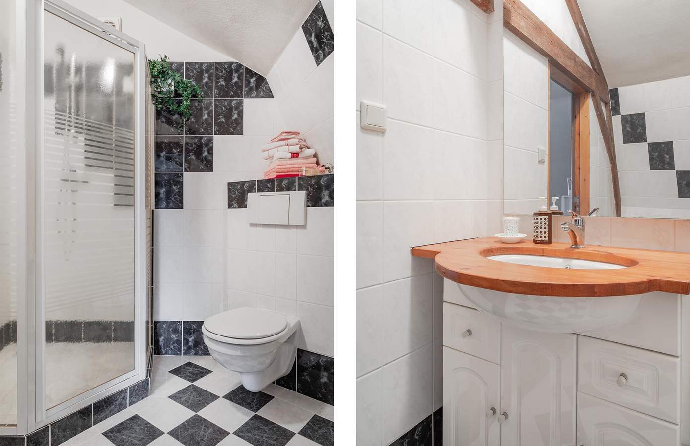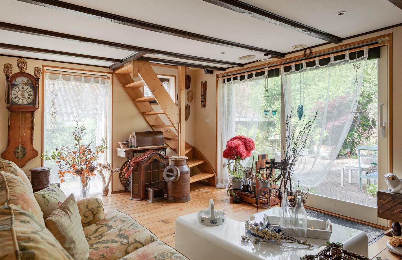 De entree bevindt zich aan de zijkant van de woning. Hier vindt u een hal met toilet en een praktische voorraad-/kelderkast. De lichte woonkamer, uitgebouwd in 2000 met een glasgevel aan de hele rechterzijkant, biedt een prachtig uitzicht over de omliggende landerijen met grazende koeien. De open haard en de sfeervolle schouw maken deze ruimte tot een knusse plek in alle seizoenen. De halfopen keuken is volledig uitgerust met inbouwapparatuur, waaronder een koelkast, vaatwasser, combi-oven, afzuigkap en keramische kookplaat. Op de eerste verdieping bevindt zich een royale hoofdslaapkamer met inbouwkasten en openslaande deuren naar een charmant Frans balkon. De en suite badkamer biedt pure ontspanning met een hoekligbad, douche, wastafel, toilet en vloerverwarming. Een tweede slaapkamer, ideaal als logeerkamer of kantoor, completeert deze verdieping. Voor extra opbergruimte is er een vliering over de volledige lengte van het huis, bereikbaar via een schuiftrap.
