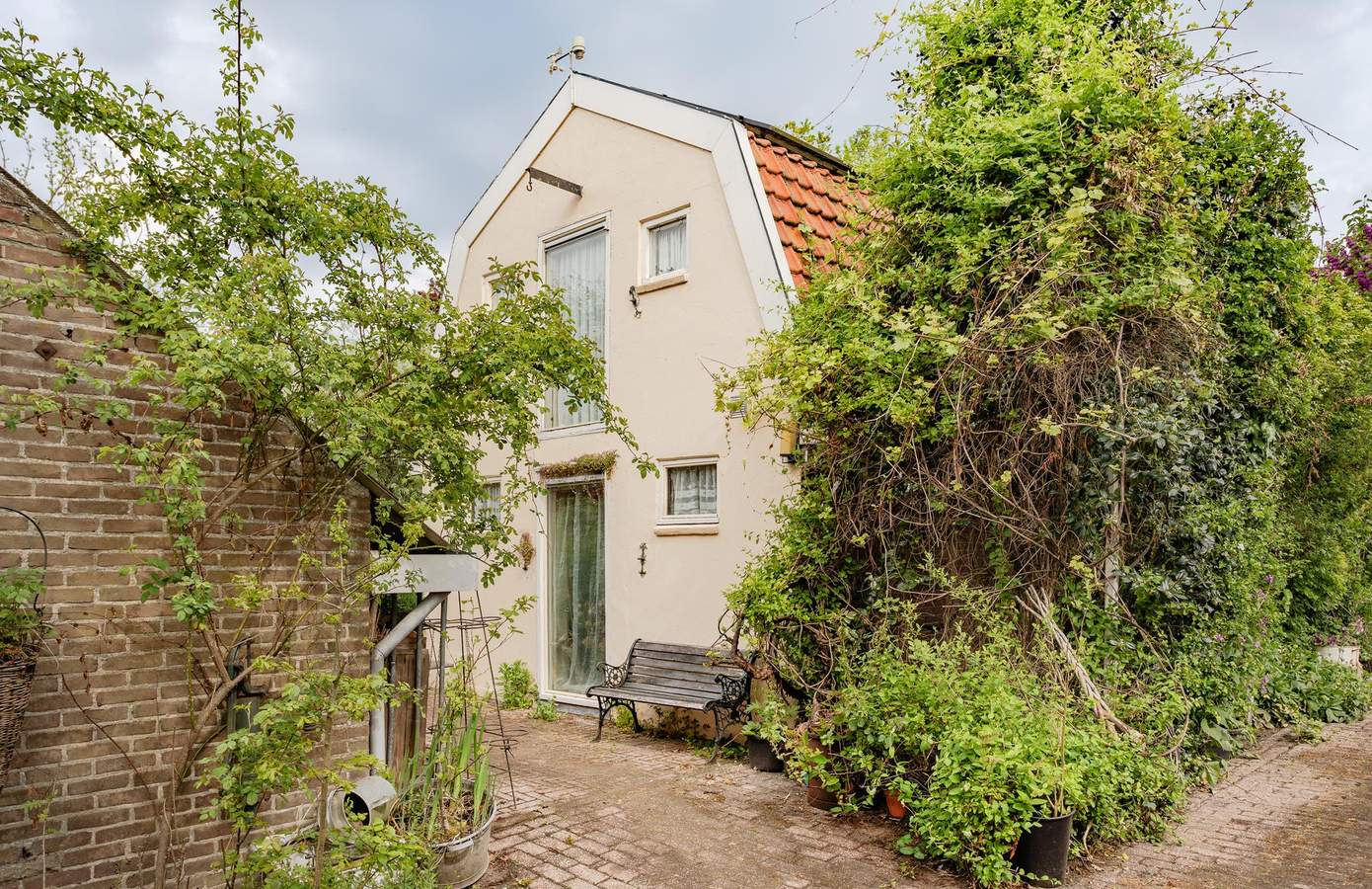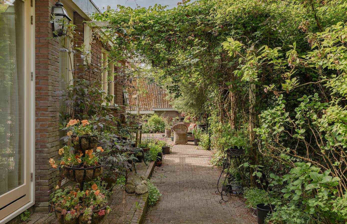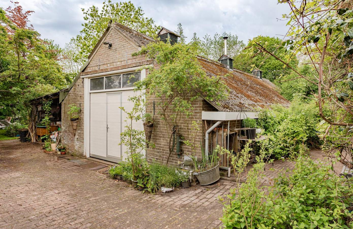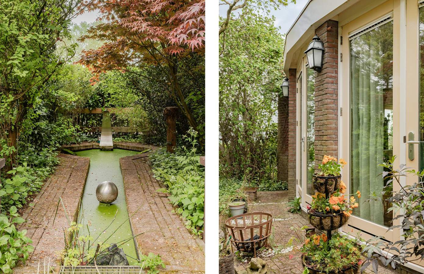 De tuin heeft aan de rechterkant een sfeervolle waterloop. Er is genoeg plek om van de zon te genieten, maar ook van de schaduw door de aanwezige bomen. Achter de woning staat een grote schuur met overheaddeur en krachtstroom, ideaal voor hobby’s of opslag. De schuur is een voormalige aardappel-/koolschuur, gebouwd om 1930. Het is de enige schuur in de omgeving die nog in originele staat is en deze komt in aanmerking om op de monumentenlijst geplaatst te worden en te profiteren van subsidies voor onderhoud (de huidige eigenaren hebben hier geen gebruik van gemaakt).