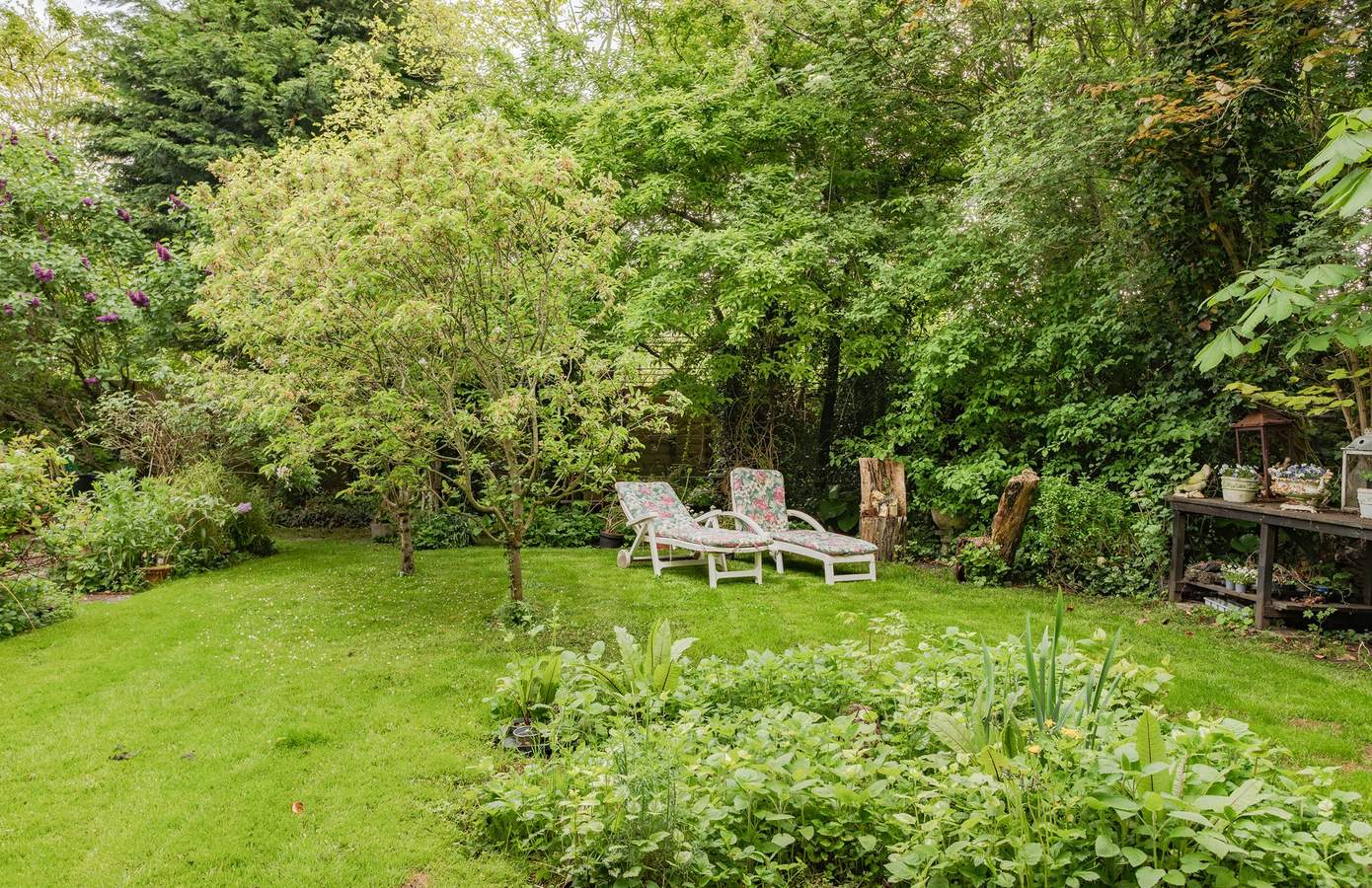 De tuin loopt achter de schuur nog verder door tot aan de sloot, wat extra privacy en vrijheid biedt.