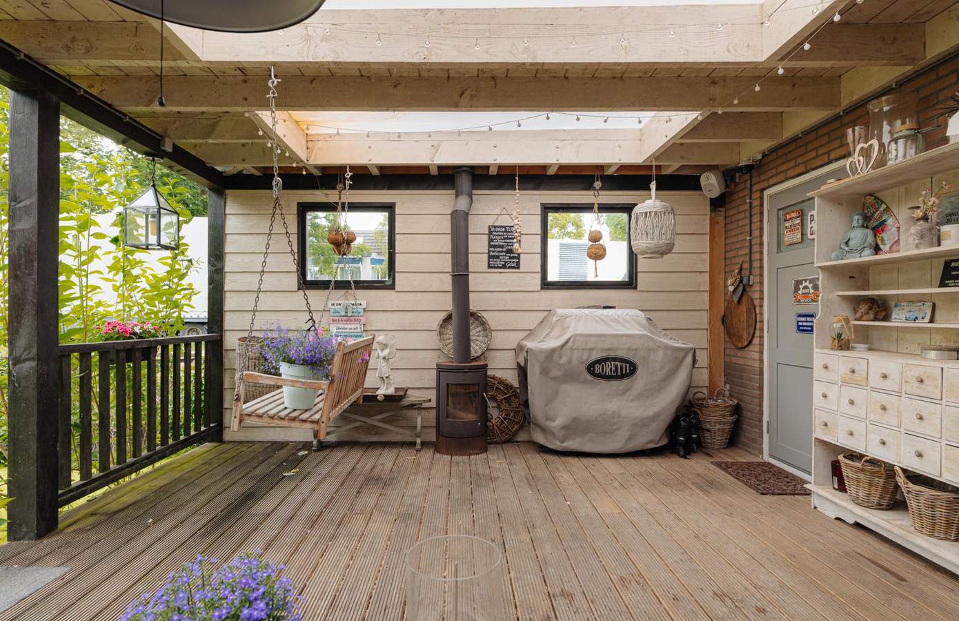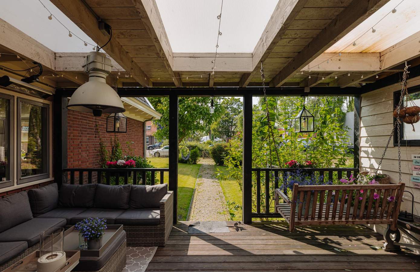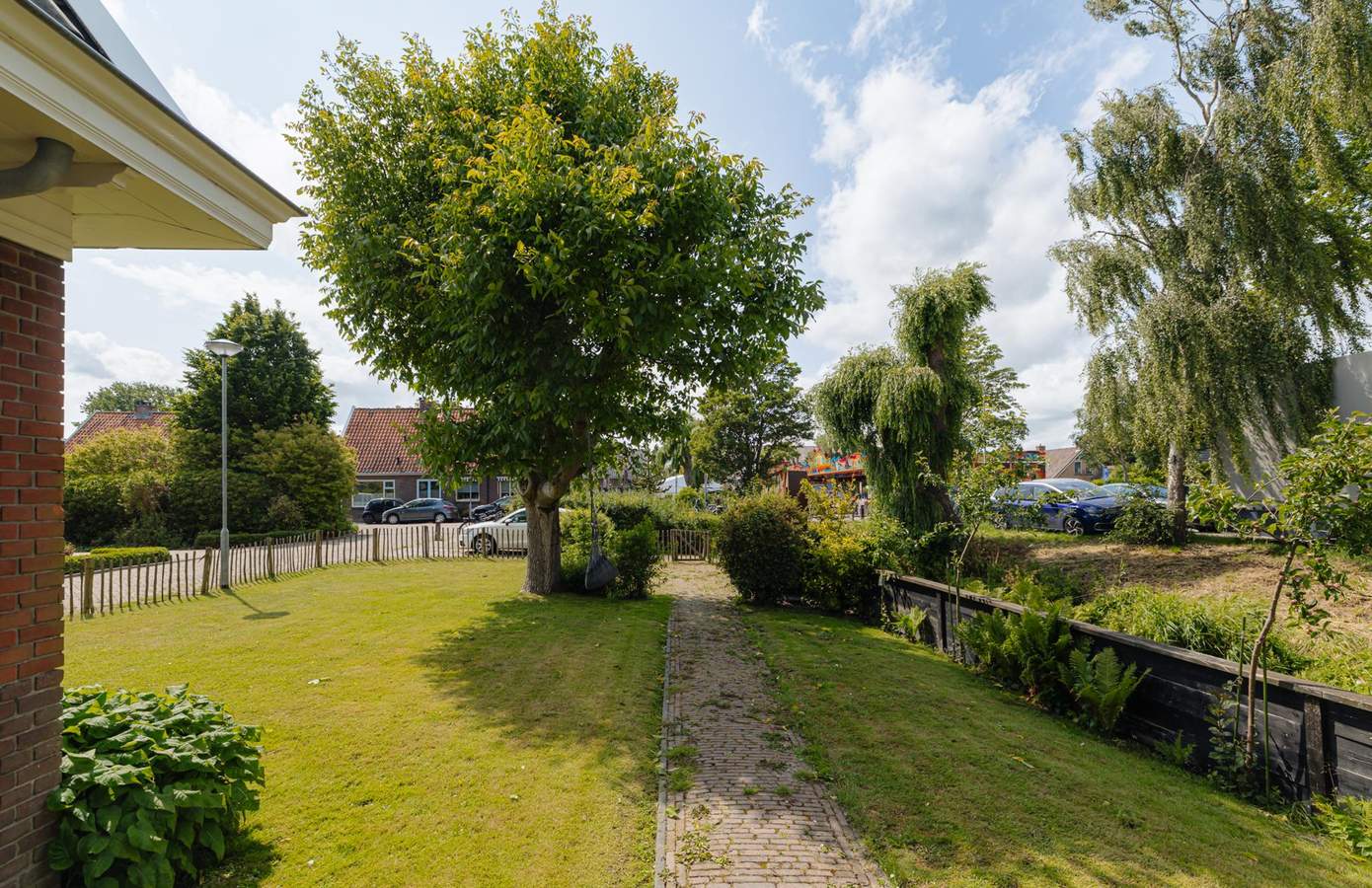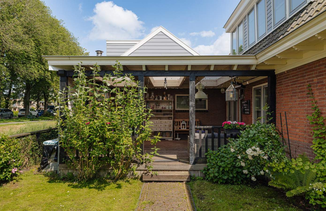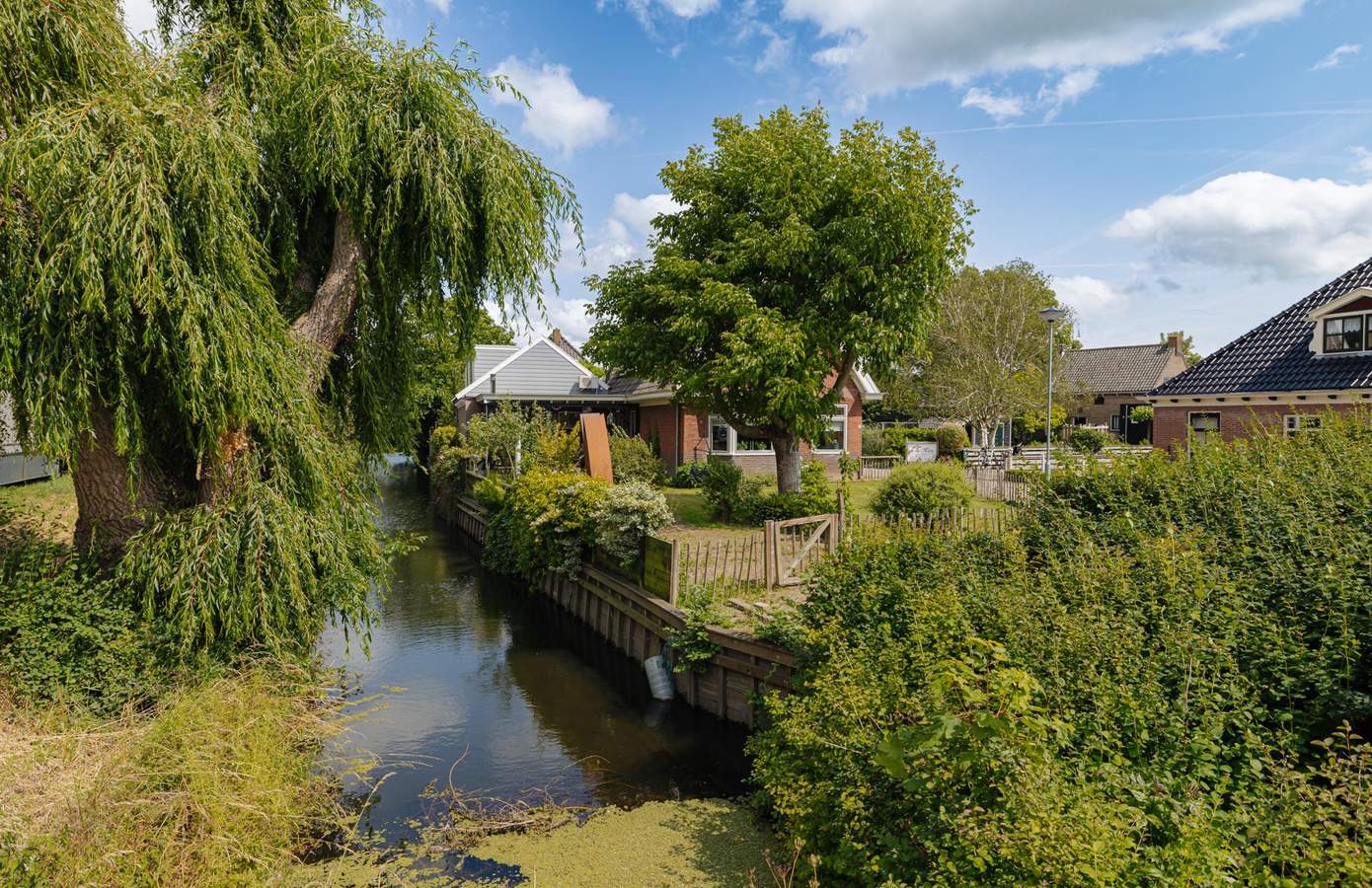 Rondom de woning ligt een keurig aangelegde tuin, met veel groen en een fijne veranda. De ligging aan het water aan de zijkant zorgt voor een gevoel van vrijheid. De ruime oprit schuin achter de woning biedt voldoende parkeergelegenheid op eigen terrein.