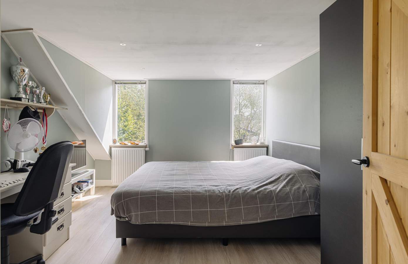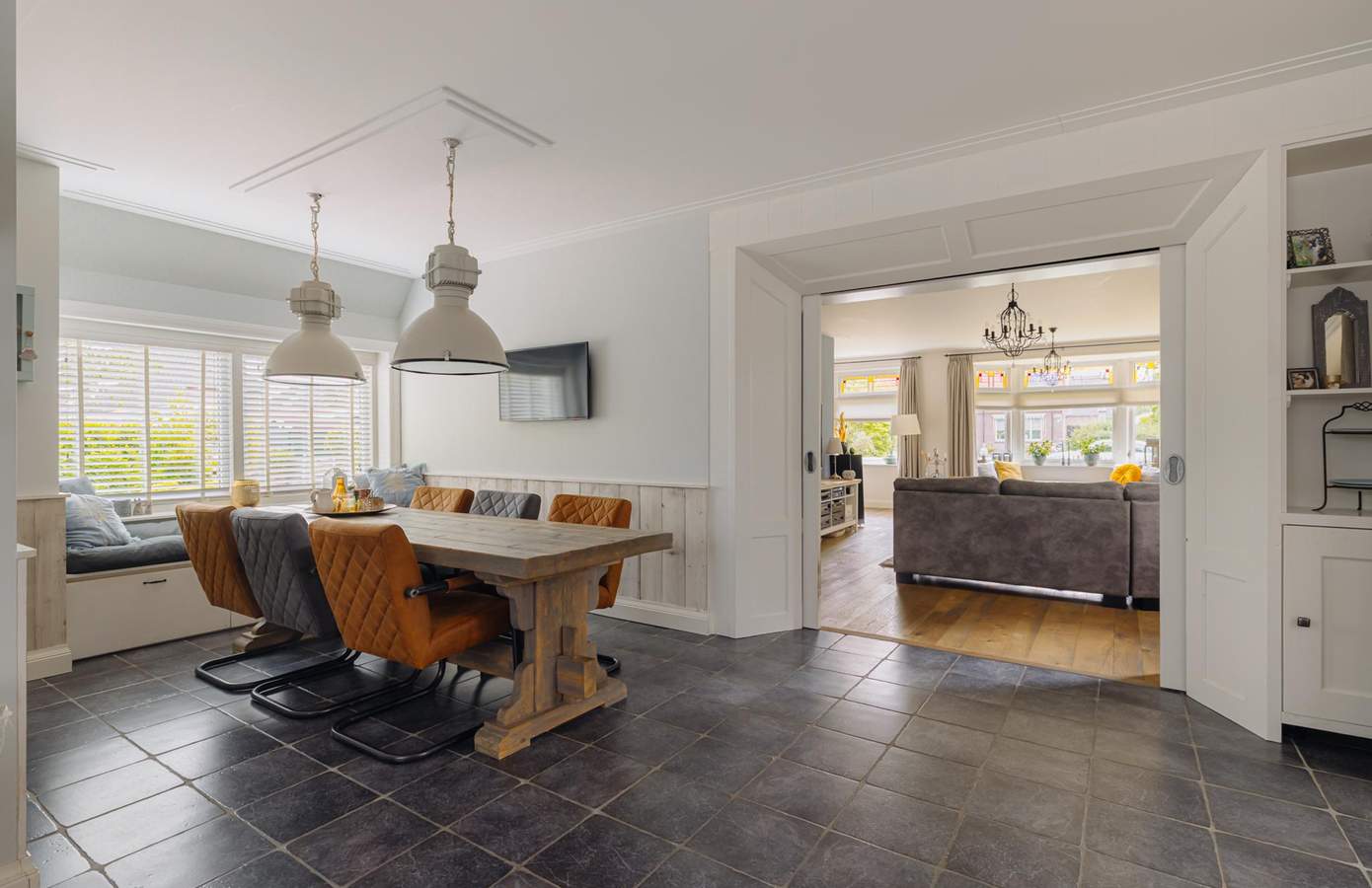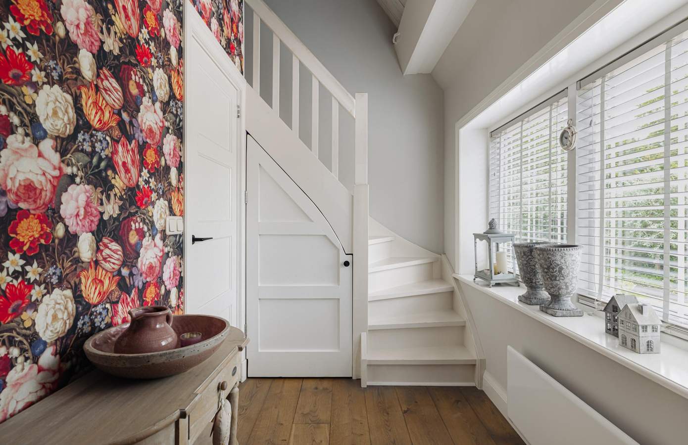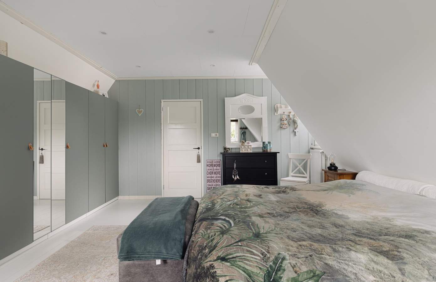 Binnen treft u een sfeervol interieur dat perfect aansluit bij de jaren ’30 stijl. De woonkamer ademt gezelligheid met houten vloeren, paneeldeuren en prachtige glas-in-loodramen bovenin de erker. De zitvensterbank bij het voorraam is een geliefde plek. In de grote landelijke woonkeuken met authentiek fornuis en royale opstelling kookt u met plezier. Zowel de begane grond vloer als de badkamer zijn voorzien van comfortabele vloerverwarming. Op de eerste verdieping van het woonhuis bevinden zich in totaal drie slaapkamers, waaronder een bijzonder charmante kamer met een echte bedstede: een knipoog naar vroeger, perfect als kinderkamer of logeerplek. De slaapkamer aan de achterzijde van de woning is zeer ruim te noemen, met een grote kastenwand is hier veel ruimte om uw kleding op te bergen. De badkamer straalt rust en karakter uit met lichte houten wanden, een robuust wastafelmeubel en koperen wandkraan. De inloopdouche heeft antraciet tegelwerk en de vloerverwarming onder de donkere plavuizen maakt het comfort compleet. Een fijne plek om de dag ontspannen te beginnen of af te sluiten. Via een praktische ladder bereikt u de dubbele vliering.